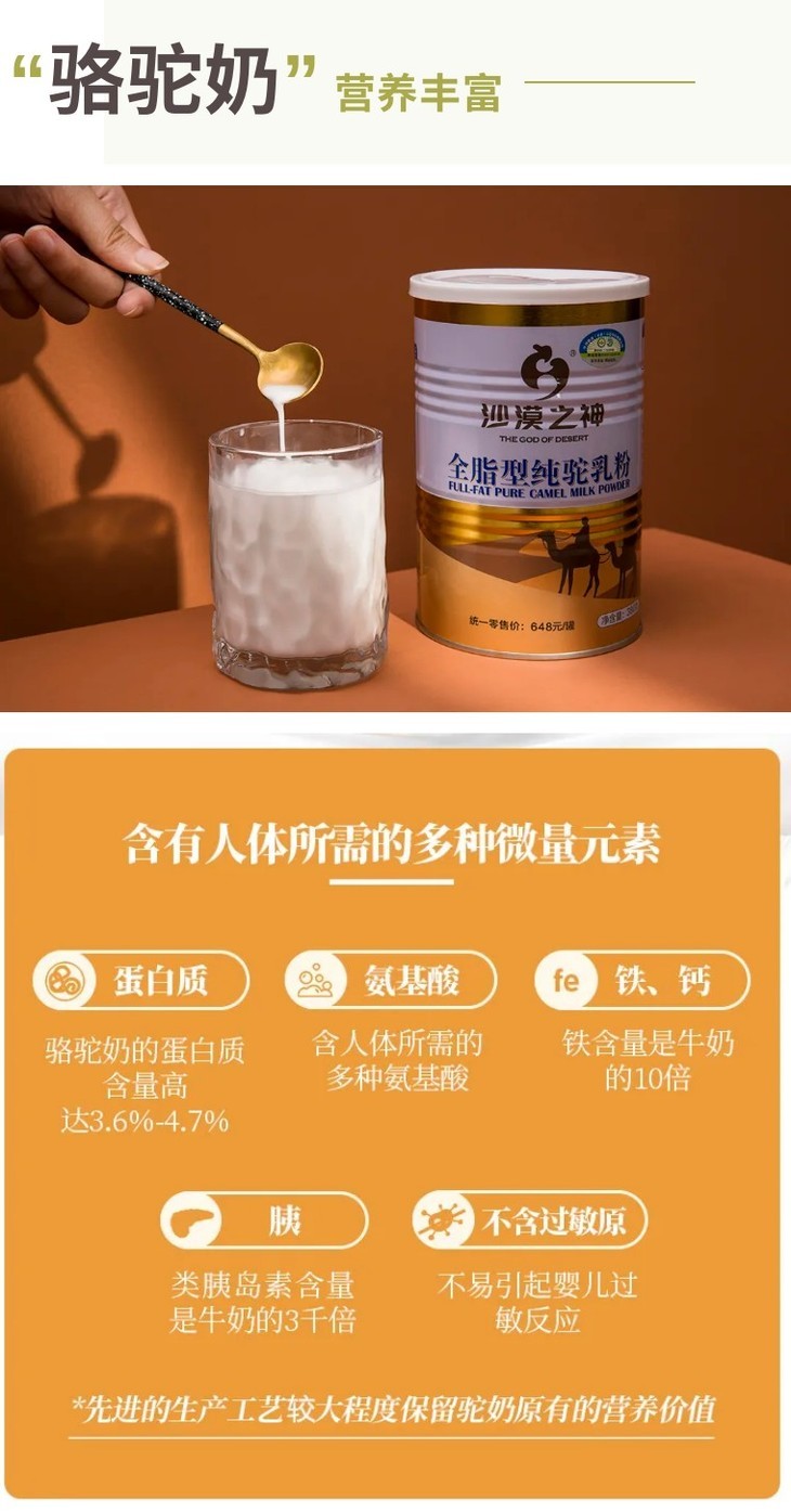 被称为“长寿奶”的沙漠之神全脂纯驼ru粉 有几认证双峰驼奶粉 纯驼奶粉 低温干燥喷粉啭力技术 wu忝加 富含多种微量元素 口感醇香 没有奶膻味 适合全家老小 孕F也可放心食用
