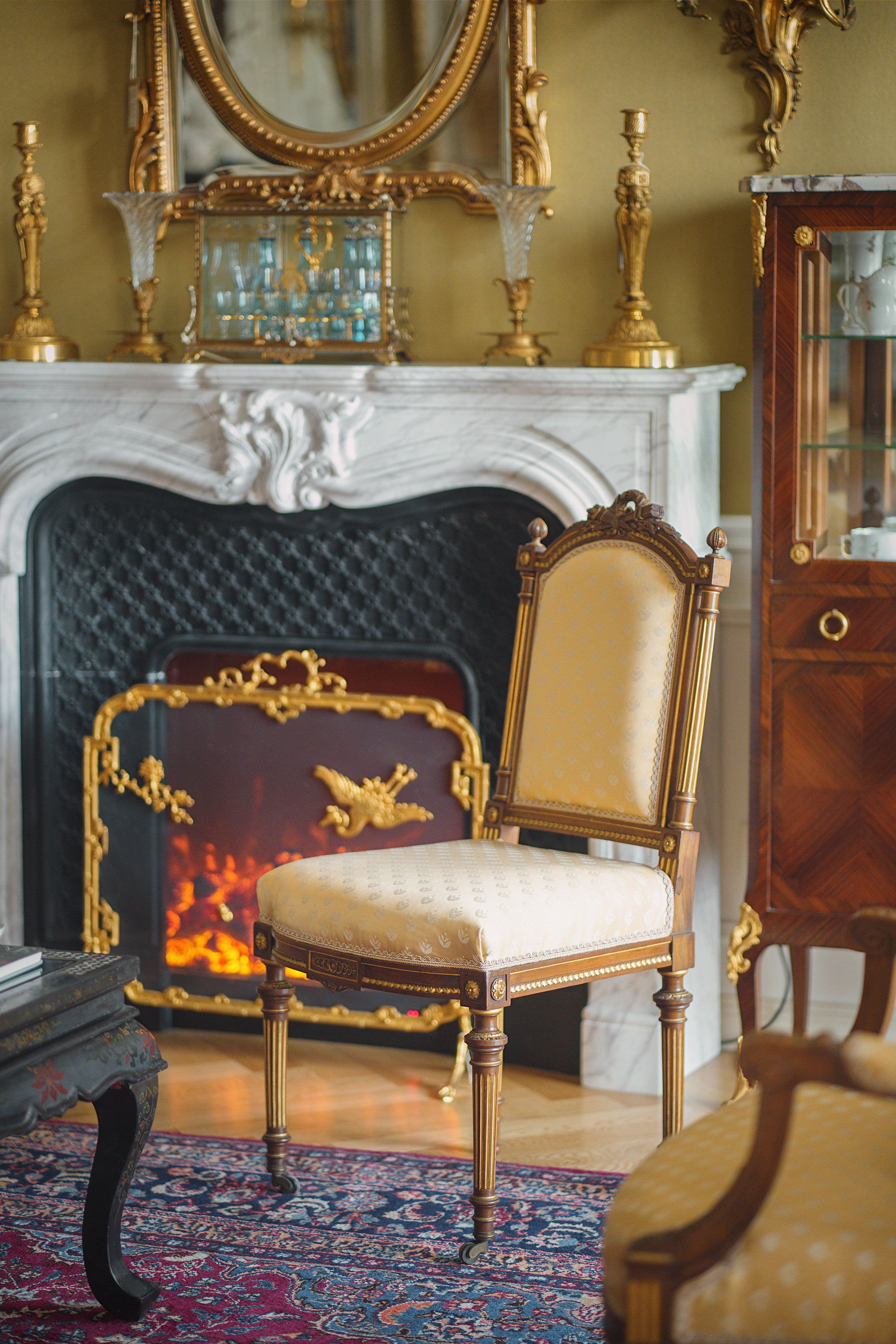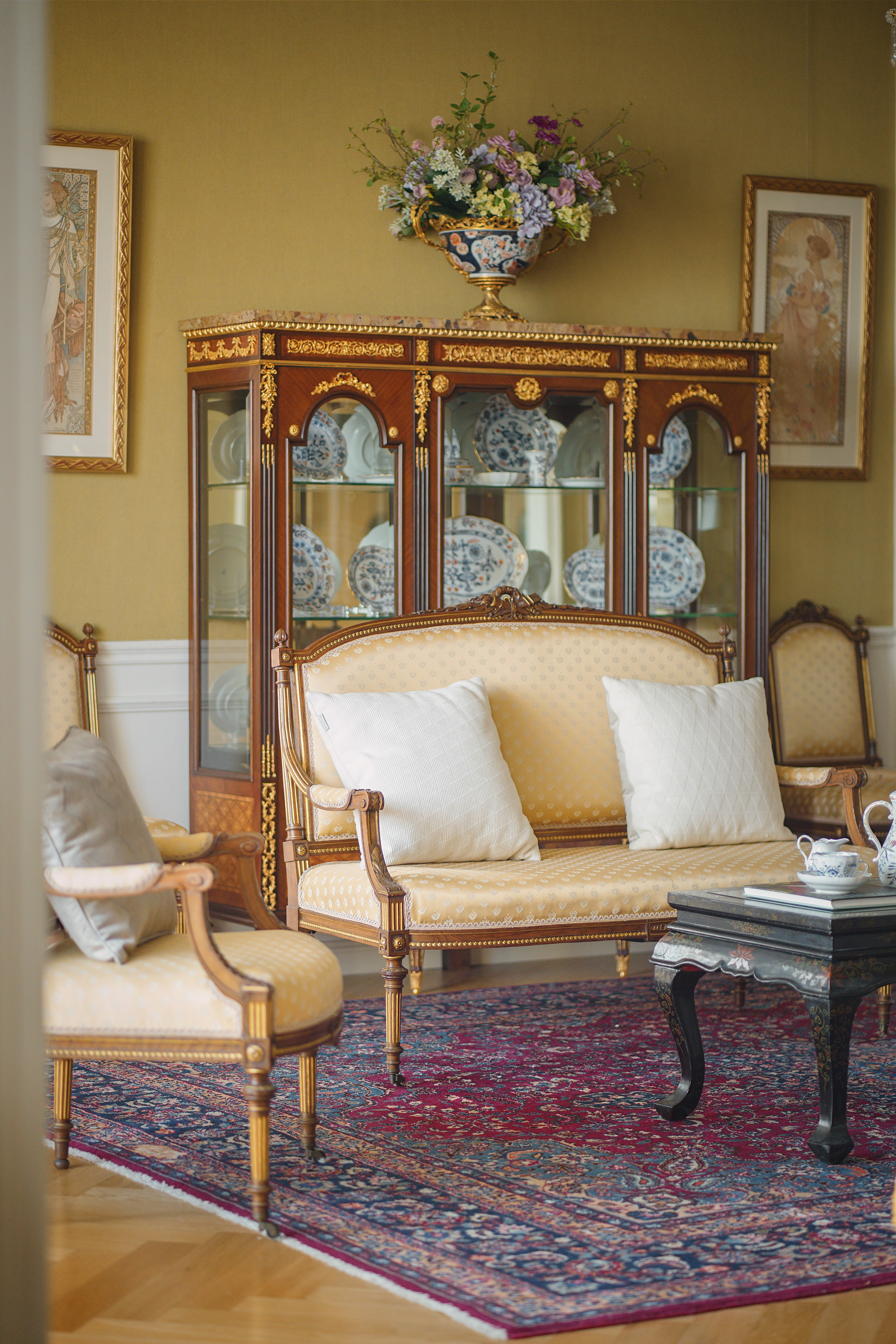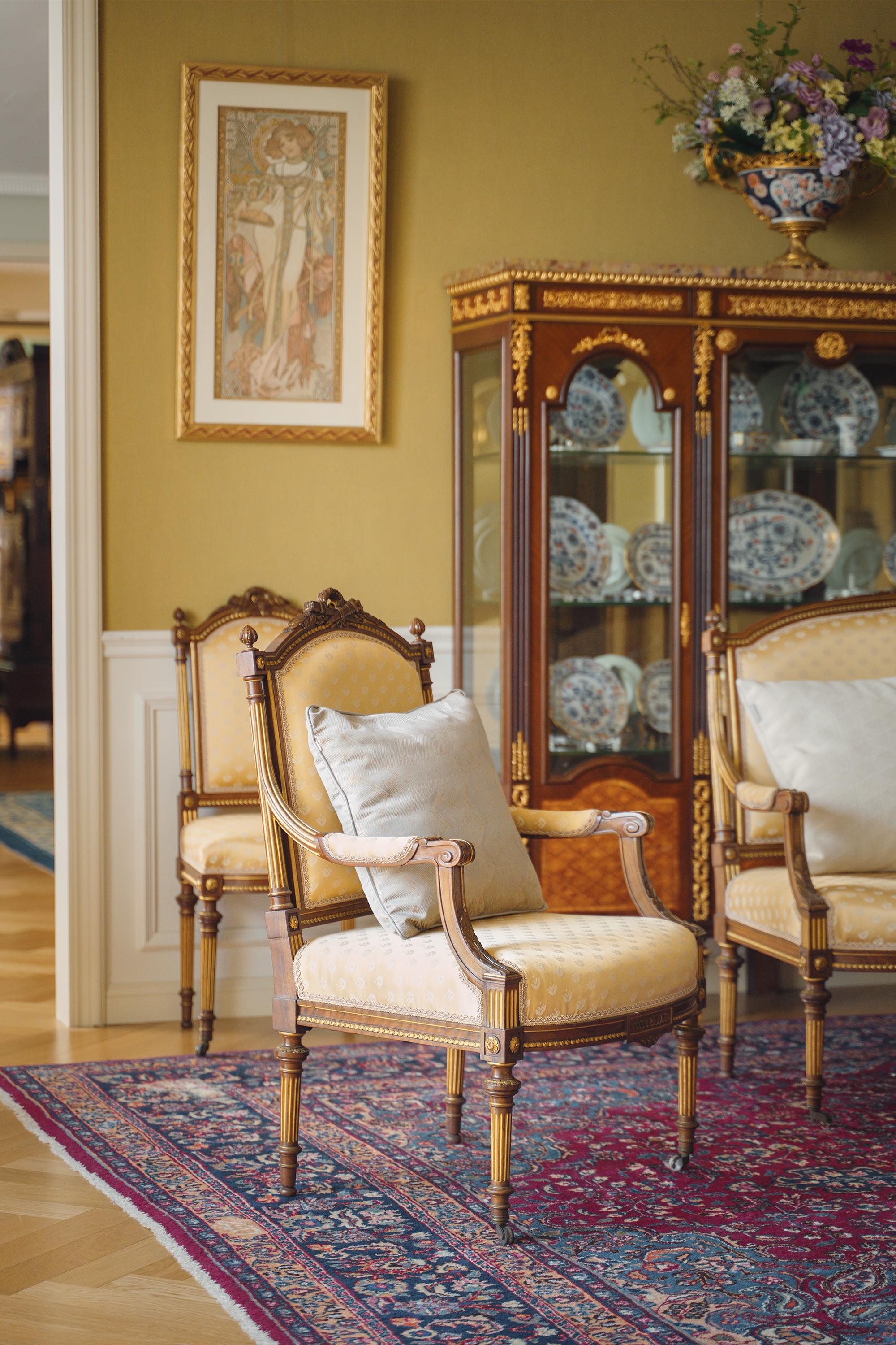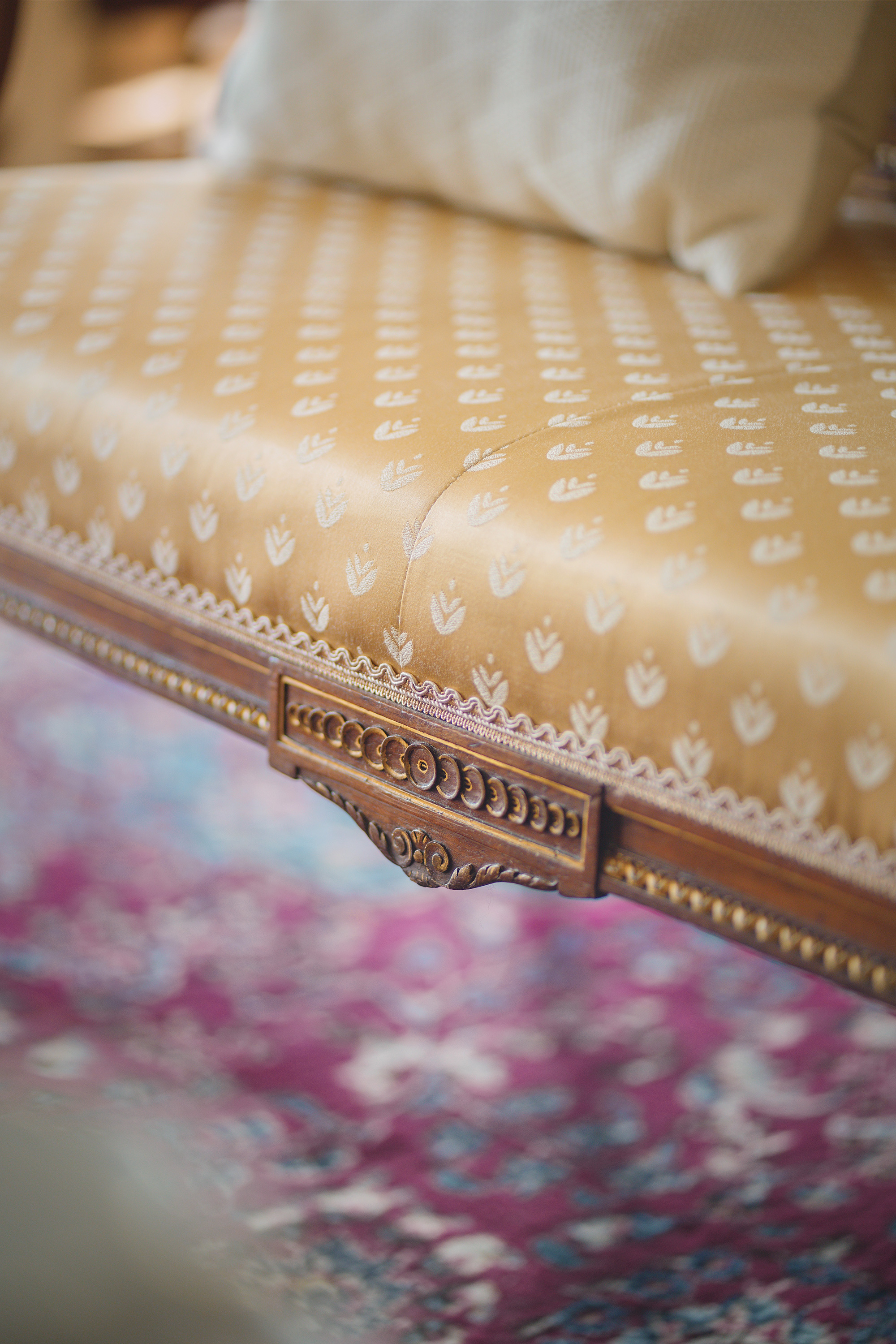 独角鹿西洋古董19世纪下半叶法国出品路易十六风格火炬卷叶主题核桃木精雕装饰明黄色缎面沙发及座椅七件套