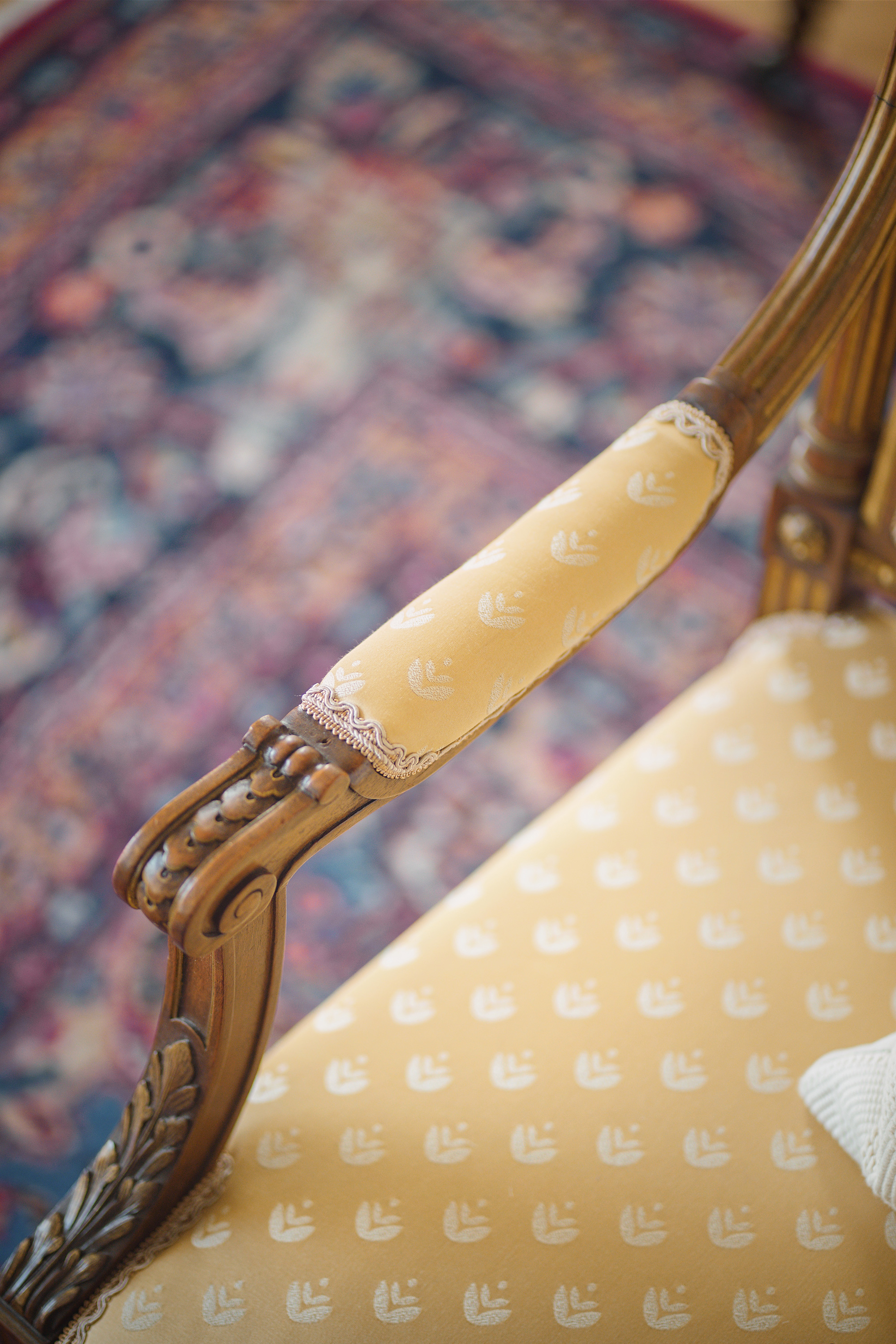 19世纪下半叶法国出品路易十六风格火炬卷叶主题核桃木精雕装饰明黄色缎面沙发及座椅七件套