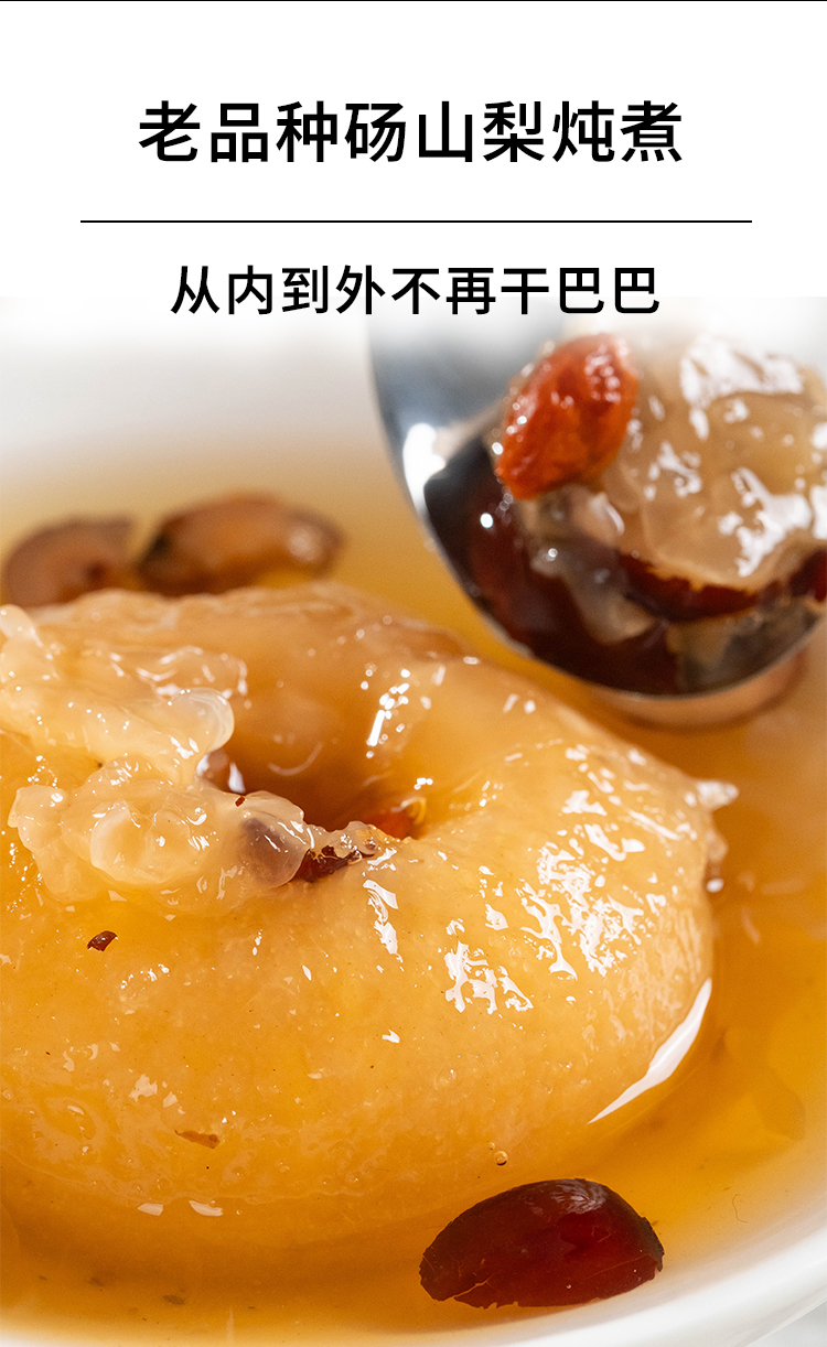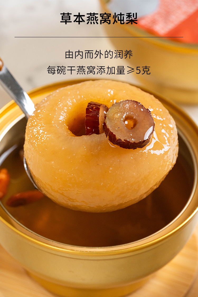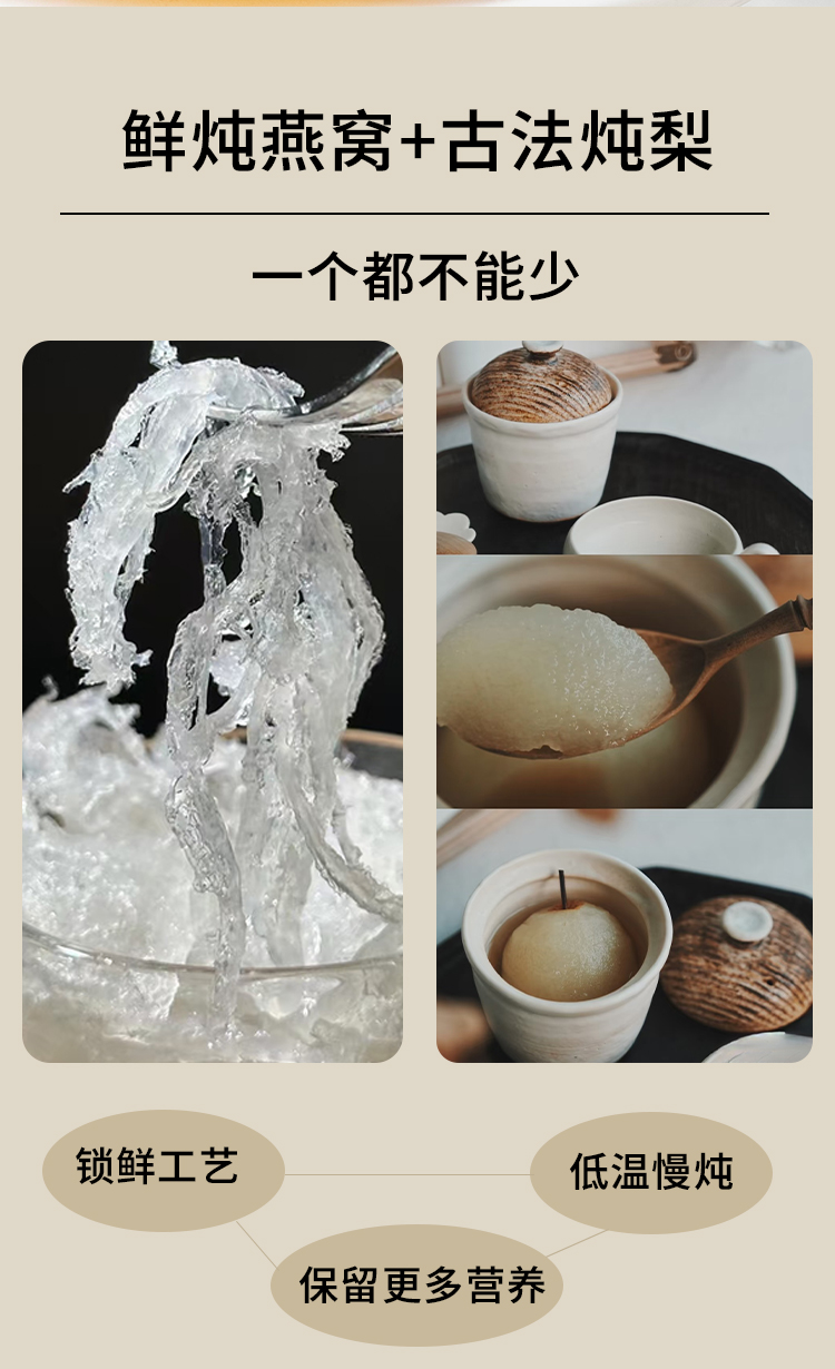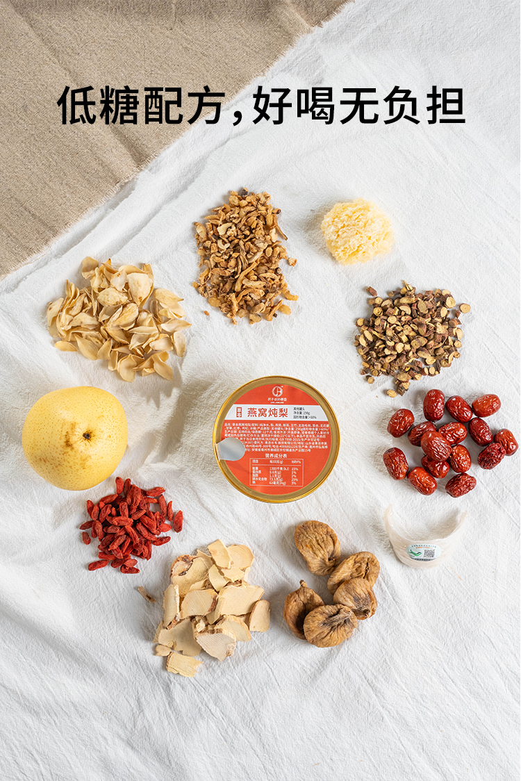 【配料】纯净水、梨、燕窝、银耳、玉竹、五指毛桃、百合、无花果、甘草、红枣、枸杞、冰糖