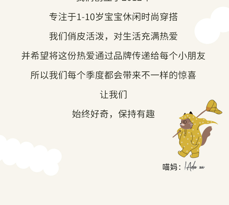 - Purrfect-Diary专注于贴近自然随性的穿着概念,轻奢平价的童装文化传播,在产品设计上更加注重婴童穿着的舒适性、安全性、更出众的国际化品牌,将欧美的育婴文化在中国进行深入的传播与推广。