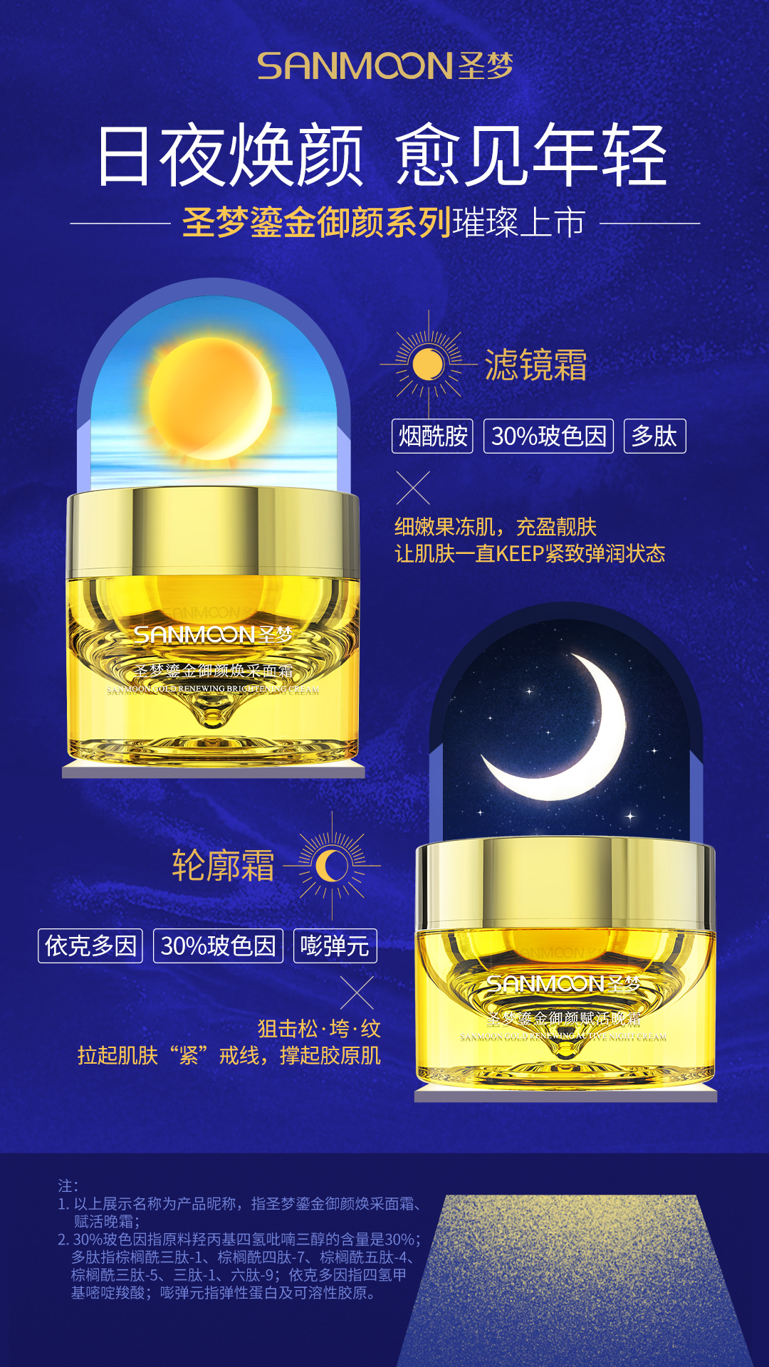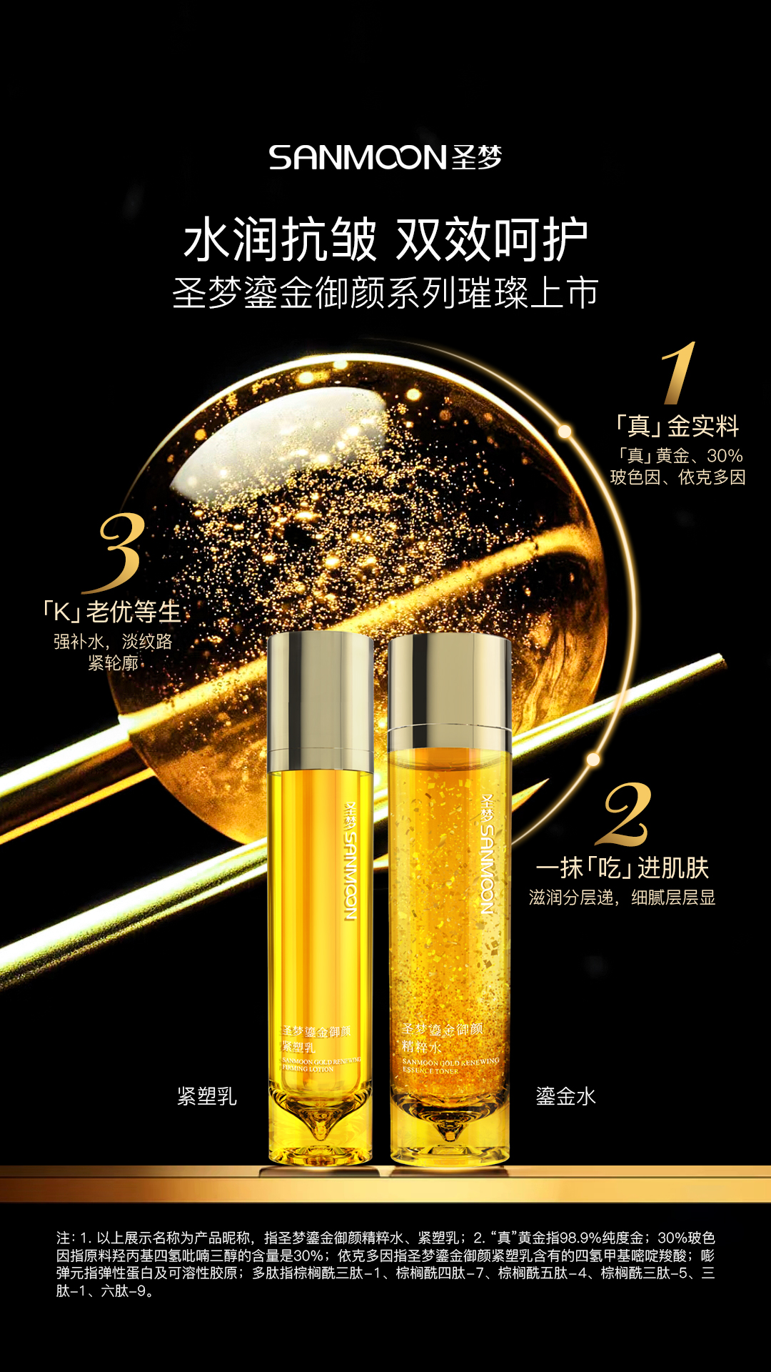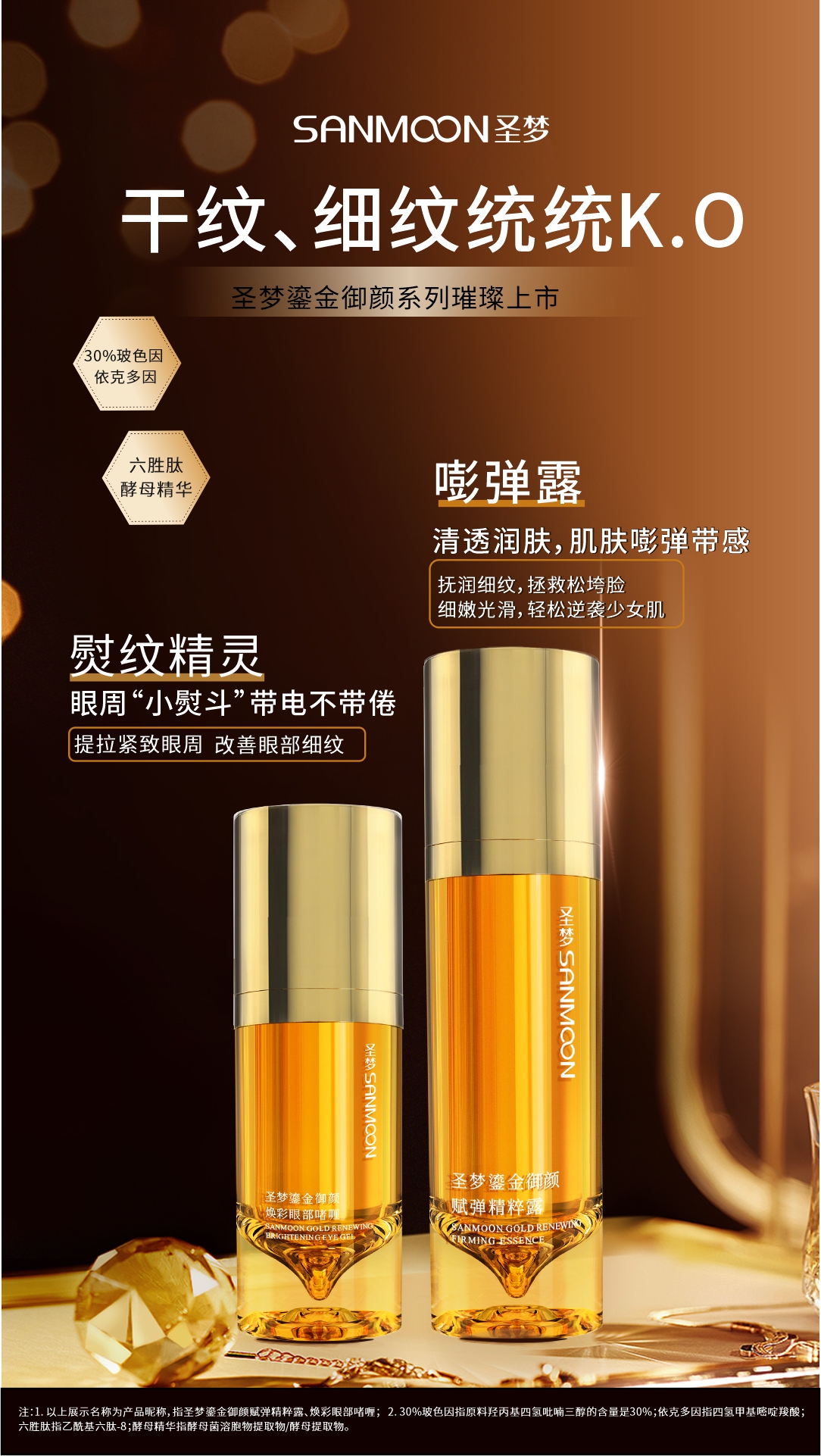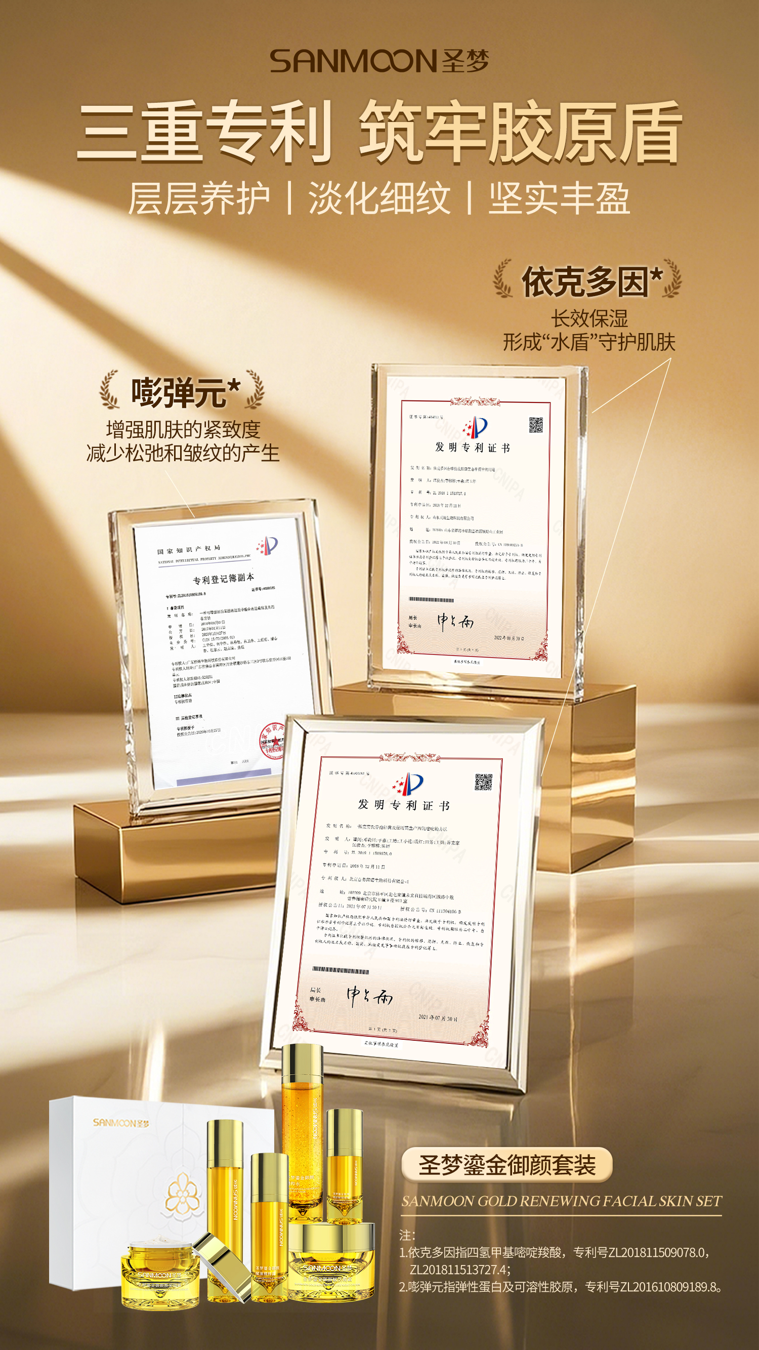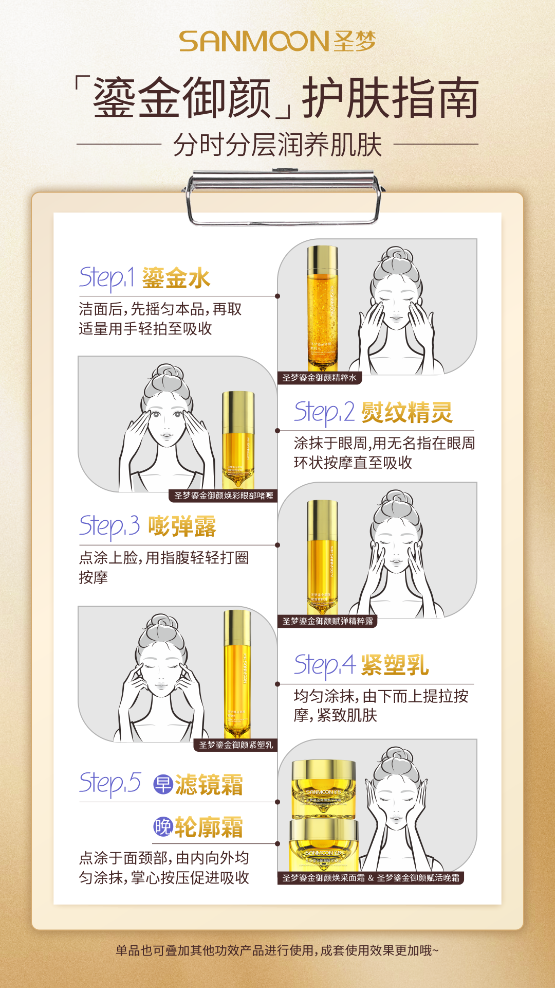 里面包含:圣梦鎏金御颜精粹水+圣梦鎏金御颜紧塑乳+圣梦鎏金御颜赋弹精粹露+圣梦鎏金御颜焕彩眼部啫喱+圣梦鎏金御颜焕采面霜+圣梦鎏金御颜赋活晚霜+白色礼盒