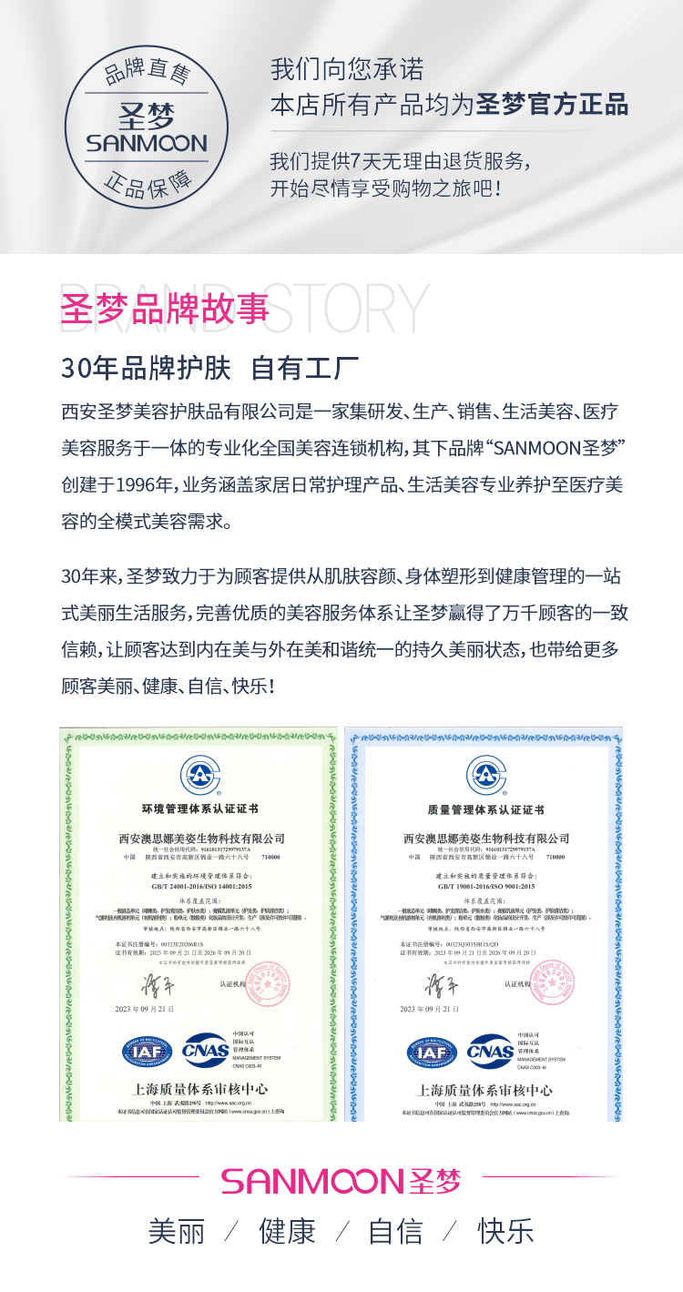 - 圣梦始终坚持以高品质的产品、标准化护肤流程真诚为每一位顾客服务,使顾客怀着愉悦的心情去体验美丽,印证了“美是肌肤、身体、心理的完美结合”。