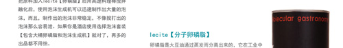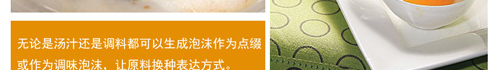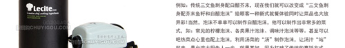 泡沫套装·泡沫生成机+卵磷脂·Lecite·分子美食原料,分子美食工具! 细磷脂小颗粒及粉,易溶于温水介质中,在液体中有很好的溶解性,可以轻松将油水融合成为整体。易发泡,望蛋清中加些卵磷 脂可以轻松获取到理想的蛋白糊,而且稳定性极强,因为它的特性,lecite能将果汁、白醋、鱼汤、调味汁等其它液体转化为泡沫状 。还能乳化其它你所能感到惊奇的材料。