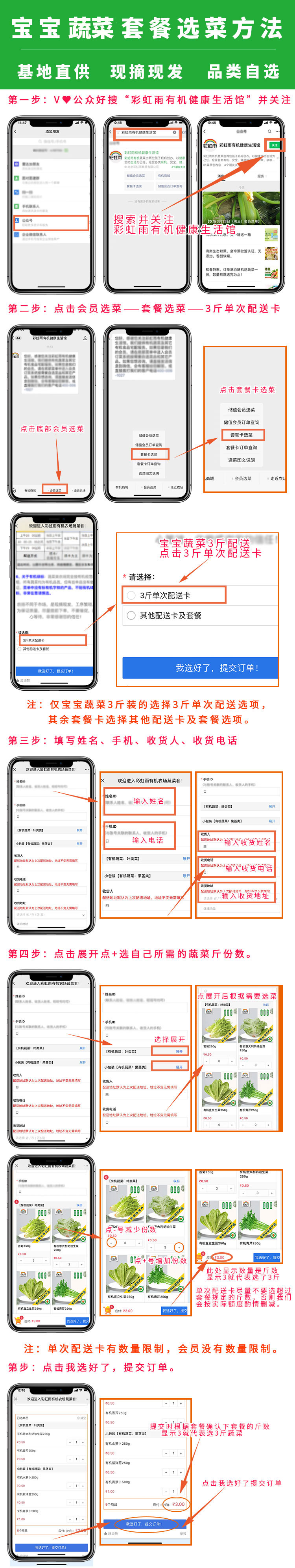 使用说明:如需农场搭配,直接选农场搭配拍下付款,农场会默认搭配3斤(3-6种)蔬菜。如需要自选菜品,拍自选,点击下图进入选菜系统自选。参考下面公众号自选订菜说明。