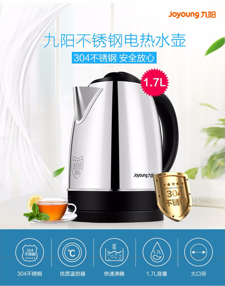 【全钢无锰】Joyoung/九阳JYK-17C15-C开水煲全钢电热水壶1.7升