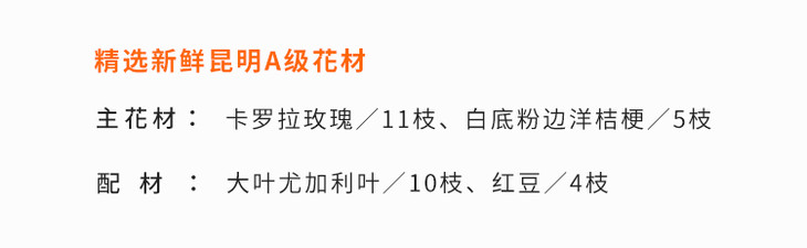 韩式花束系列:卡罗拉玫瑰11枝、白底粉边洋桔梗5枝(如白底粉边桔梗缺货,可用白色或浅粉色桔梗代替)、大叶尤加利10枝、4枝红豆