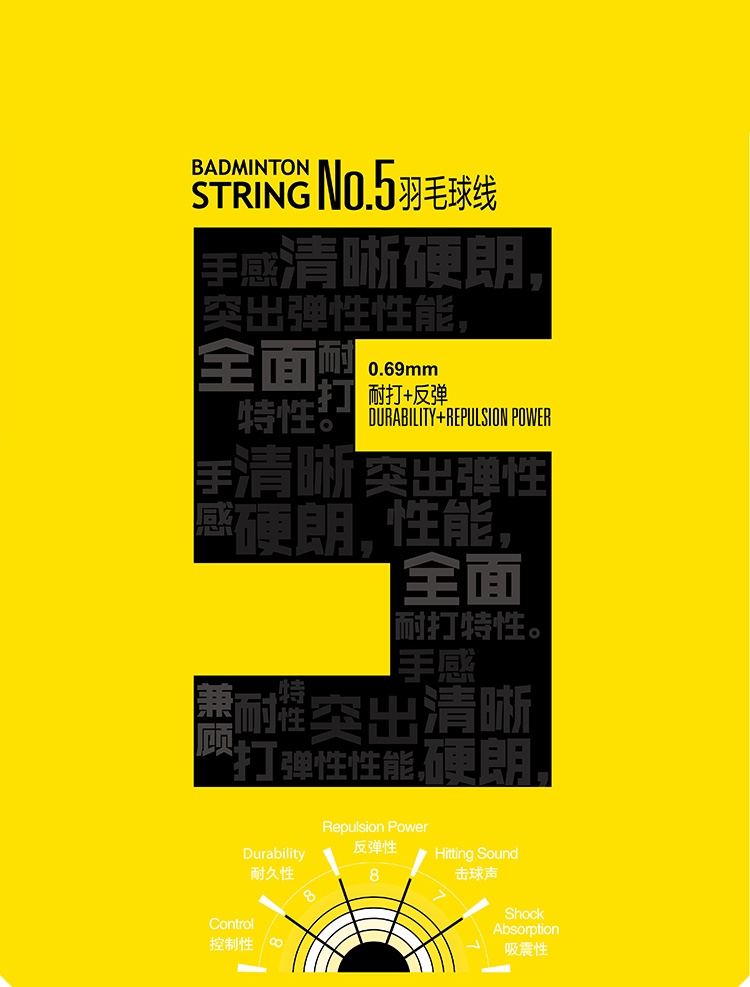 氢化钛复合涂层,保障耐久性的同时,有效提升反弹力。芯层和编织层均采用耐热高强力尼龙纤维,配合李宁独有的复合旋转(Multi-rotaion)编织工艺,试探性和耐打完美结合。