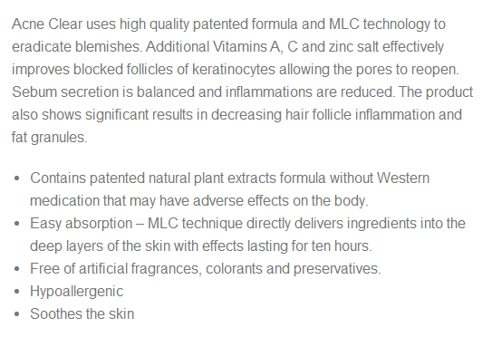 采用高品质专利袪痘配方及运用MLC技术,含维他命A、 C、Zinc salt等,有效改善被阻塞的毛囊正常角质化, 让毛孔重新打开, 并平衡油脂分泌预防炎症。同时对毛囊组织过敏与发炎及脂肪粒亦有特别明显之效果。