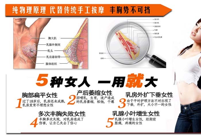 丰胸原理:以非常直接有效的物理运动激发女性生理反应的原理,聚集乳房周边扩散的脂肪,同时刺激脑垂体分泌雌性荷尔蒙,促进并增强腺体吸收雌激素的能力,帮助胸部脂肪组织成长及胸大肌肌纤维增粗变大。使乳腺发达、乳房脂肪增厚,帮助乳房第二次发育,达到乳房增大, 丰满坚挺的效果。迅速改善:平坦.下垂.外扩.大小不一,乳头凹陷.产后萎缩.小叶增生等。阴道紧缩同时完成。