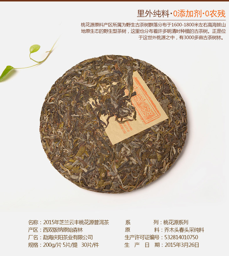产品名称:2015年 桃花源 普洱茶(生茶)200g
