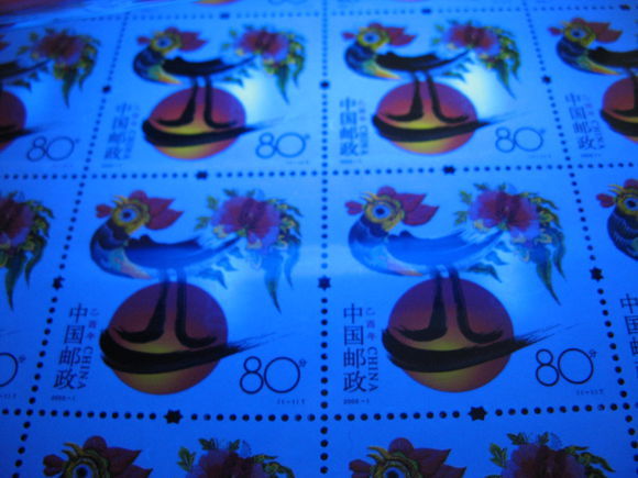 注:第三轮生肖鸡票的荧光码,天生不清。在市场上如果发现鸡版荧光喷码有十分清晰的,很可能是假货。
