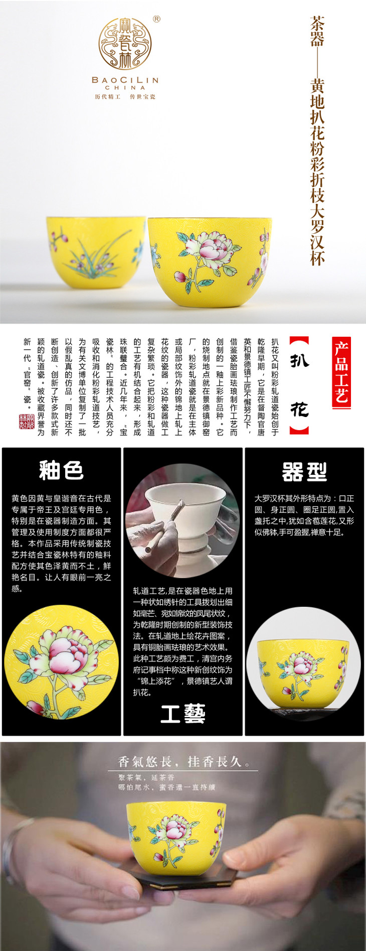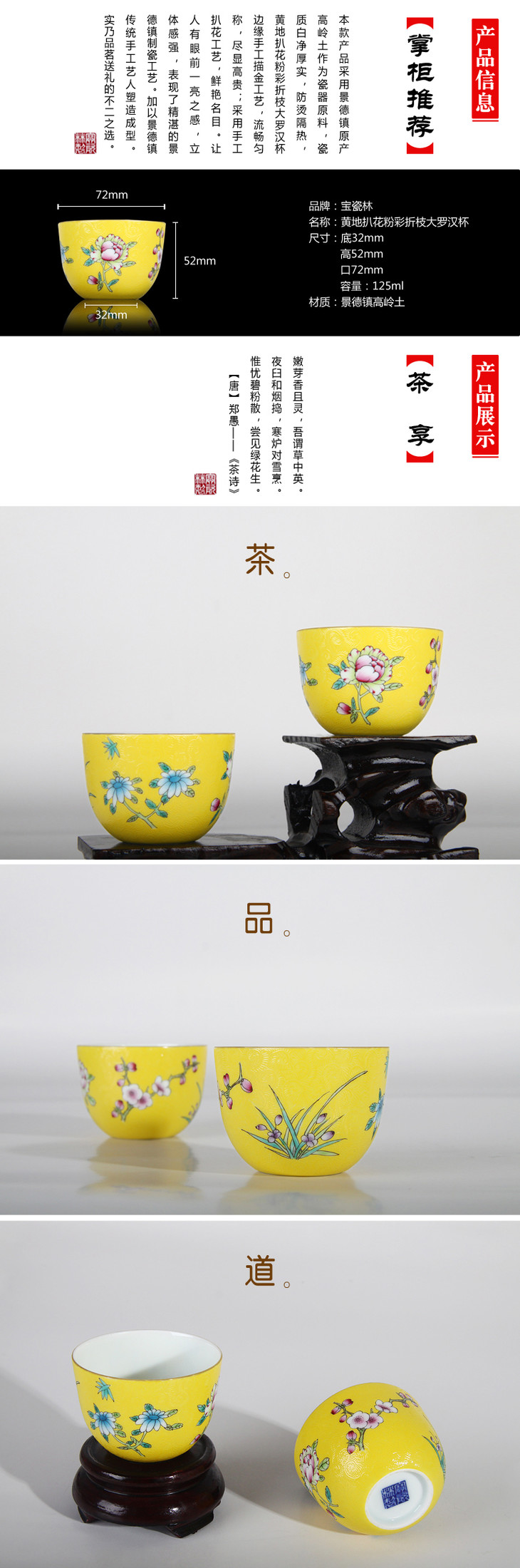 【宝瓷林】黄地扒花粉彩折枝大罗汉杯