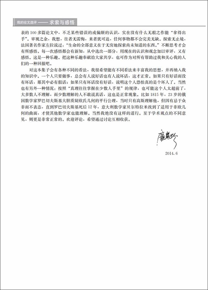 对这本集子会有各种不同的看法,我很希望能有不同看法来丰富我的思想,并再纳入我的知识中。一个人只要做事,总会有人说好话也有人说坏话,这才正常。如果只有好话而没有坏话,那其中必有假话;如果只有坏话没有好话,说明这个人恐怕真的是个坏人了。当然也有另外一种情况:按照“真理往往掌握在少数人手里”的规律,也可能这个人太超前了,大多数人不理解,而少数理解的人不敢说真话,这也是正常现象。比如1815年,23岁的俄国数学家罗巴切夫斯基大胆质疑欧氏几何的平行公理,当时只有高斯理解他,但因有忌于众非而不表态,直到罗巴切夫斯基死后12年,意大利数学家贝尔特拉米找到了适用于非欧几何的曲面,才使其他数学家也能理解。当然我绝没有这样的道行。至于学术观点的不同意见,则更是非常正常的。欢迎评论,希望通过讨论互相收获。