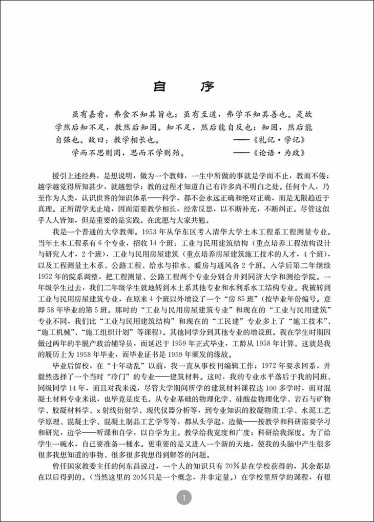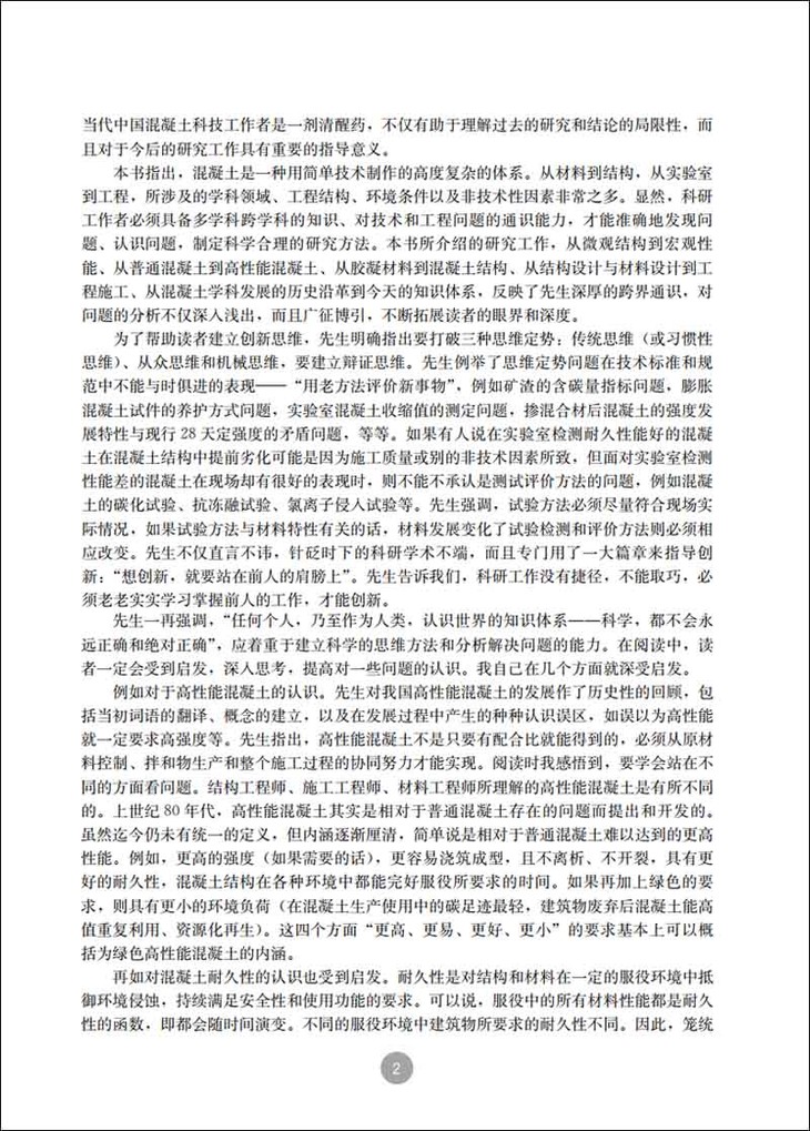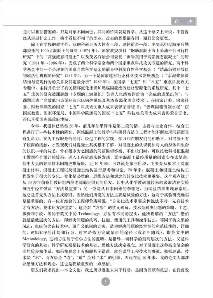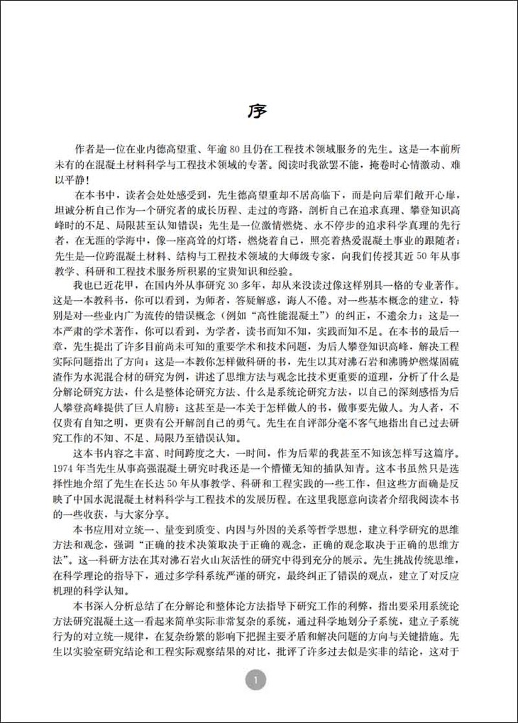 我也已近花甲,在国内外从事研究30多年,却从来没读过像这样别具一格的专业著作。这是一本教科书,你可以看到,为师者,答疑解惑,诲人不倦。对一些基本概念的建立,特别是对一些业内广为流传的错误概念(例如“高性能混凝土”)的纠正,不遗余力;这是一本严肃的学术著作,你可以看到,为学者,读书而知不知,实践而知不足。在本书的最后一章,先生提出了许多目前尚未可知的重要学术和技术问题,为后人攀登知识高峰,解决工程实际问题指出了方向;这是一本教你怎样做科研的书,先生以其对沸石岩和沸腾炉燃煤固硫渣作为水泥混合材的研究为例,讲述了思维方法与观念比技术更重要的道理,分析了什么是分解论研究方法,什么是整体论研究方法、什么是系统论研究方法,以自己的深刻感悟为后人攀登高峰提供了巨人肩膀;这甚至是一本关于怎样做人的书,做事要先做人。为人者,不仅贵有自知之明,更贵有公开解剖自己的勇气。先生在自评部分毫不客气地指出自己过去研究工作的不知、不足、局限乃至错误认知。