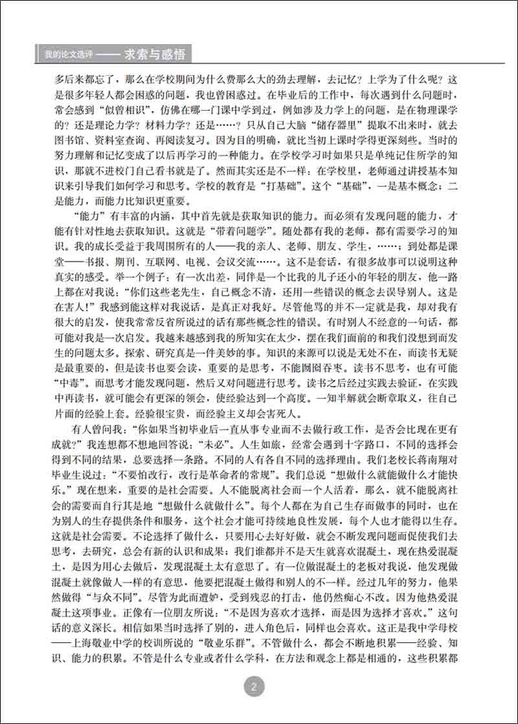 有人曾问我:“你如果当初毕业后一直从事专业而不去做行政工作,是否会比现在更有成就?”我连想都不想地回答说:“未必”。人生如旅,经常会遇到十字路口,不同的选择会得到不同的结果,总要选择一条路。不同的人有各自不同的选择理由。我们老校长蒋南翔对毕业生说过:“不要怕改行,改行是革命者的常规”。我们总说“想做什么就能做什么才能快乐。”现在想来,重要的是社会需要。人不能脱离社会而一个人活着,那么,就不能脱离社会的需要而自行其是地“想做什么就做什么”。每个人都在为自己生存而做事的同时,也在为别人的生存提供条件和服务,这个社会才能可持续地良性发展,每个人也才能得以生存。这就是社会需要。不论选择了做什么,只要用心去好好做,就会不断发现问题而促使我们去思考,去研究,总会有新的认识和成果;我们谁都并不是天生就喜欢混凝土,现在热爱混凝土,是因为用心去做后,发现混凝土太有意思了。有一位做混凝土的老板对我说,他发现做混凝土就像做人一样的有意思,他要把混凝土做得和别人的不一样。经过几年的努力,他果然做得“与众不同”。尽管为此而遭妒,受到残忍的打击,他仍然痴心不改。因为他热爱混凝土这项事业。正像有一位朋友所说:“不是因为喜欢才选择,而是因为选择才喜欢。”这句话的意义深长。相信如果当时选择了别的,进入角色后,同样也会喜欢。这正是我中学母校——上海敬业中学的校训所说的“敬业乐群”。不管做什么,都会不断地积累——经验、知识、能力的积累。不管是什么专业或者什么学科,在方法和观念上都是相通的,这些积累都是可以相互借鉴的,只是对象不同而已。其间的桥梁就是哲学。从这个意义上来说,不管曾经从事过什么工作,换个看似不相干的职业,过去的积累都有用,而且面会更宽。