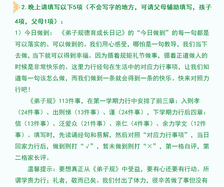 《弟子规》共七章113件事,在本期力行中安排了后四章:信、泛爱众、亲仁、余力学文。填写时,边读边对照,同时注意不同的章节,还需要家长或同学配合,共同填写。