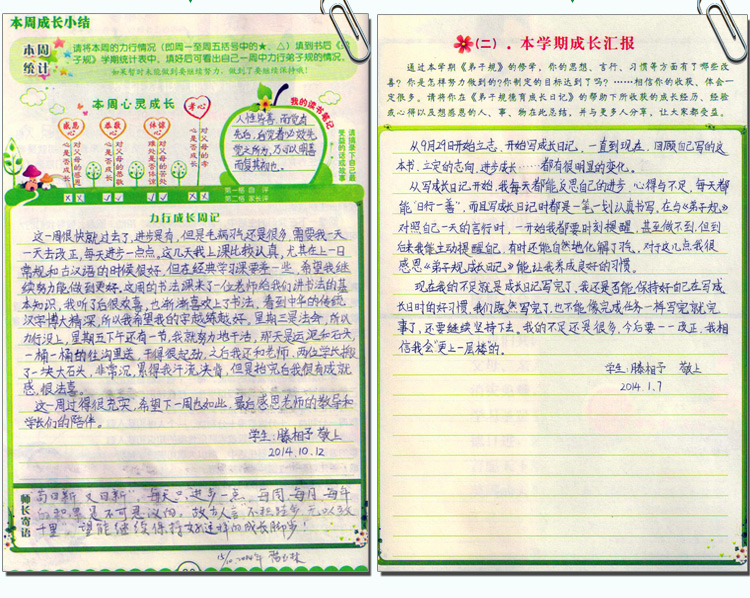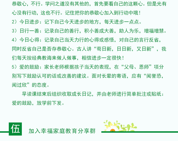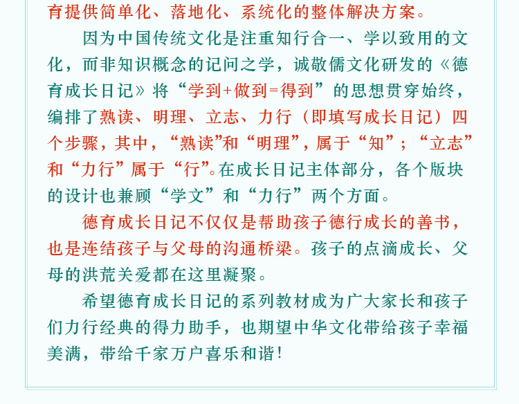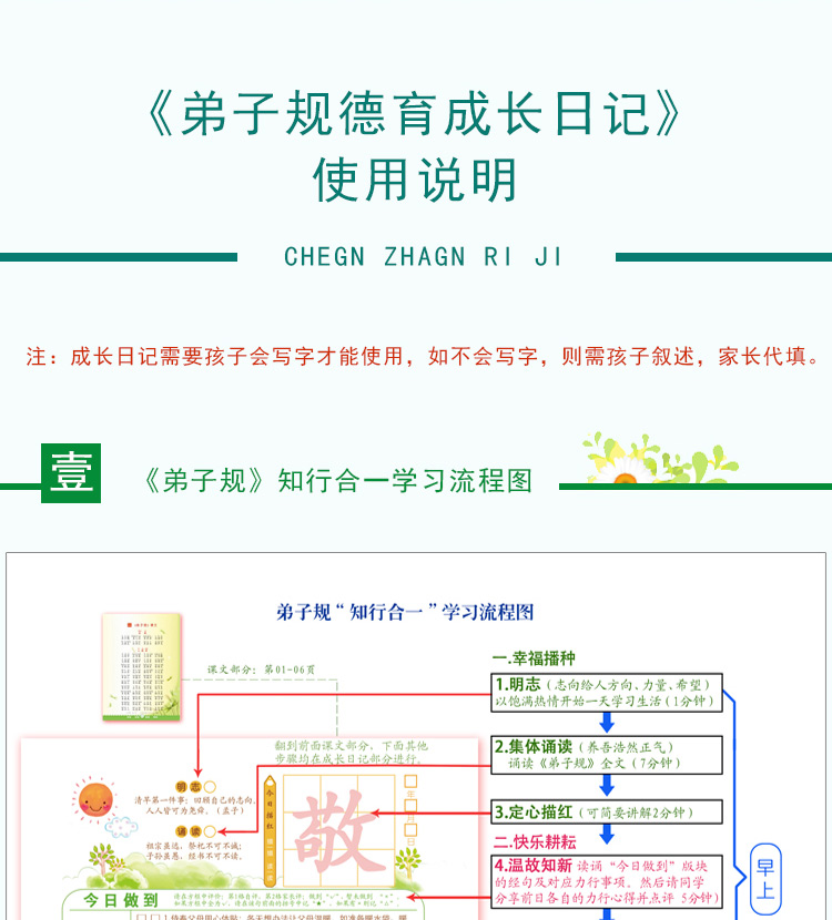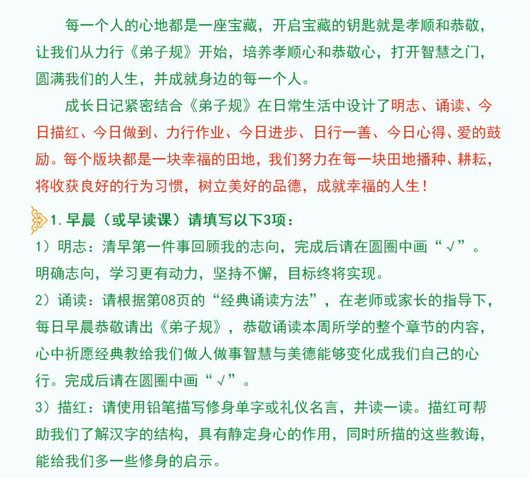 成长日记紧密结合《弟子规》在生活中的力行设计了:明志、诵读、描红、今日做到、今日进步、日行一善、今日心得、爱的鼓励8个版块。每个版块都是一块幸福的田地,我们努力在每一块田地播种、耕耘,将收获良好的习惯,树立美好的品德,收获幸福的人生!