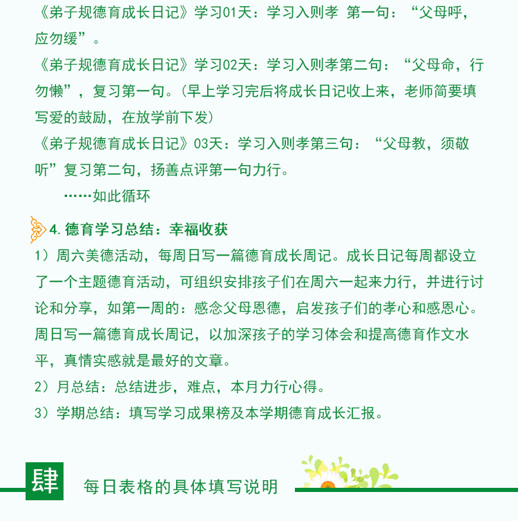 这部成长日记共安排了100天,力行《弟子规》信、泛爱众、亲仁、余力学文四章的内容。力行第1天请从周一开始,周一至周五这5天反复力行3-6句《弟子规》的内容,周六有美德活动,周日有读书笔记、周记等总结性活动。另外每隔四周有一次月总结。第98天、第99天为月总结。第100天为落实《弟子规》成果榜。
