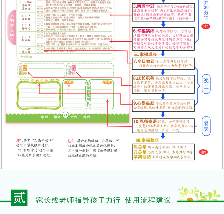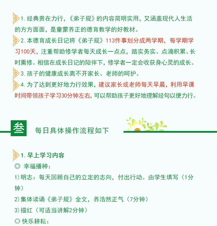 《弟子规》共七章113件事,初学者往往难以在短时间内完全落实。这套成长日记为解修学者力行之忧,将113件事分成上、下两学期,即上下两册,每学期力行100天,上学期用上册力行前三章:入则孝(24件事)、出则弟(13件事)、谨(24件事)。下学期用下册力行后四章:信(13件事)、泛爱众(21件事)、亲仁(4件事)、余力学文(12件事)。这样在一周内我们只要力行3-6句《弟子规》,在两个百日之内我们就可以相对轻松并且踏实地完成整部《弟子规》的力行。