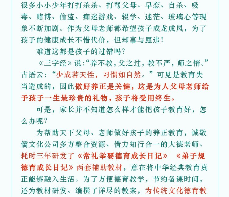 《弟子规德育成长日记》不仅仅是帮助孩子德行成长的善书,也是连结孩子与父母、老师的沟通桥梁。孩子的成长,父母、老师的点点关爱都将在这里凝聚。希望此书成为广大老师、家长和孩子们力行《弟子规》的得力助手,也期待中华文化能给孩子带来幸福人生,给家庭带来和睦温暖,给社会带来和谐安定。