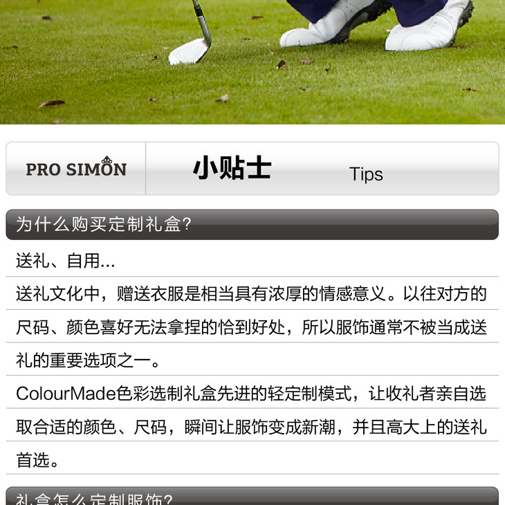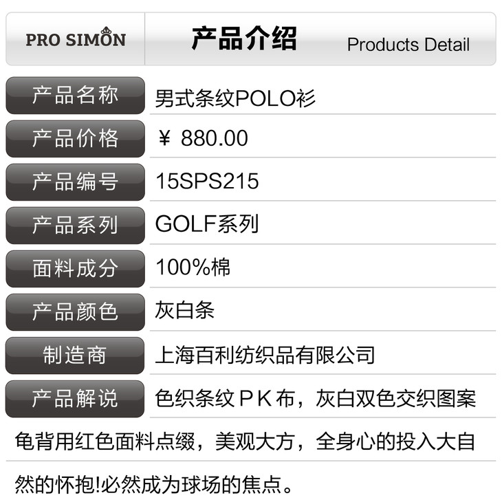 - PROSIMON高尔夫服饰,旗下有高尔夫运动系列、好动衬衫系列、色彩选制系列丰富的商品线。