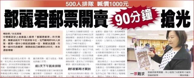 各大媒体均以整版新闻报道。有粉丝前一天下午就来排队,跑5家邮局才买到……邮局工作人员:“一早来排队的都不一定能买到”。当天整个台湾一票难求!