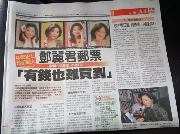 台湾“中华邮政”发行了邓丽君邮票,这是中华邮政100余年以来,首次发行艺人肖像邮票,也是迄今为止唯一能登录中华邮政邮票的艺人。邮票发行当天有多轰动?看看当天的报纸吧↓