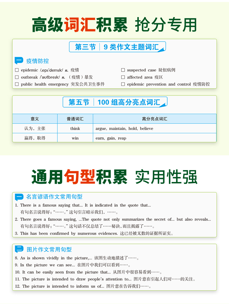 6. 归纳英语六级写作主题词汇、谚语、写作模板、句型等实用写作素材,方便考生应考前储备;