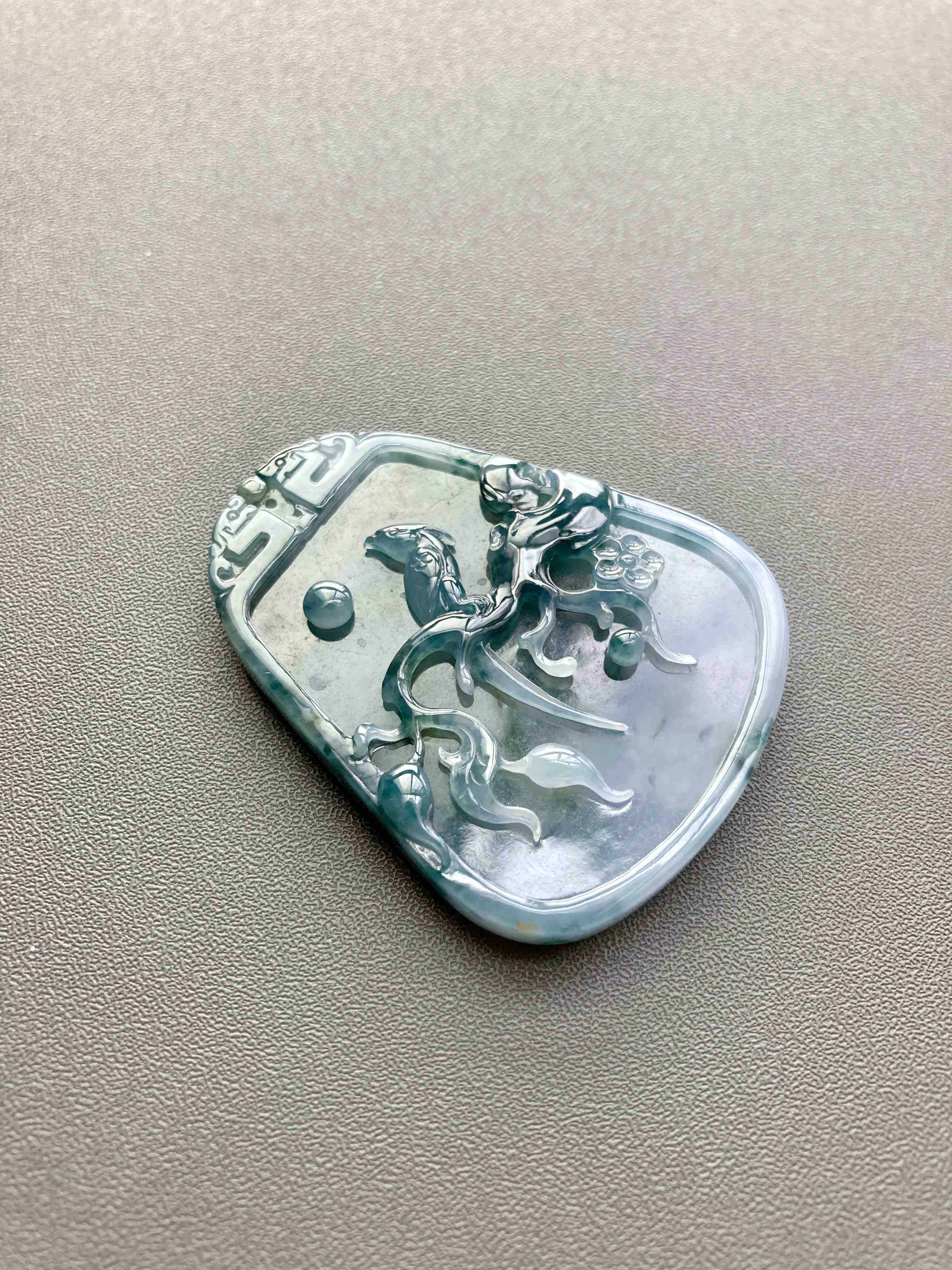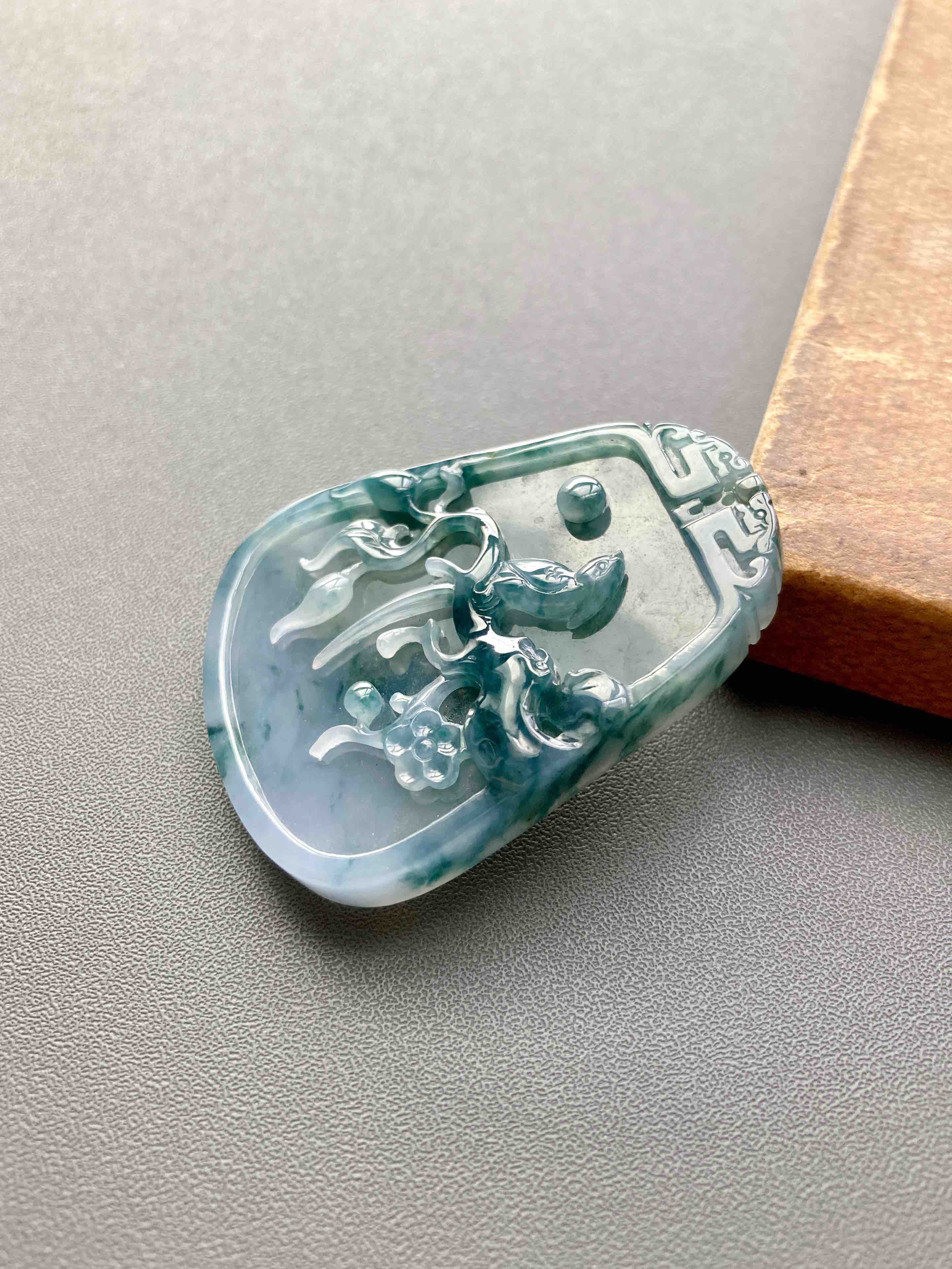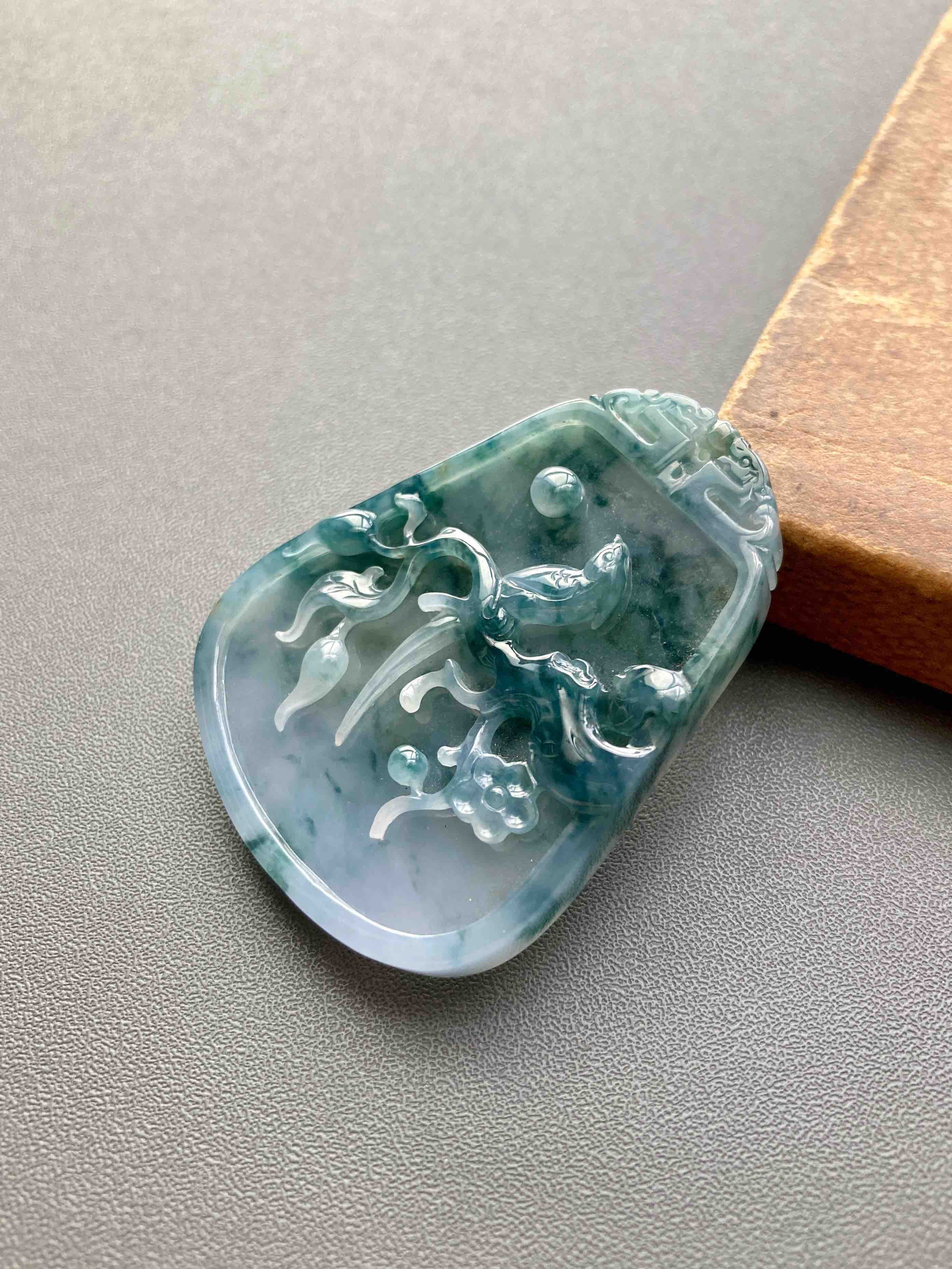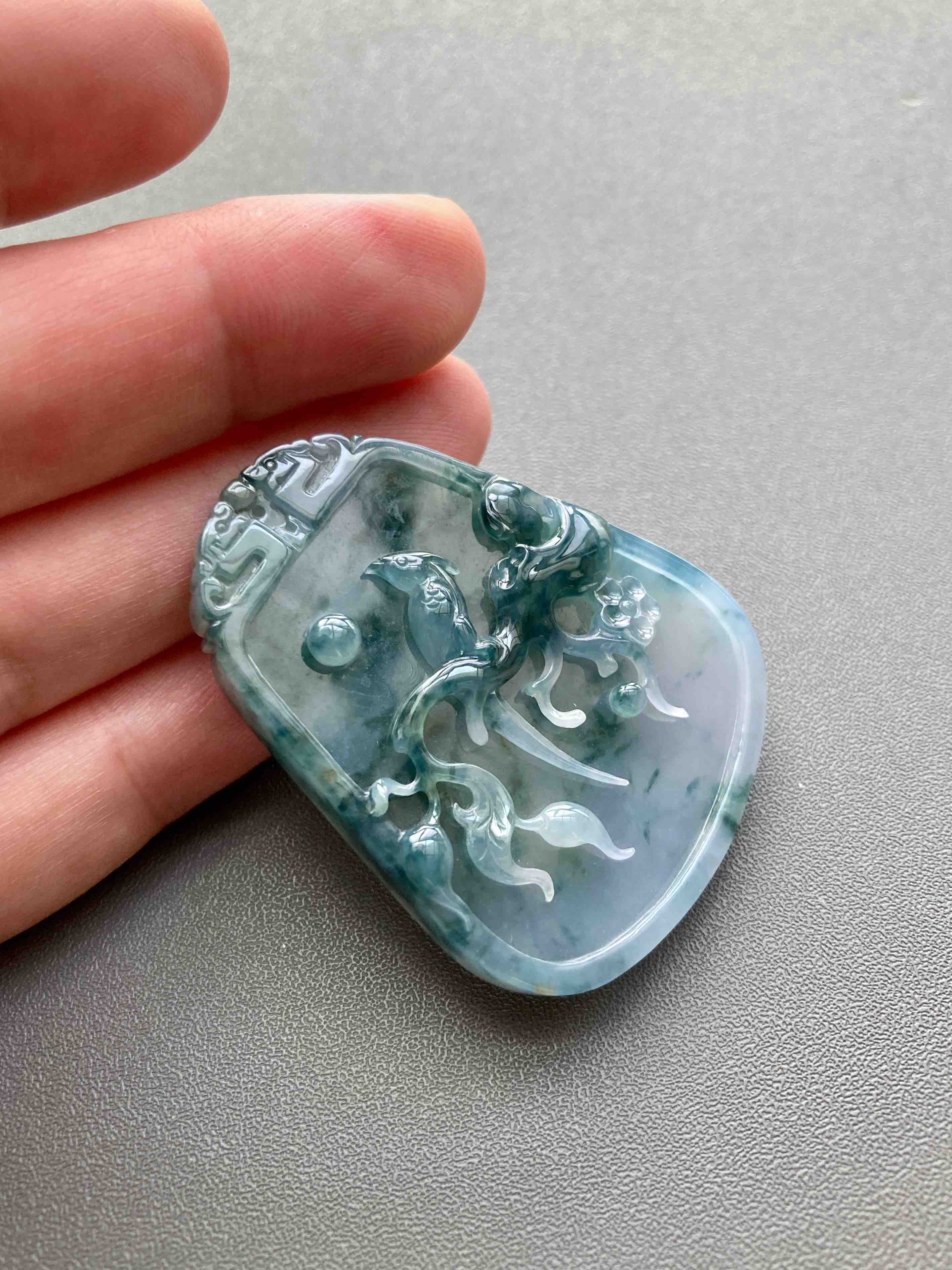 大件雕牌,不是小挂坠,自己戴或者送礼非常体面,糯冰种飘花,种水特细腻,没什么棉,果冻感,下半梦幻紫罗兰,经典的喜上梅梢,喜鹊报喜,雕工美极,几千块这样厚庄大气的牌子,捡漏,46.2×36.3×7mm