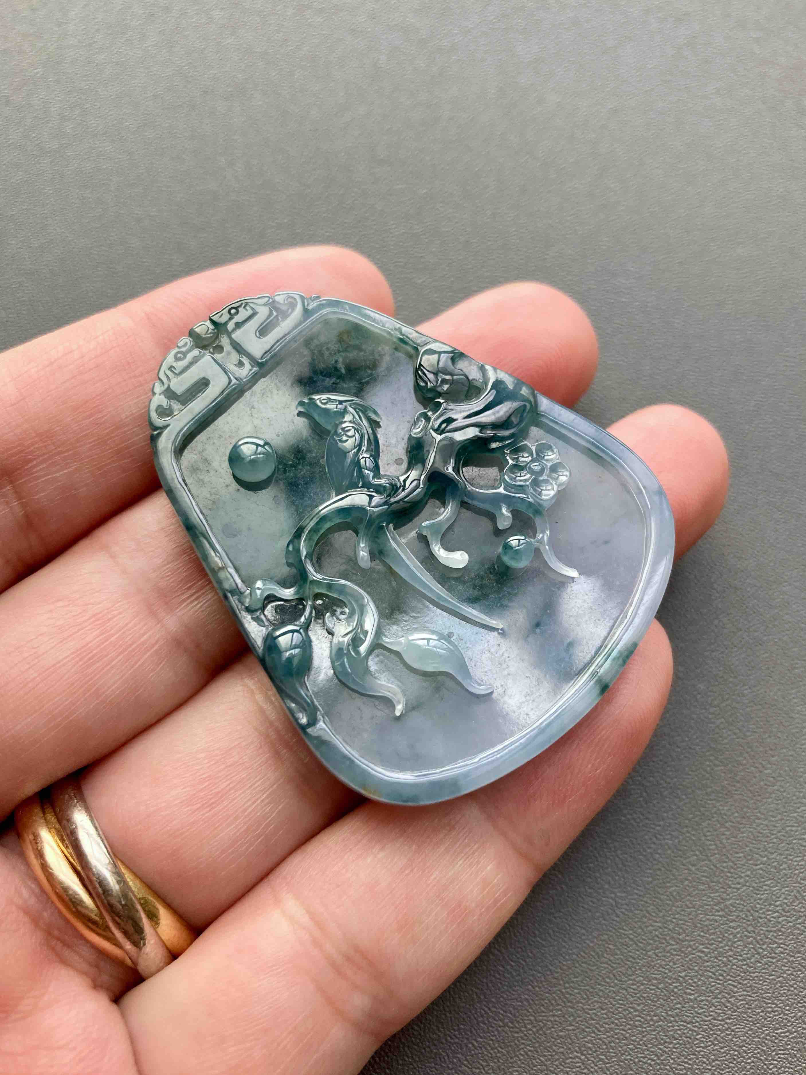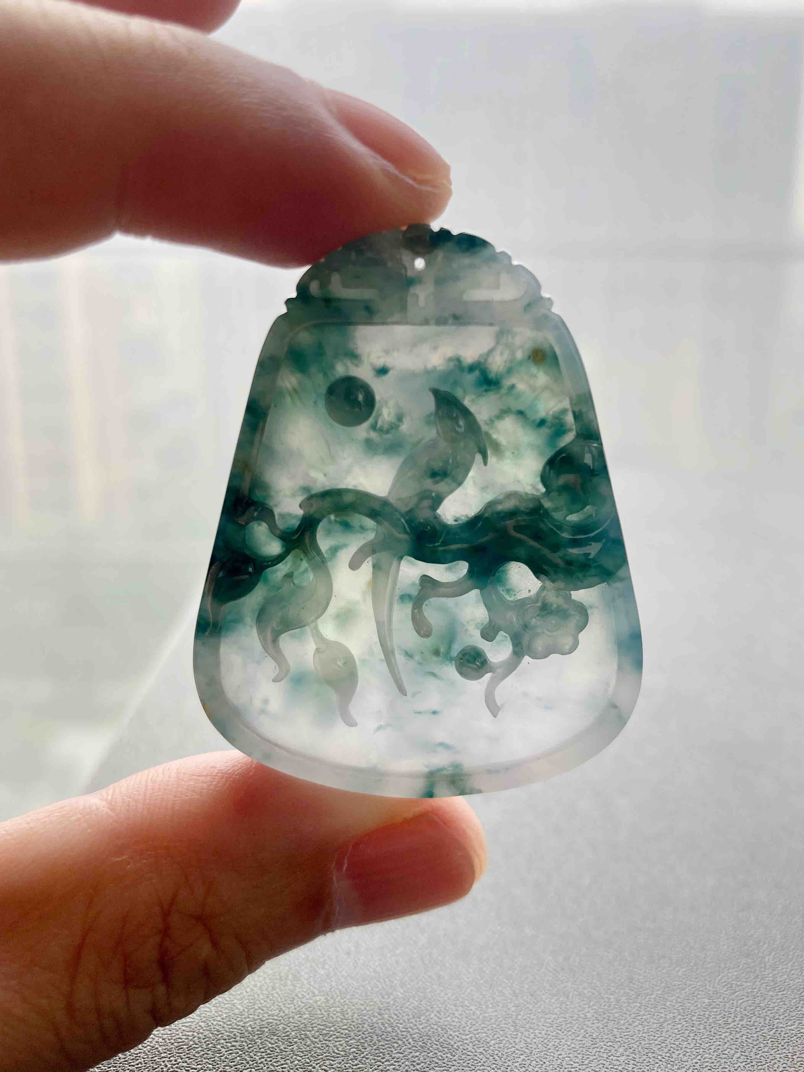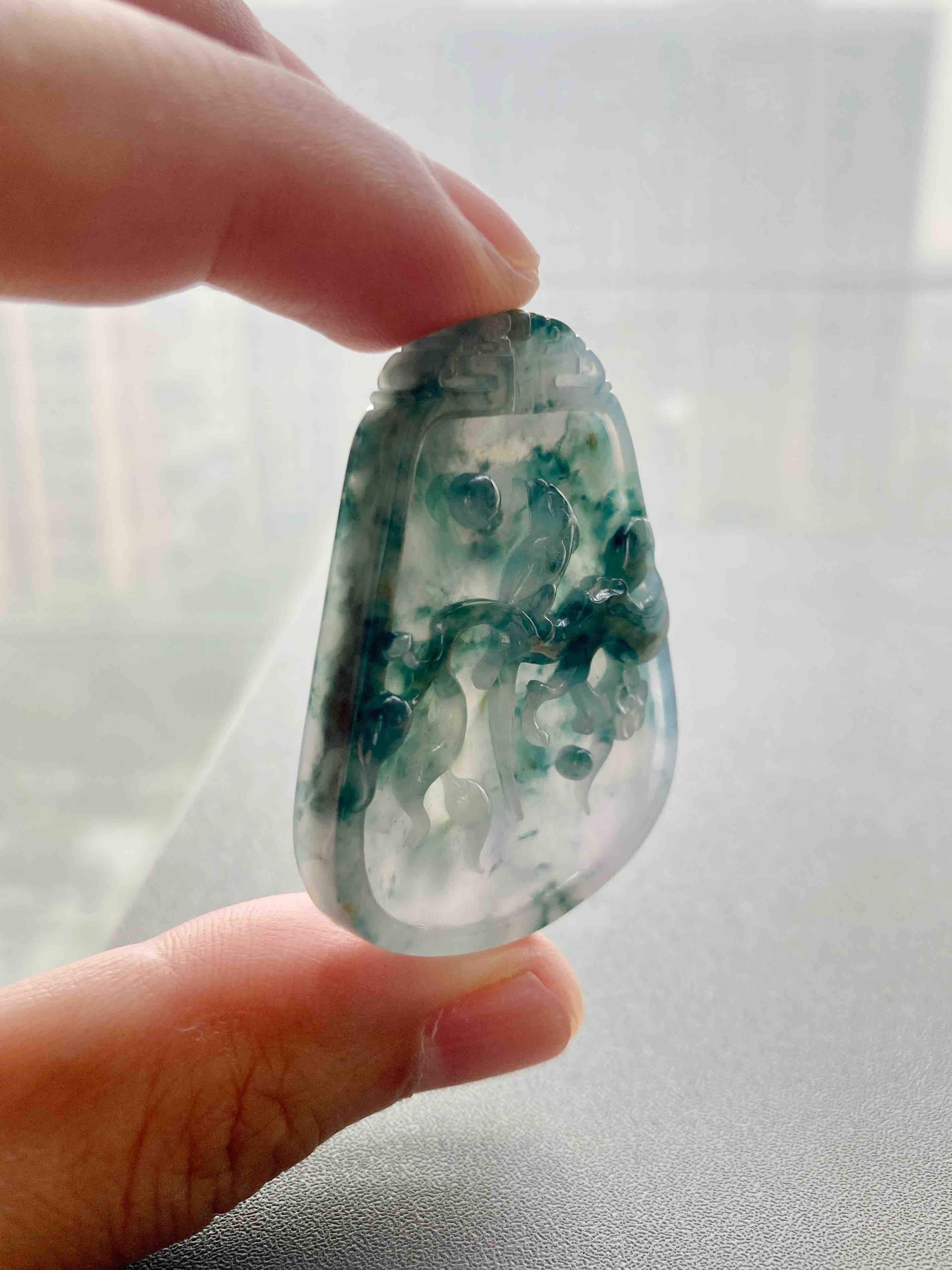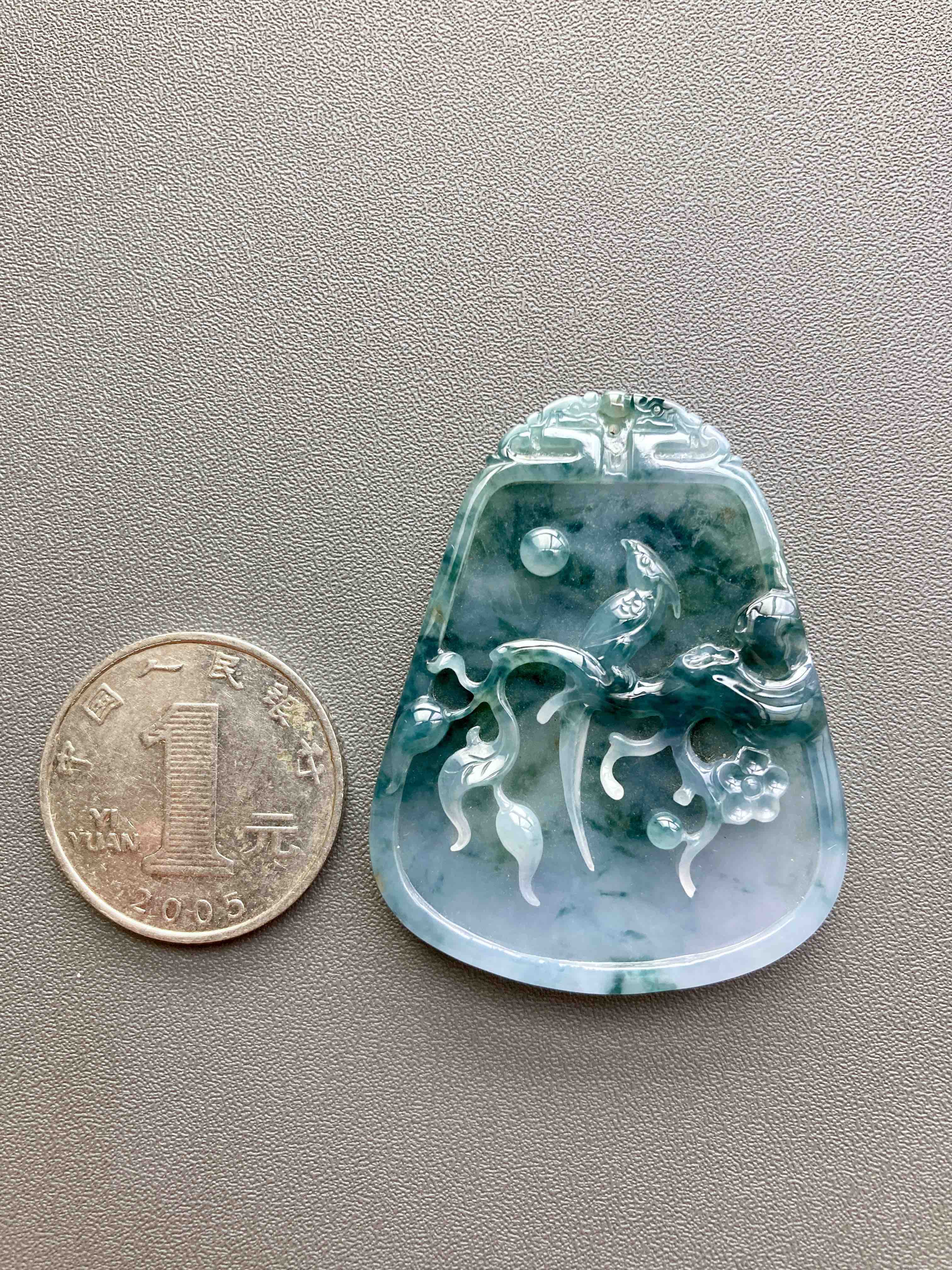 大件雕牌,不是小挂坠,自己戴或者送礼非常体面,糯冰种飘花,种水特细腻,没什么棉,果冻感,下半梦幻紫罗兰,经典的喜上梅梢,喜鹊报喜,雕工美极,几千块这样厚庄大气的牌子,捡漏,46.2×36.3×7mm