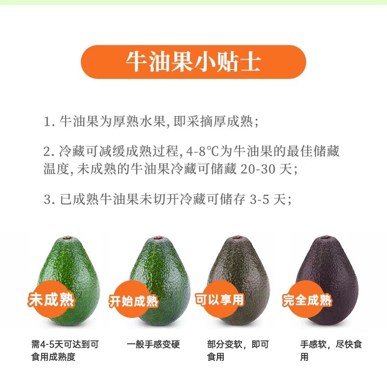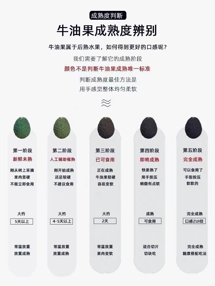 2.收到牛油果后,去掉包装,保持在20度以上自然成熟或放苹果捂在纸箱里催熟;牛油果表皮变黑微软时即可食用,不宜过软果黑。