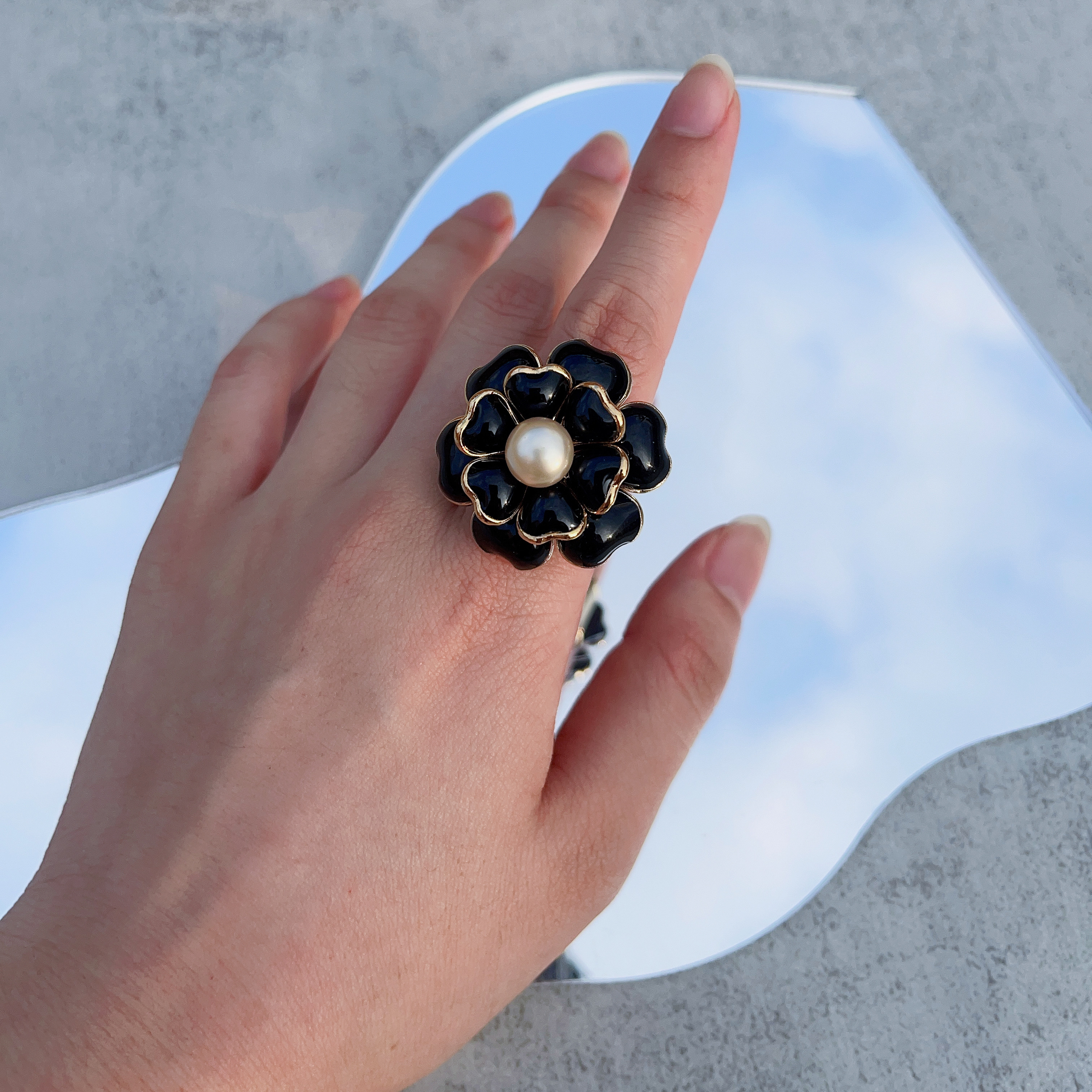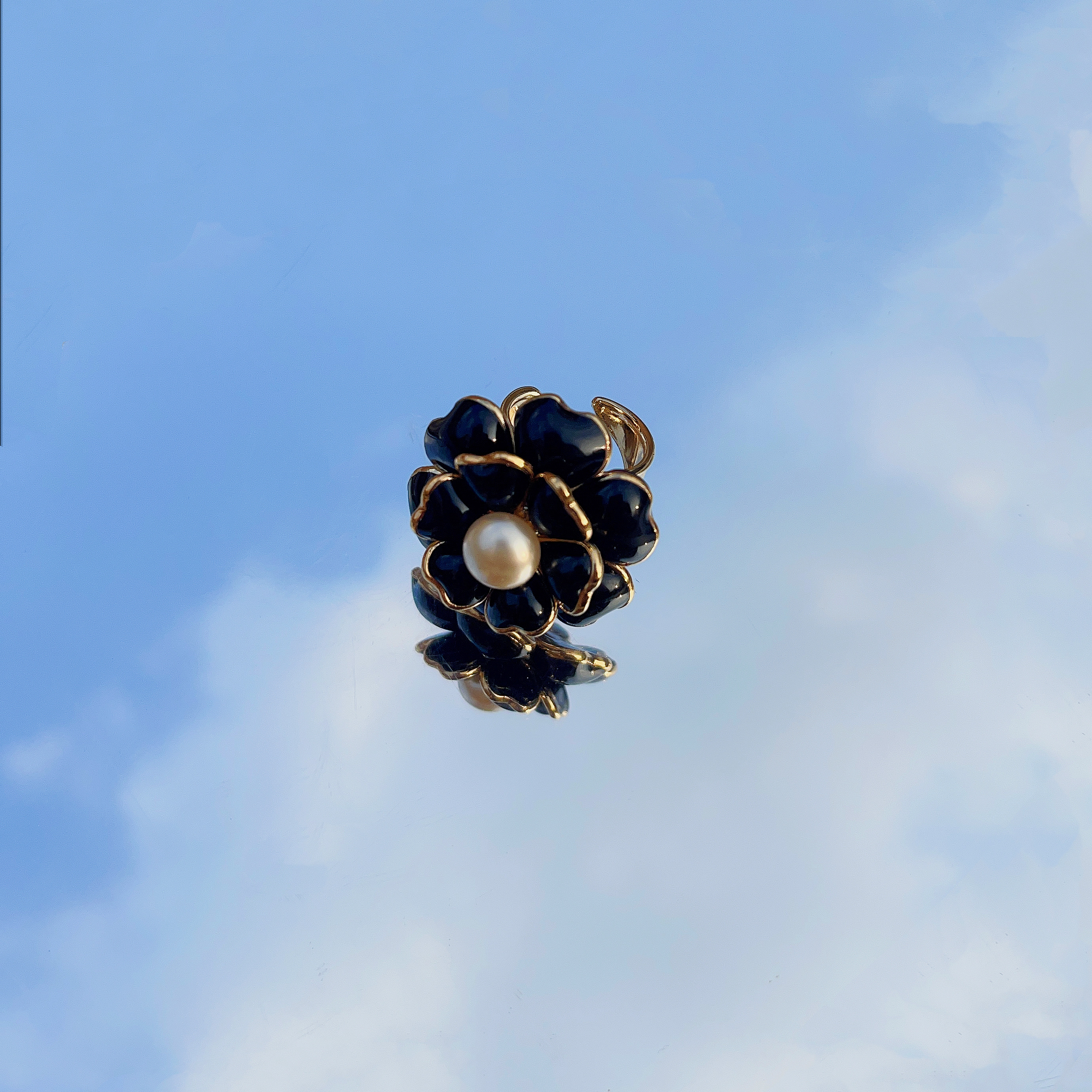 北京仓|Gripoix Paris-Camelia-黑色琉璃 山茶花 珍珠 戒指[法国设计师]