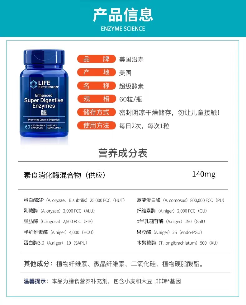 沿寿LIFE EXTENSION Super Digestive Enzymes 消化酶60粒
