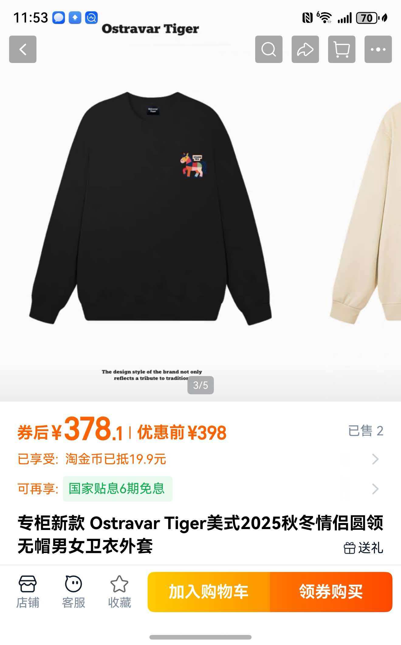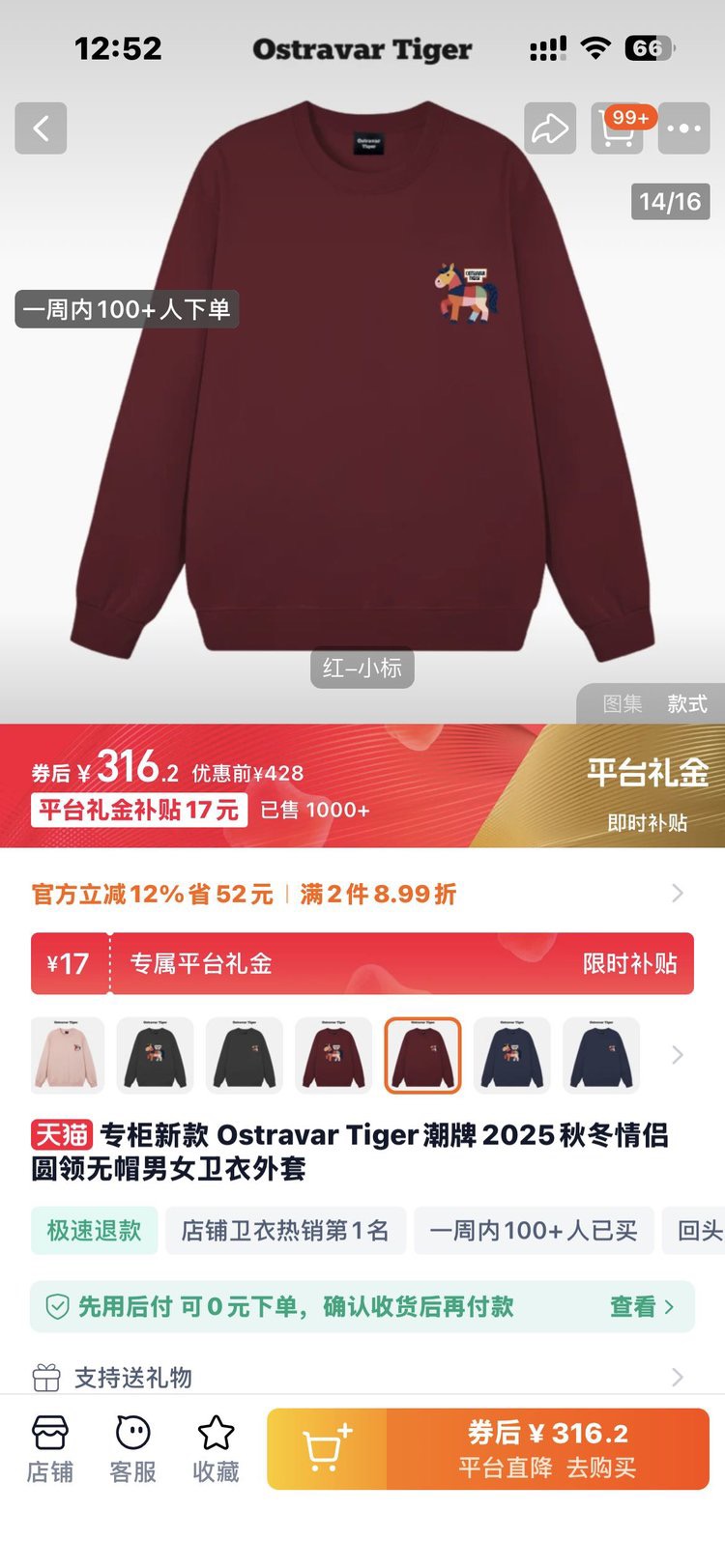 正品!OstravarTiger彩马印花情侣圆领卫衣