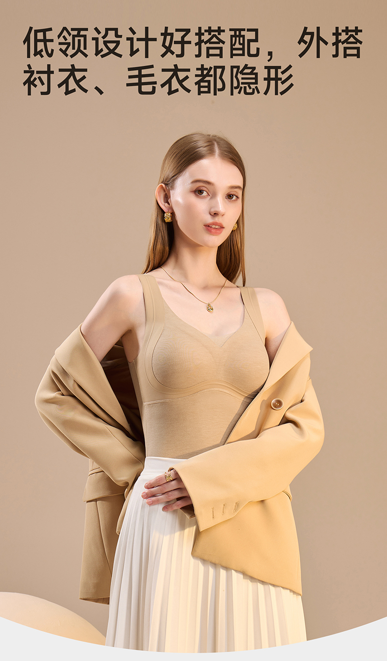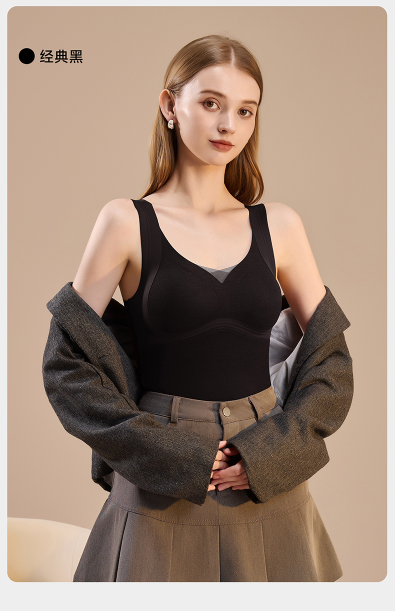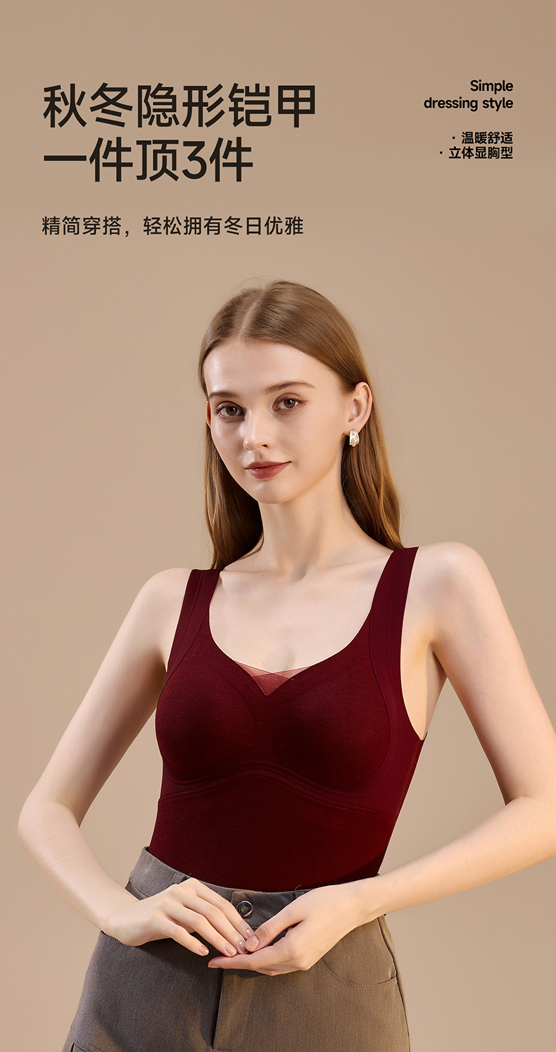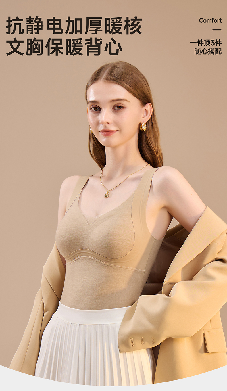 锁温能力好强,穿一件小肚子立刻暖了!而且免穿文胸哦,贼方便!一件足足有300g的蓬松暖绒!一件=内衣+保暖背心+打底衫!一件顶三件!