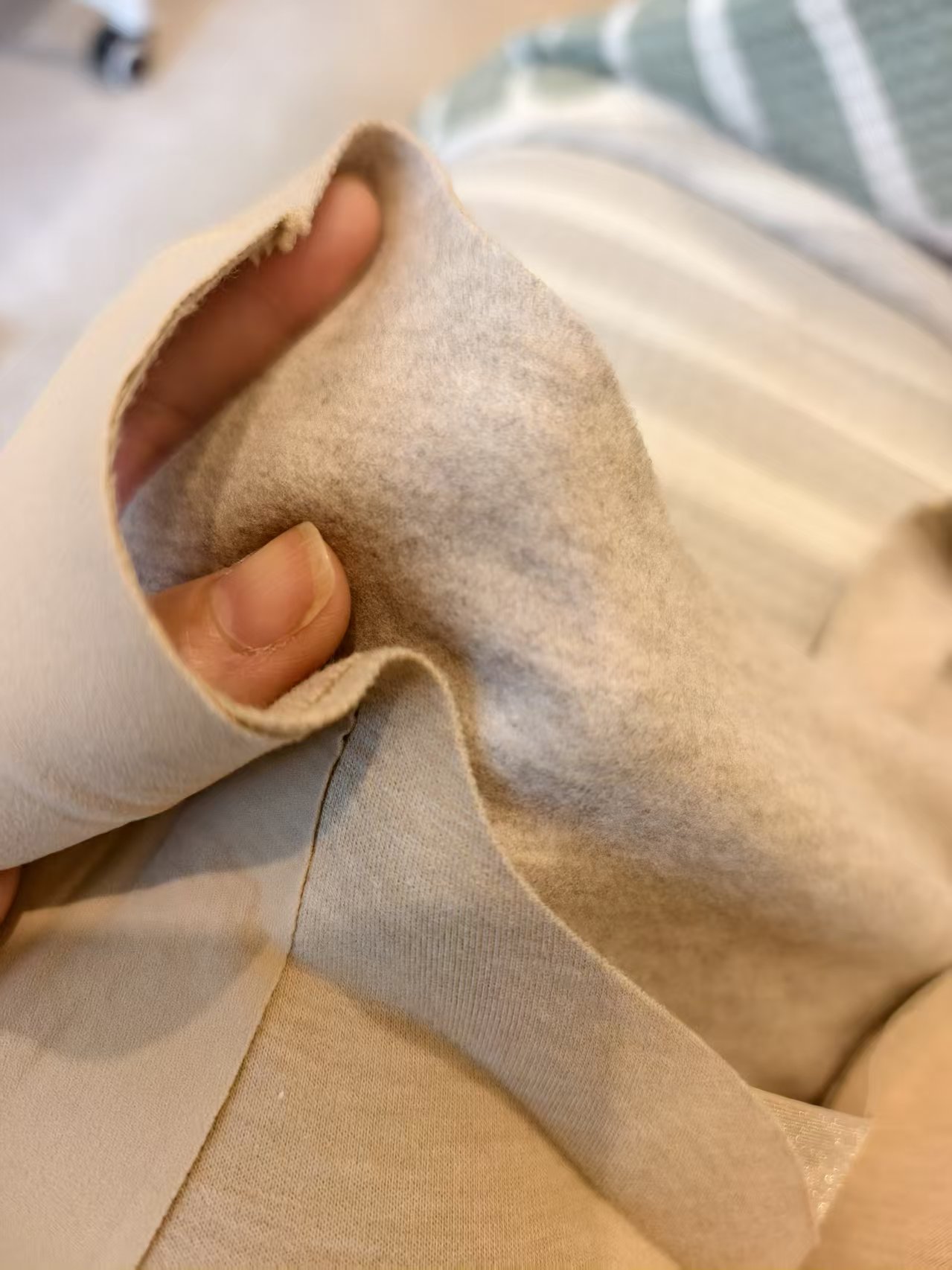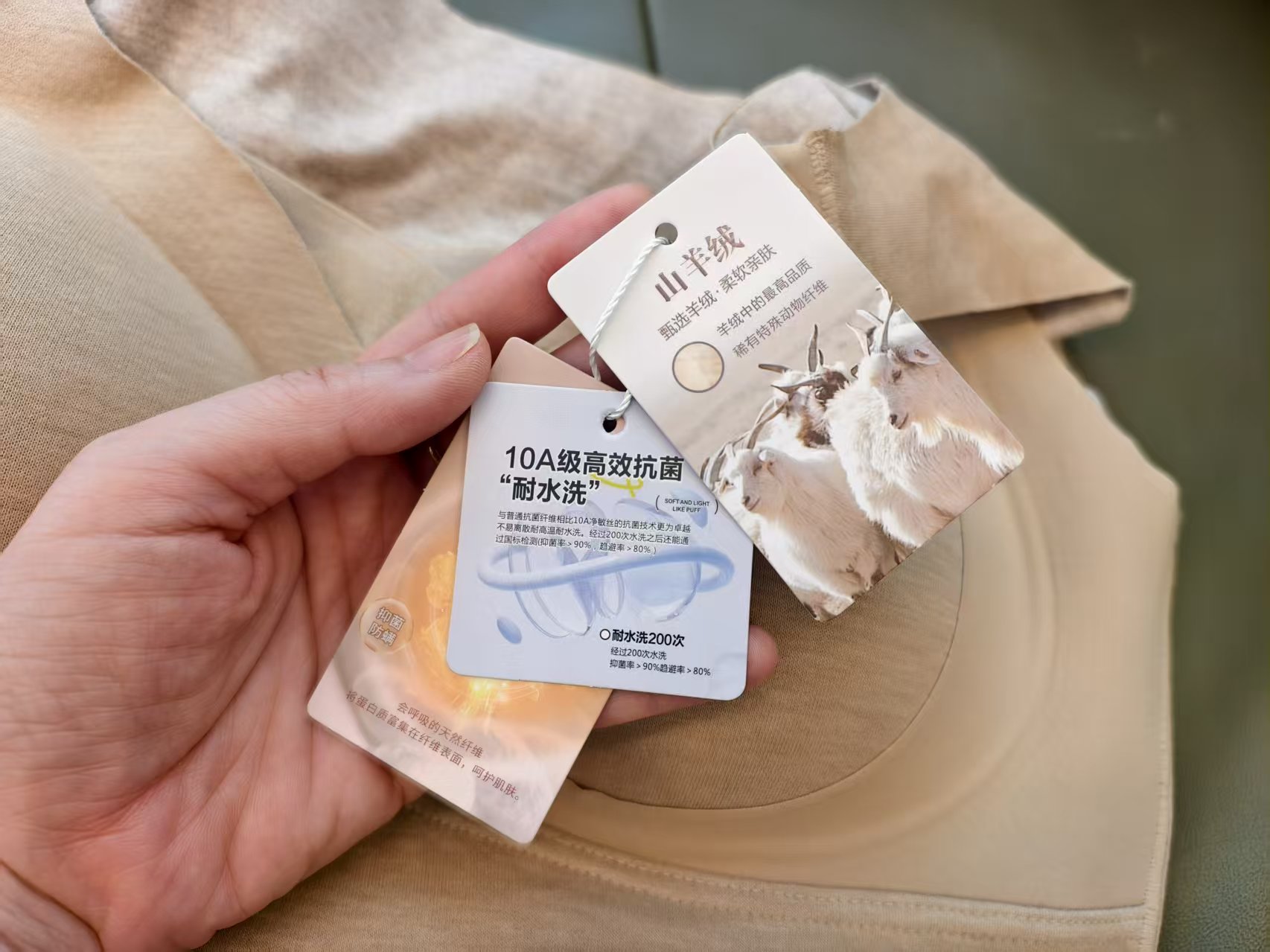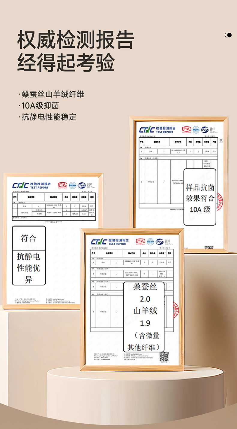 里层: 粘纤62.4%聚酯纤维22.3%氨纶11.4%桑蚕丝2%山羊绒1.9%(含微量其他纤维)