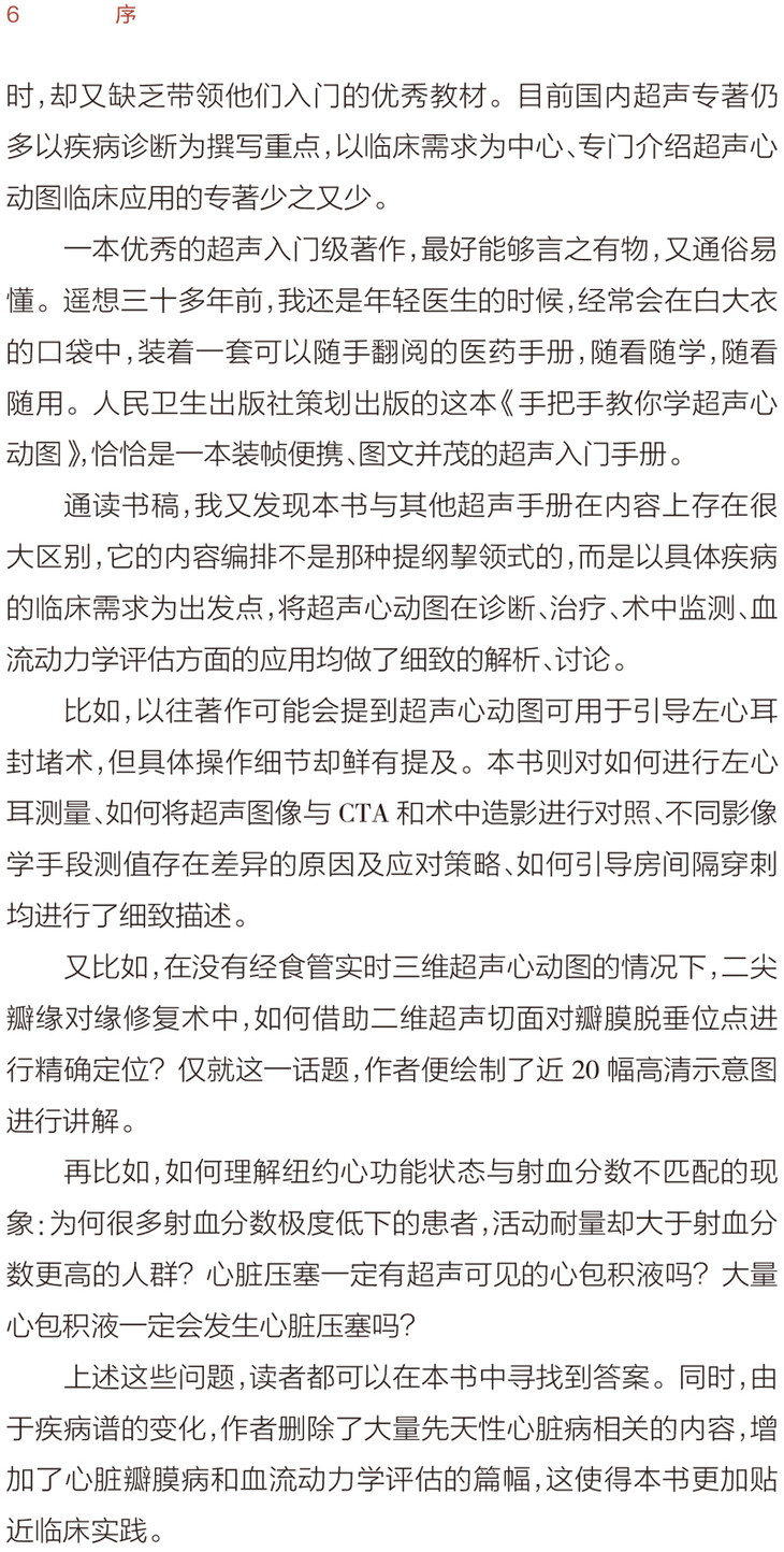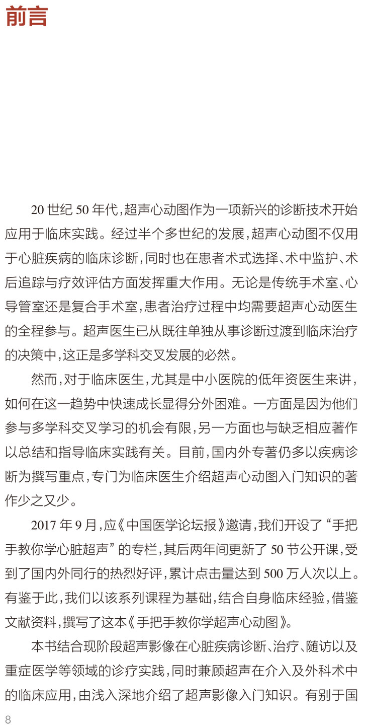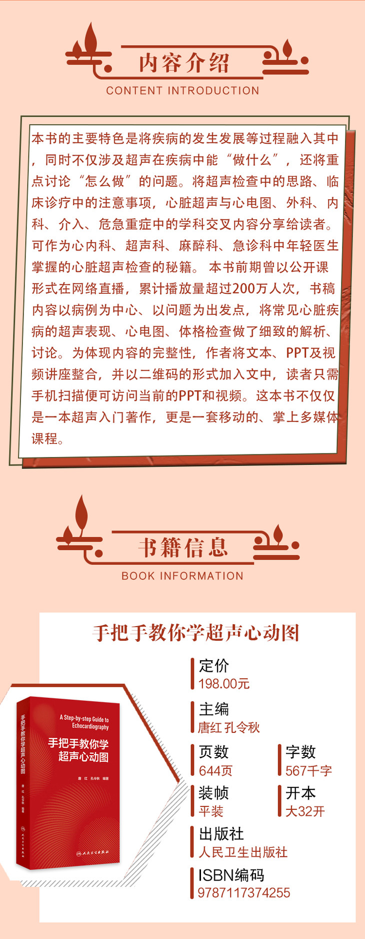 本书的主要特色是将疾病的发生发展等过程融入其中,同时不仅涉及超声在疾病中能“做什么”,还将重点讨论“怎么做”的问题。将超声检查中的思路、临床诊疗中的注意事项,心脏超声与心电图、外科、内科、介入、危急重症中的学科交叉内容分享给读者。可作为心内科、超声科、麻醉科、急诊科中年轻医生掌握的心脏超声检查的秘籍。 本书前期曾以公开课形式在网络直播,累计播放量超过200万人次,书稿内容以病例为中心、以问题为出发点,将常见心脏疾病的超声表现、心电图、体格检查做了细致的解析、讨论。为体现内容的完整性,作者将文本、PPT及视频讲座整合,并以二维码的形式加入文中,读者只需手机扫描便可访问当前的PPT和视频。这本书不仅仅是一本超声入门著作,更是一套移动的、掌上多媒体课程。