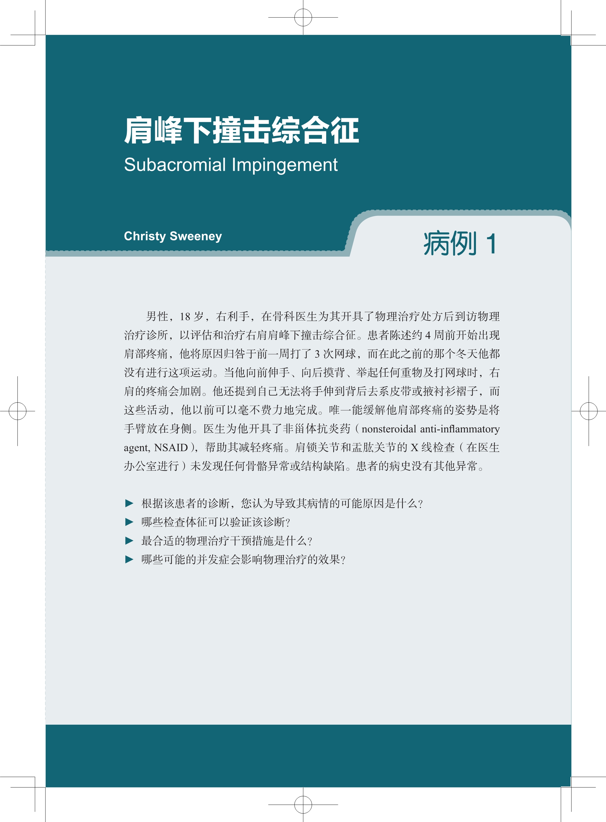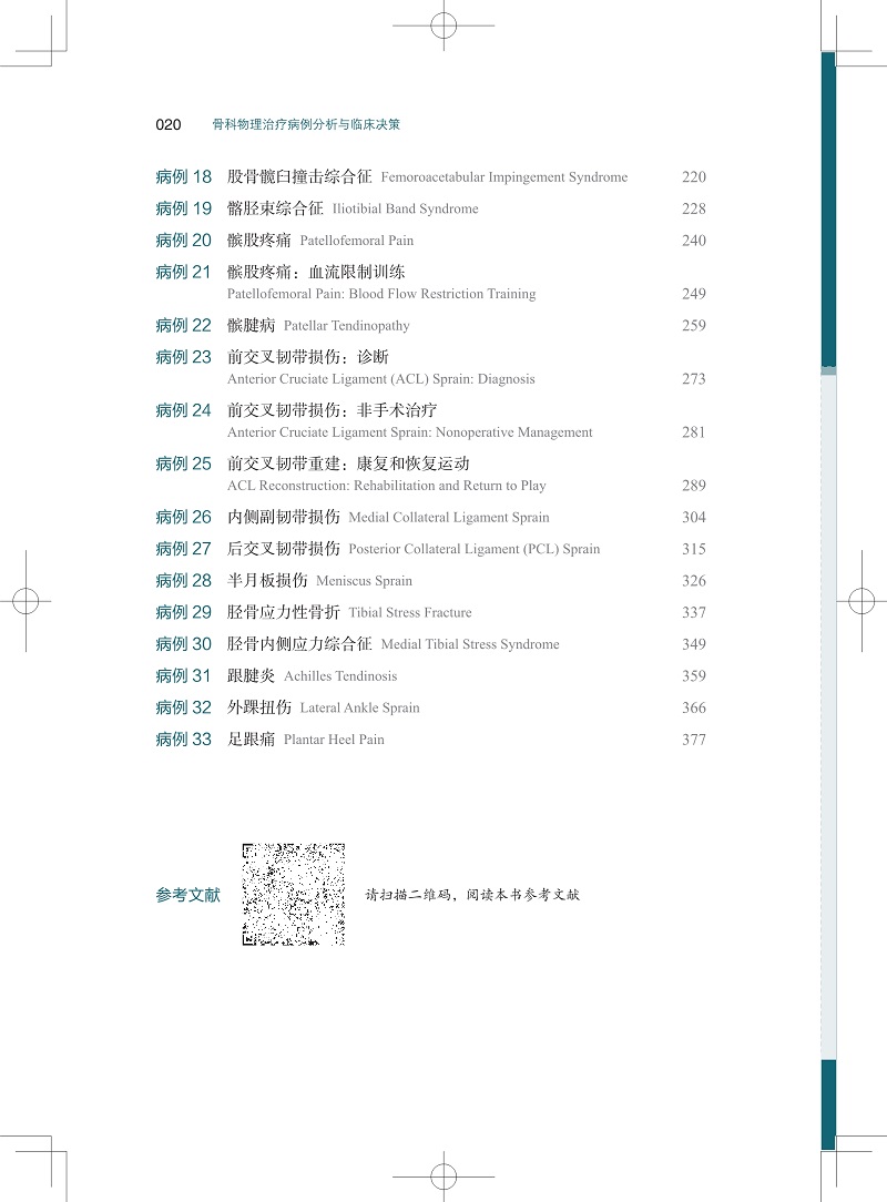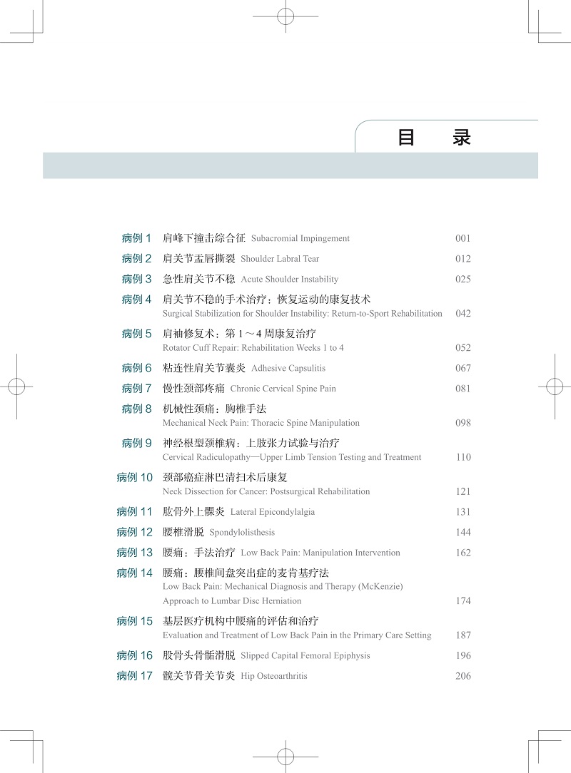 本书包含了 33 个关于常见骨骼肌肉疾病的病例:7个与上肢有关,8个与脊柱有关,18个与下肢有关。既结合过去10年中的新实践和证据,也对 版中的26个案例进行了更新。例如,使用诊断超声确认髌腱病(病例22)的诊断,以及利用干针疗法作为足跟痛的辅助治疗(病例33)。此外,6个新案例反映了物理治疗实践中的 技术和 新进展,包括使用血流限制训练治疗髌股疼痛(病例21),以及物理治疗师在初级护理中的介入(病例15)。希望本书能够激励物理治疗师和相关专业医学生保持学习热情、提升实践技能,并帮助改善患者的生活质量。
