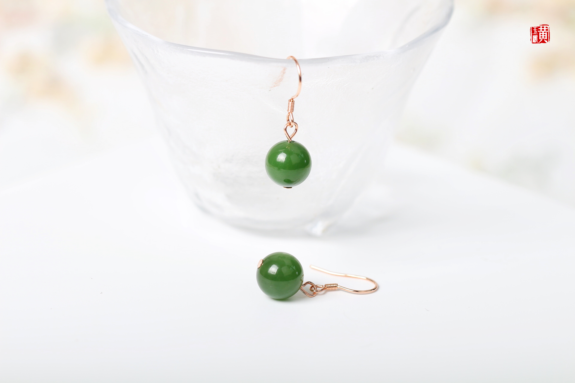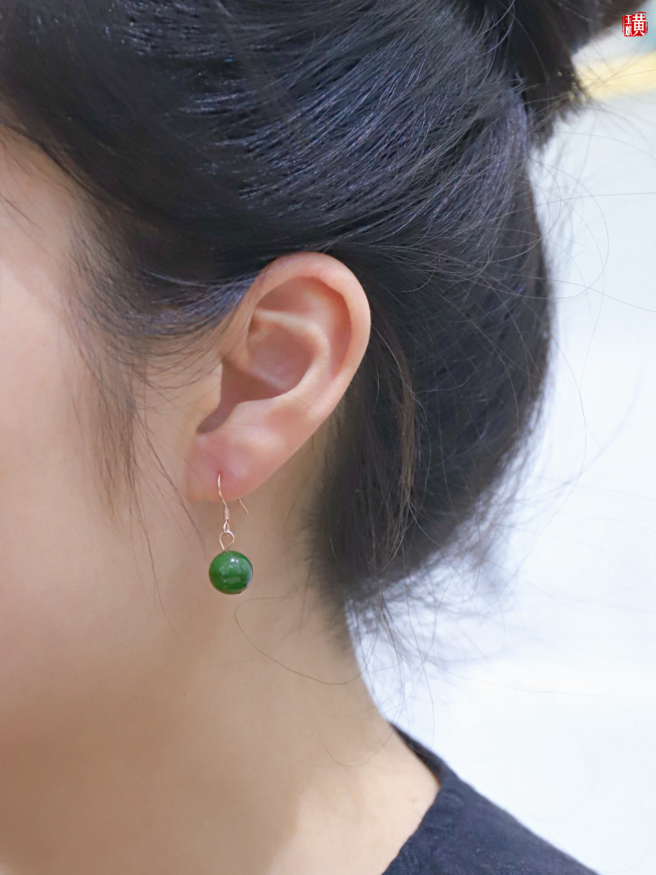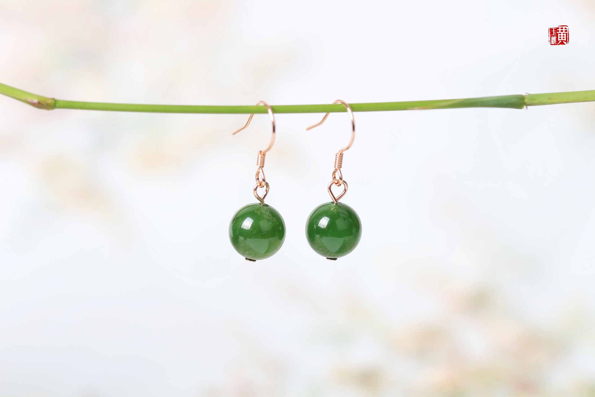 和田碧玉耳坠,玉质细腻,老坑菠菜绿,绿意盎然,富有活力,925银镶,精致优雅,摇曳生姿。