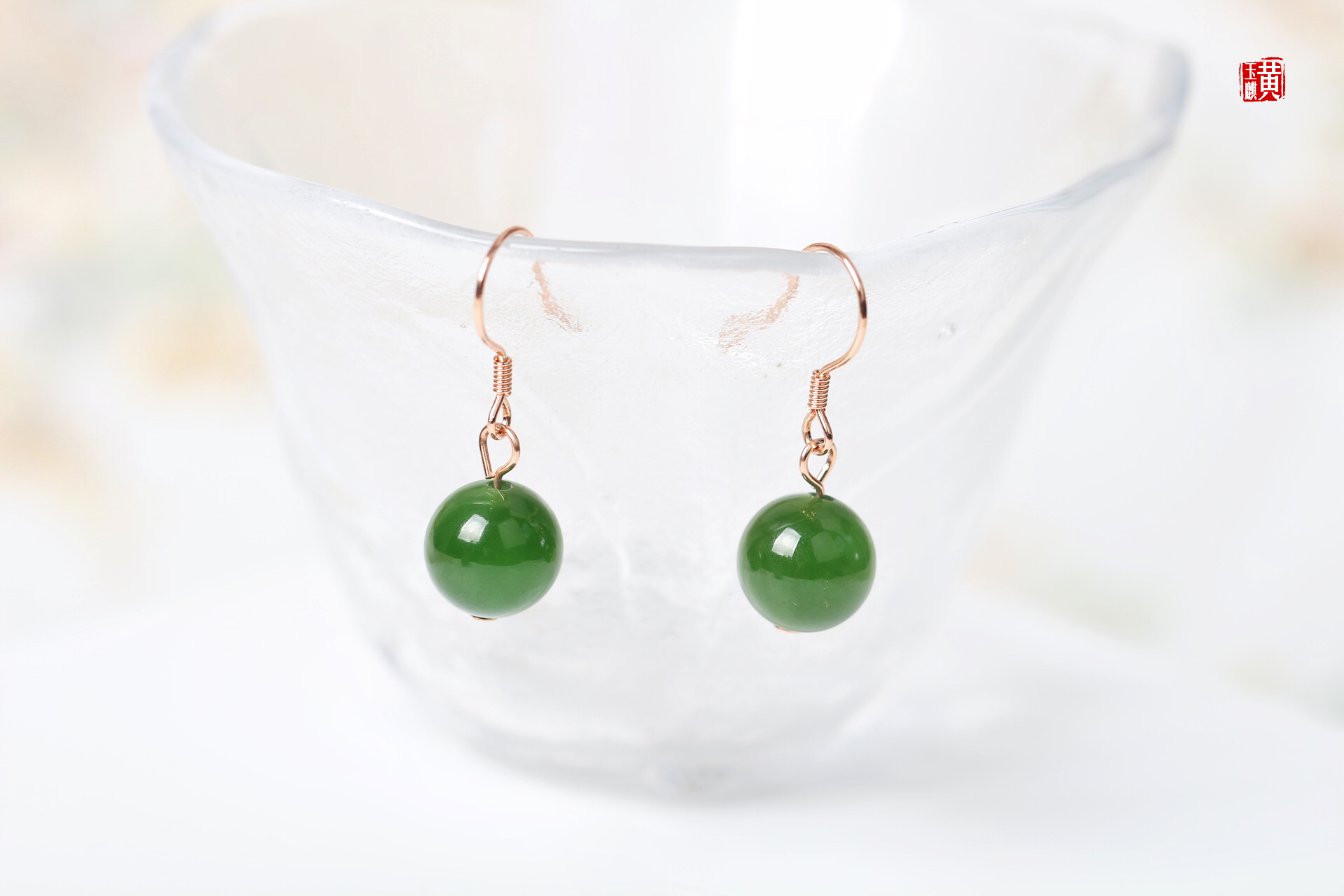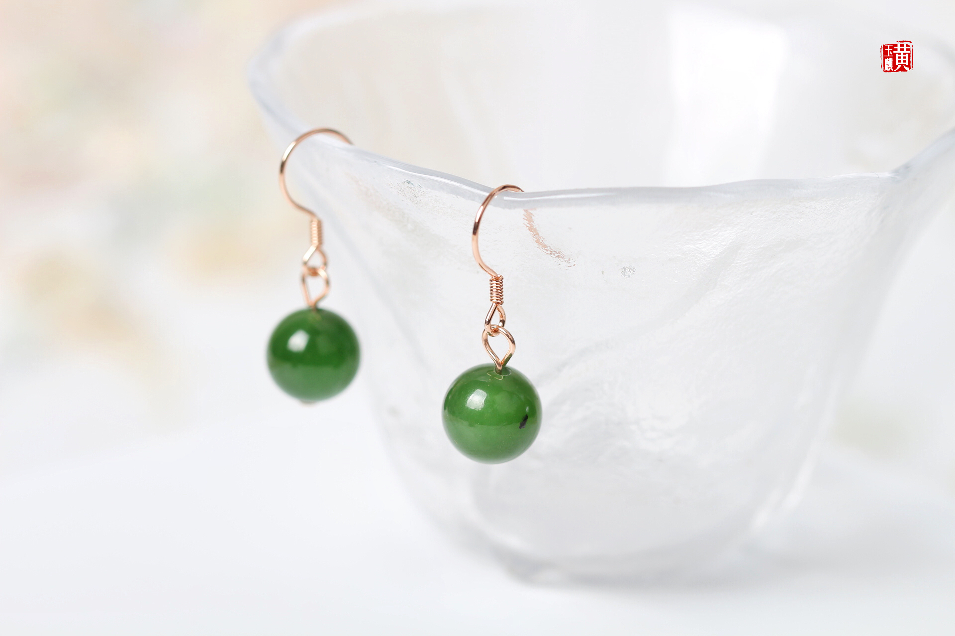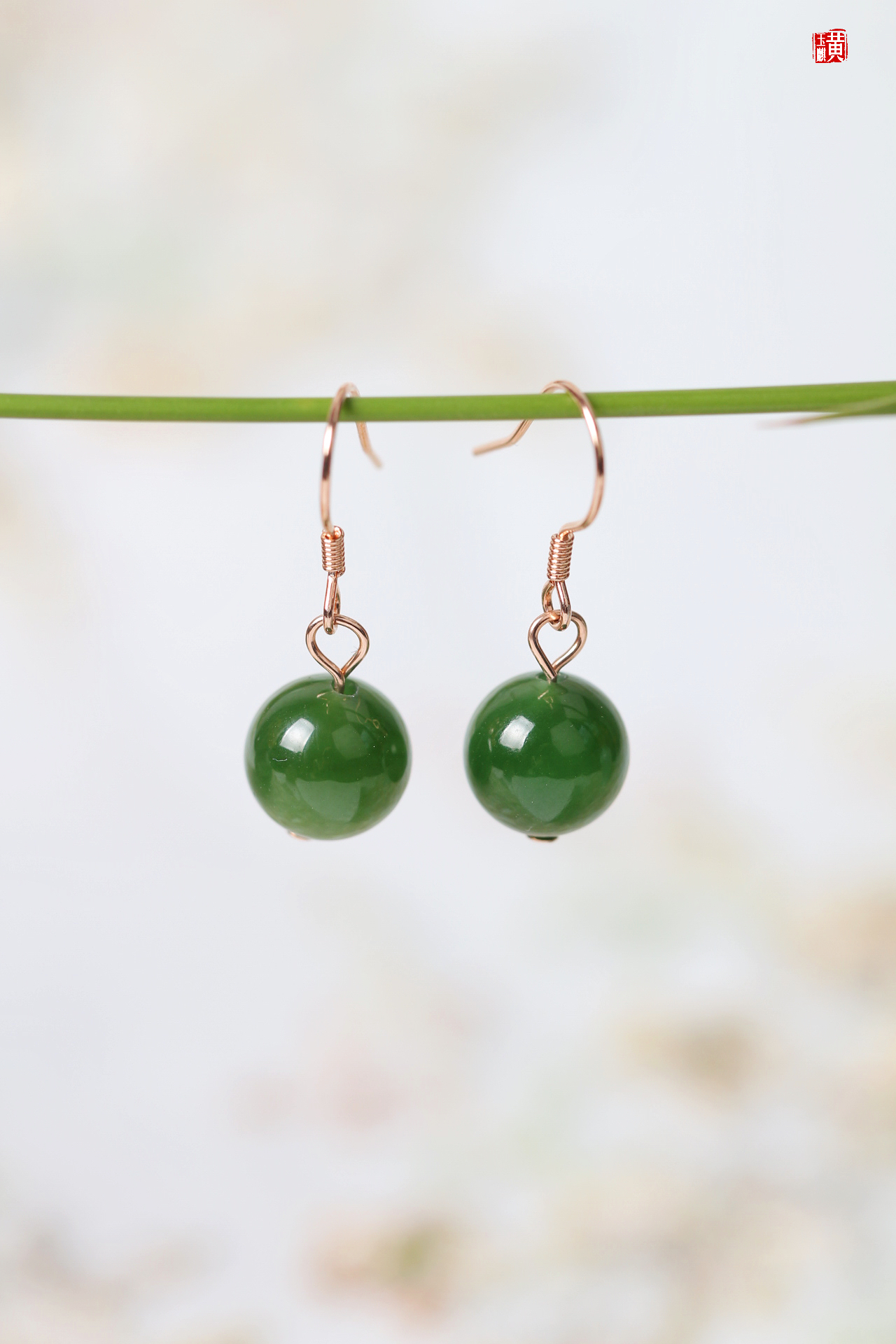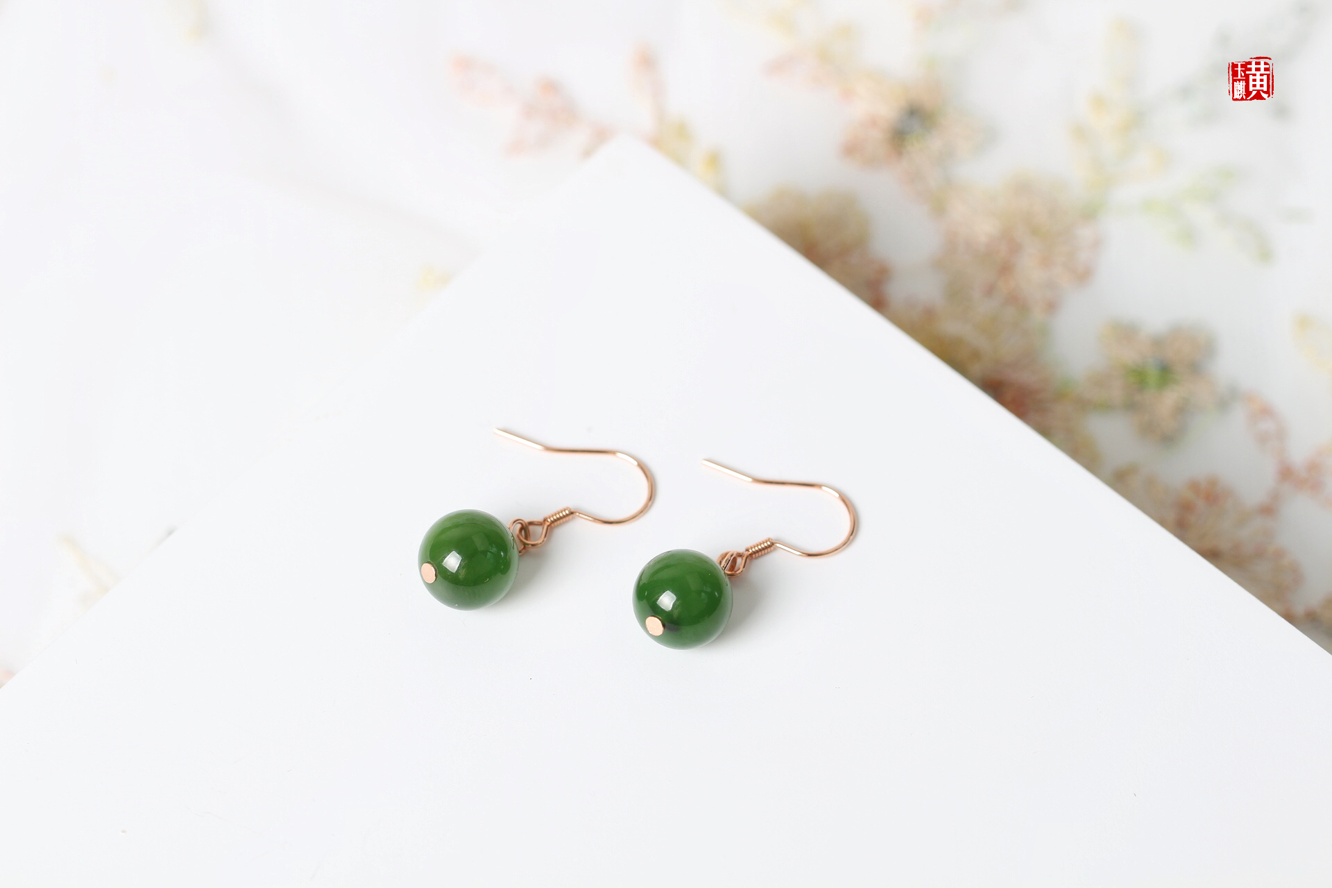 和田碧玉耳坠,玉质细腻,老坑菠菜绿,绿意盎然,富有活力,925银镶,精致优雅,摇曳生姿。
