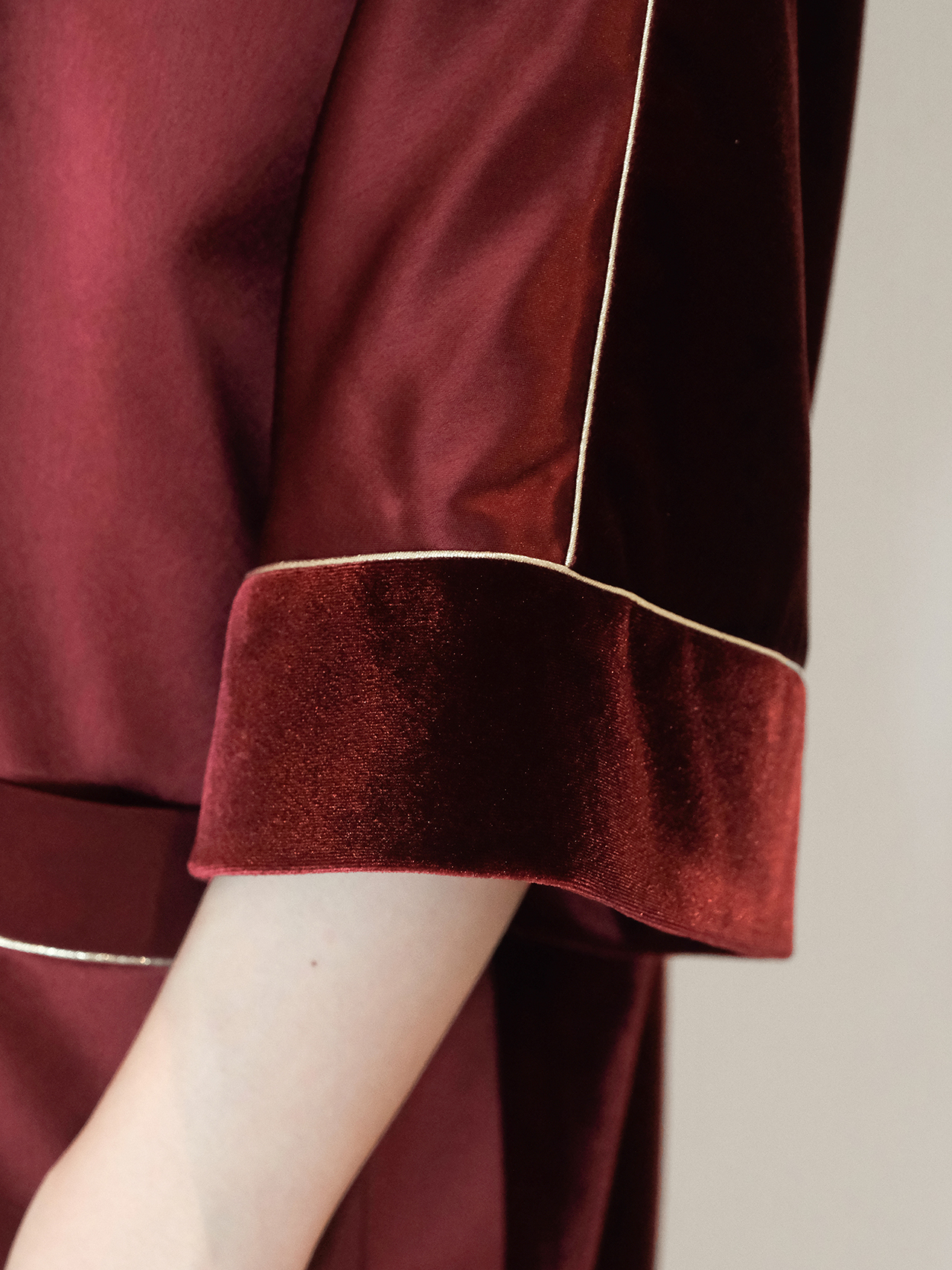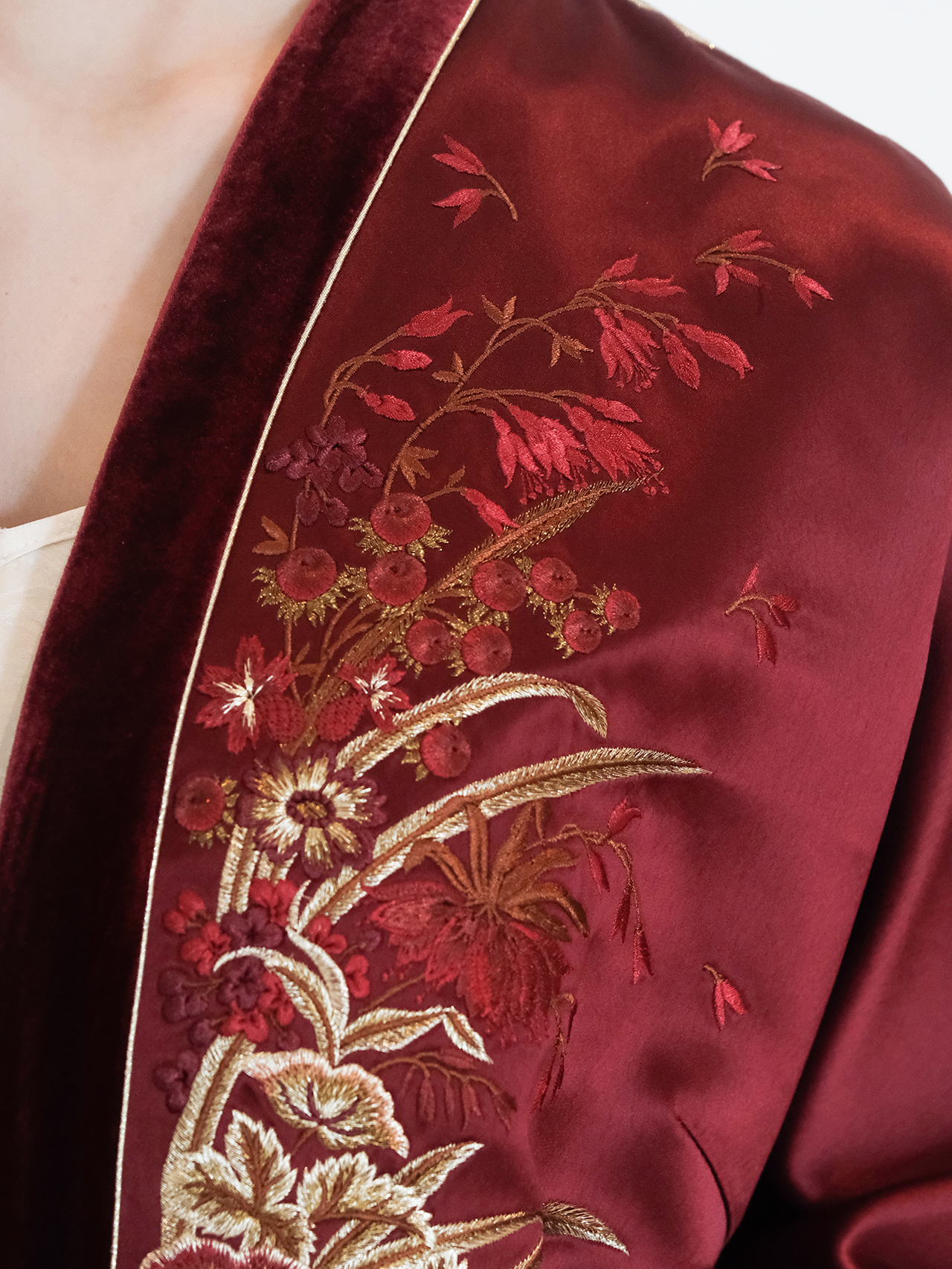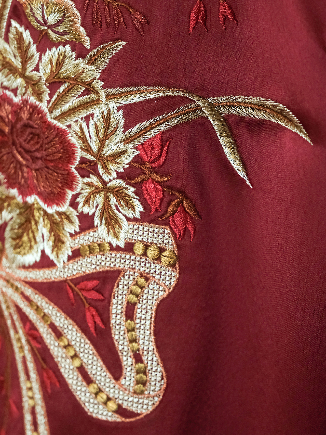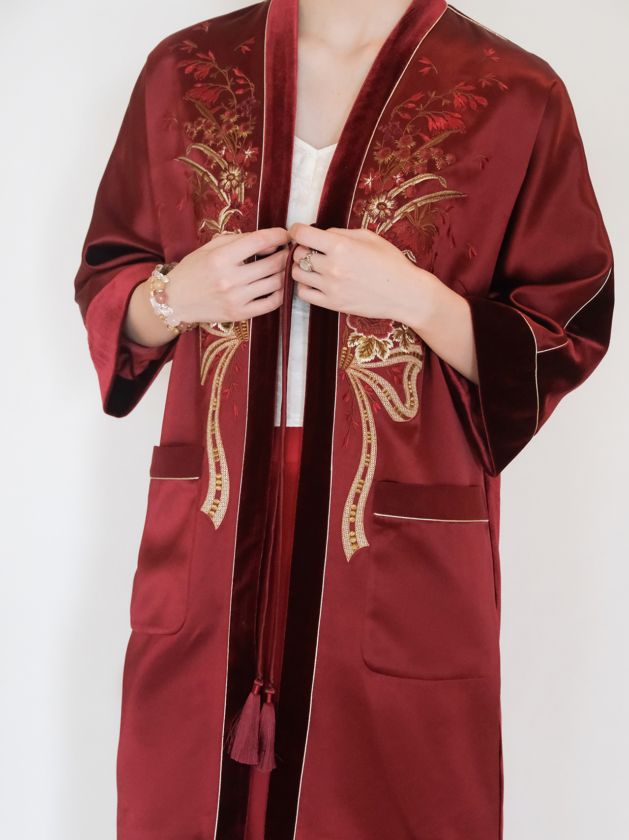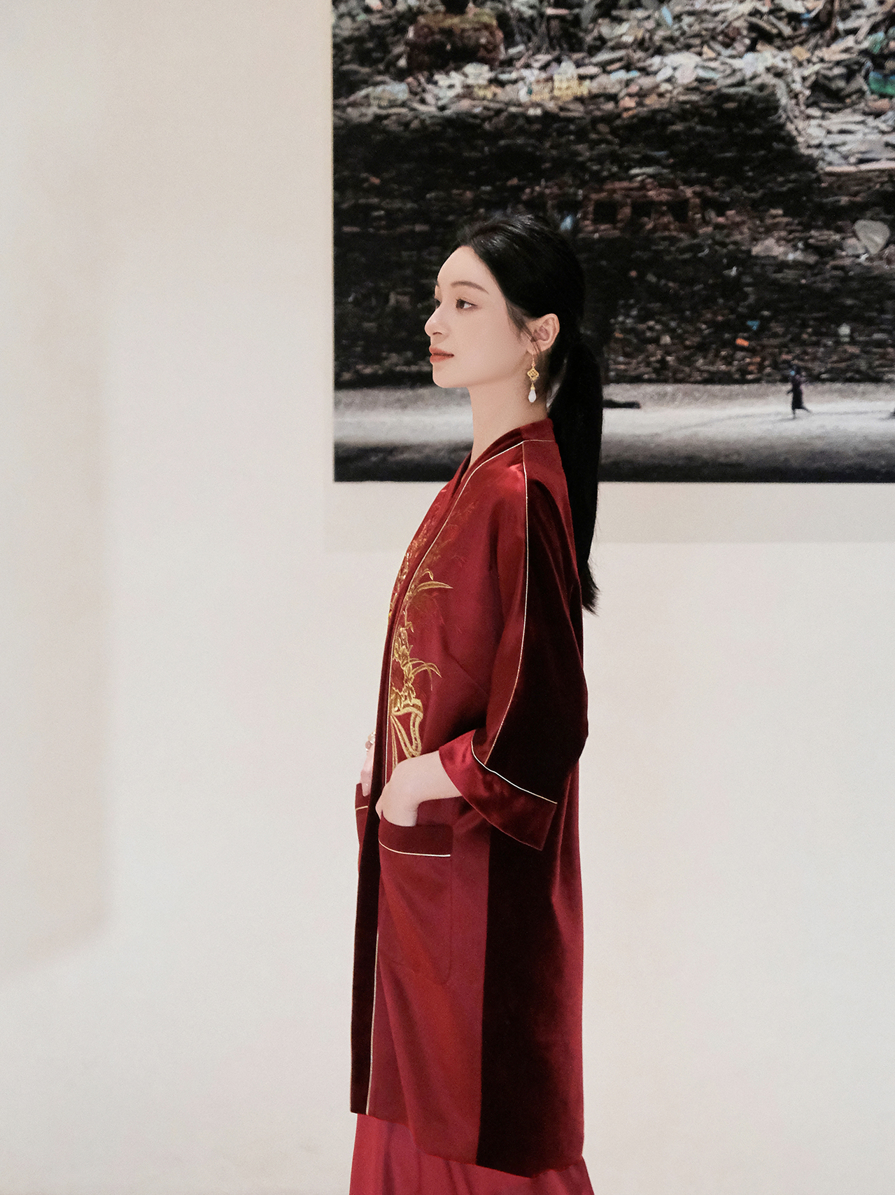 东方境X郭培| 花束刺绣拼丝绒长外套-红色