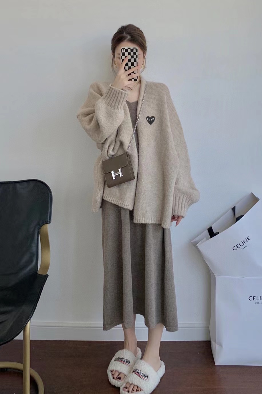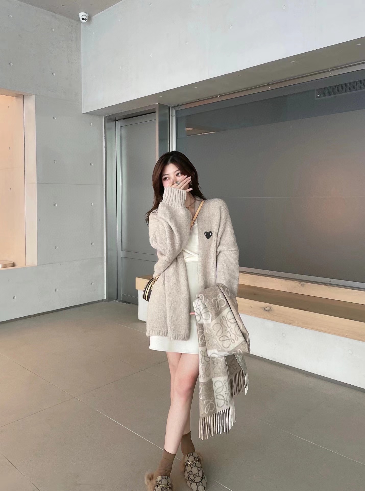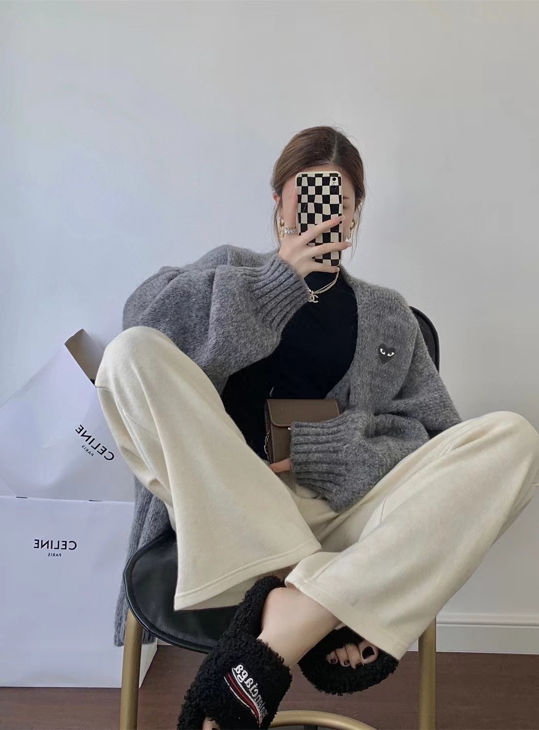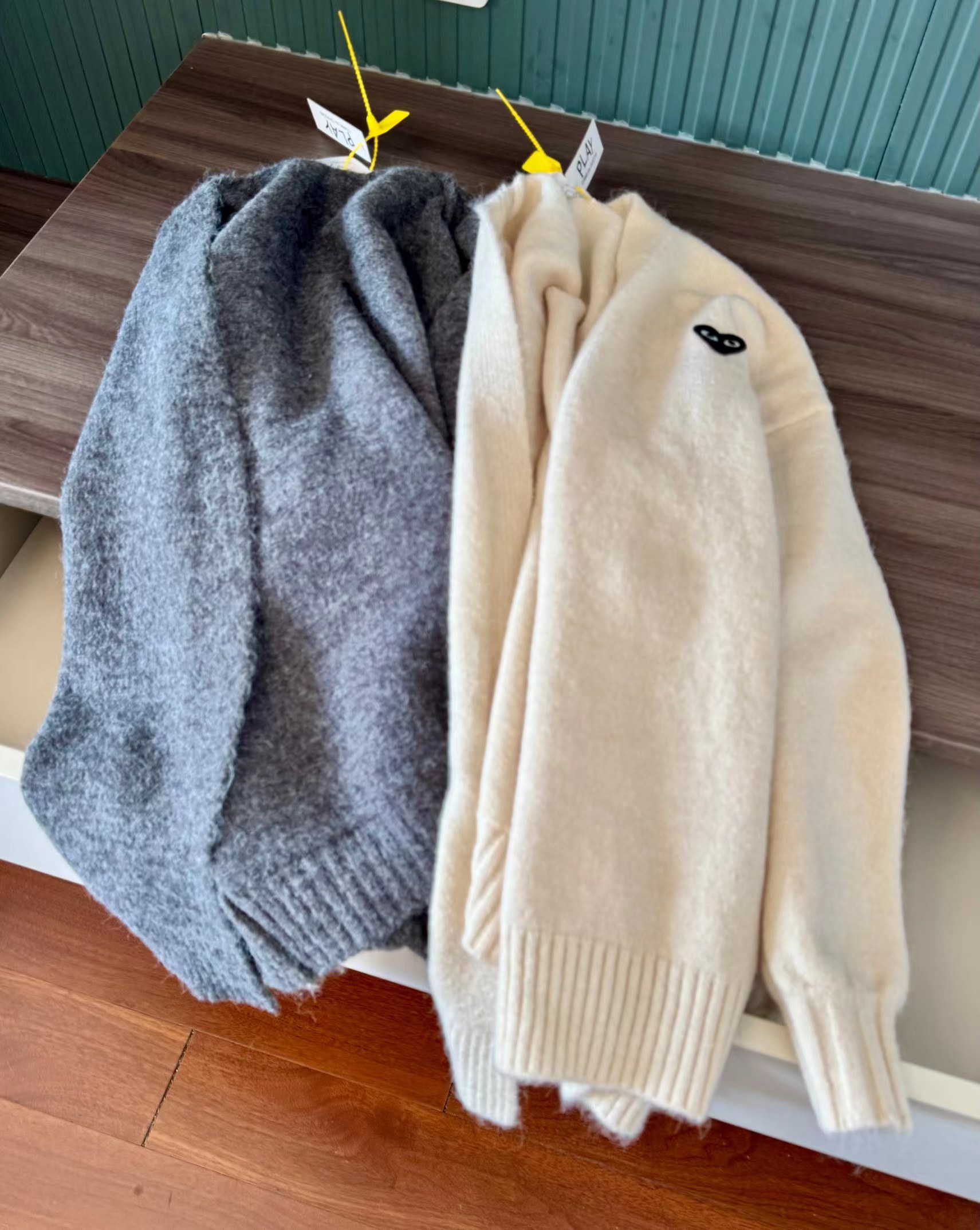 2025新款纯色开衫针织衫 千呼万唤始出来,上身版型绝了!!!简单的款反而是醉考验版型和材质的,版型很绝反正,大大的落肩袖恰到好处,整个上身被温暖拥抱的那种感觉,秋天裹进毛衣里!特种纱线自带的蓬松垂坠感,上身还是蛮骨感的,从侧边看不会像一些开衫那样很显厚,随便一裹很有感觉。肩部的拼接处有微微凸起的棱线感,蛮有味道的,整个就纸片人一样!袖口长螺纹收紧,实用保暖,光腿或者配裙子穿都很可,穿多年也不会过时的款。做了两个很糕级的颜色,奶茶驼就是很气质一个配色,灰色就比较高级,从版型到颜色都很优秀的一个款,主要看纱线,没有女生可以拒绝这种毛绒感 三标齐全 推荐情侣款