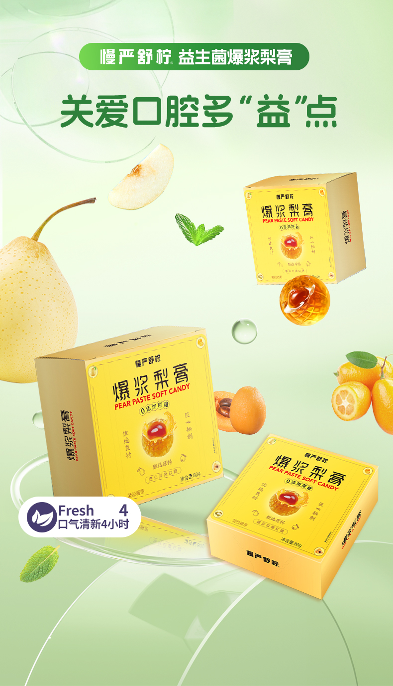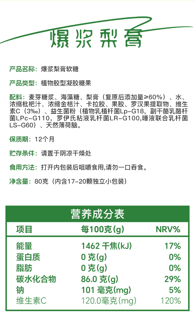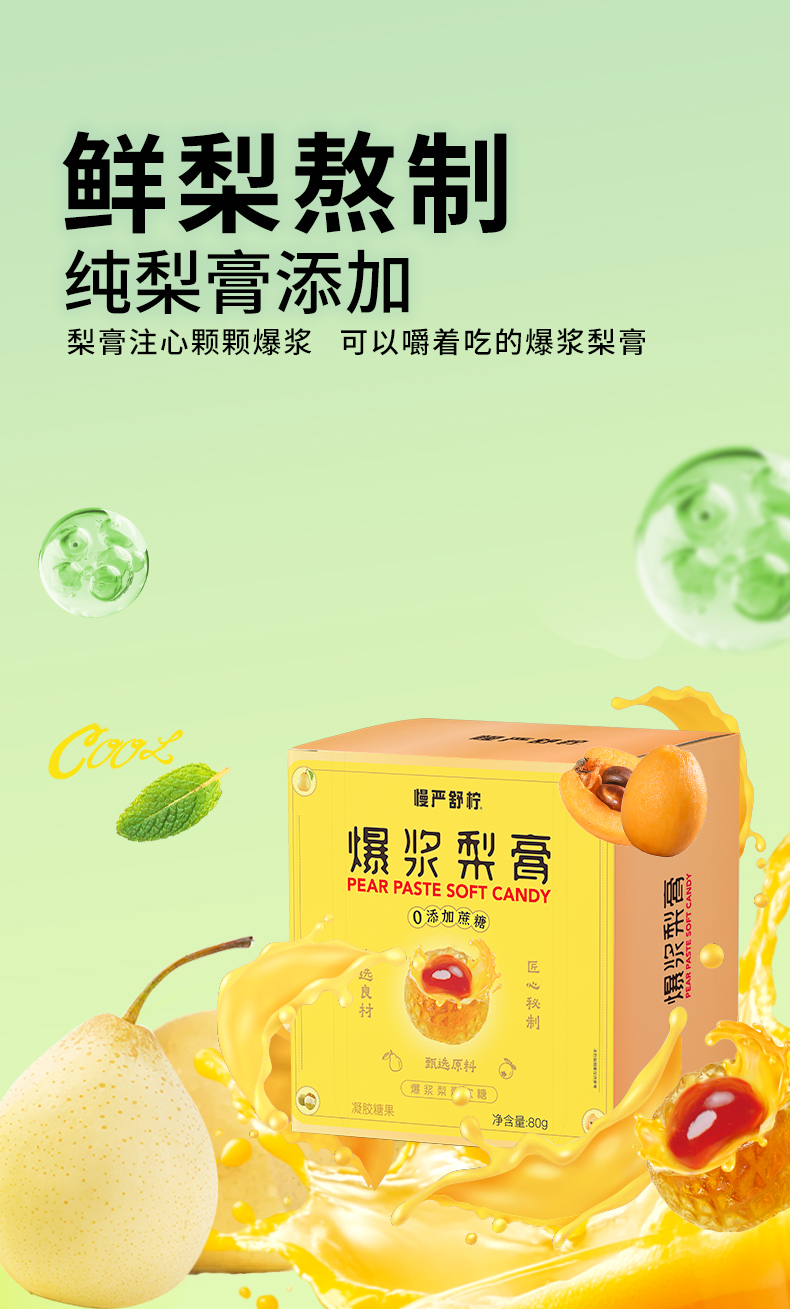 【Q弹清润,1粒等于1个莱阳梨】慢严舒柠无蔗糖益生菌爆浆梨膏软糖80g/包