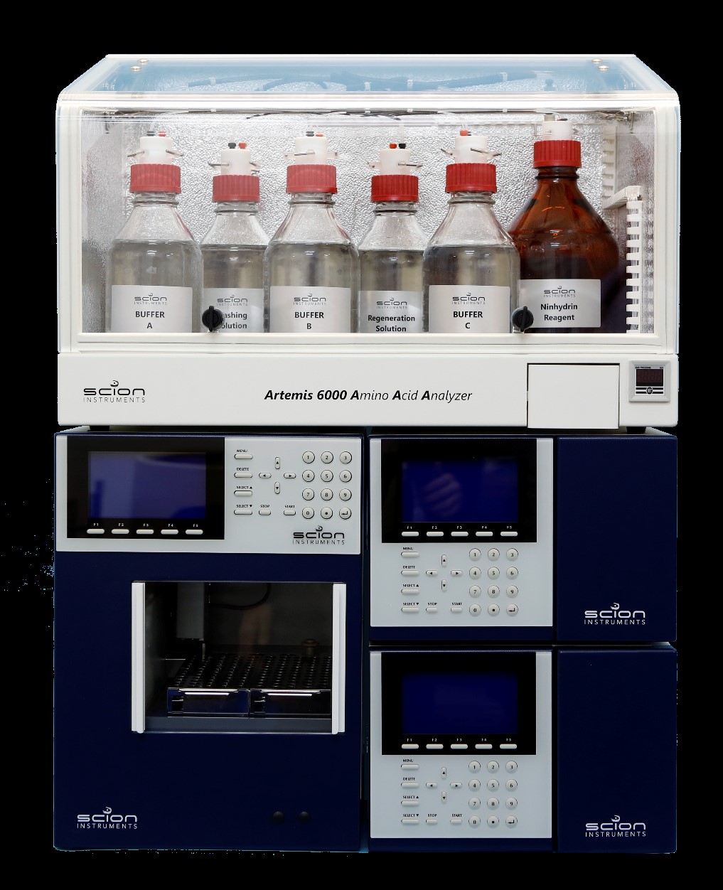 天美全新推出赛里安Artemis 6000 全自动氨基酸分析仪,它利用经典的符合国家标准和国际仲裁标准的茚三酮柱后衍生法来分析水解产物和游离氨基酸。在传统的高效液相离子交换色谱的基础上,采用更高精度输液泵系统搭配更优化的分离条件,仅使用2 种缓冲液即可完成蛋白水解体系的分离(生理体液体系为3 种),对比传统使用4~5 种缓冲液的方法,有效地提高了分析效率,减少了使用成本。