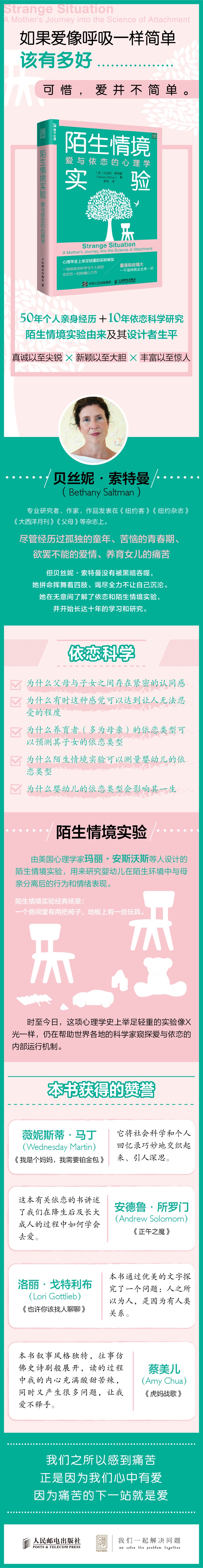 《陌生情境实验:爱与依恋的心理学》作者贝丝妮· 索特曼在生下女儿后,深深地爱着女儿,但她感到自己有些不对劲儿。回顾童年的孤独经历、青春期的放纵行为以及刚刚步入成年期后对爱的沉溺,索特曼认为,也许自己早年经历了创伤,心早已破碎了。