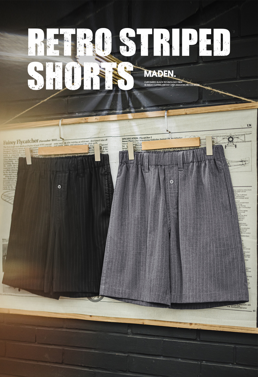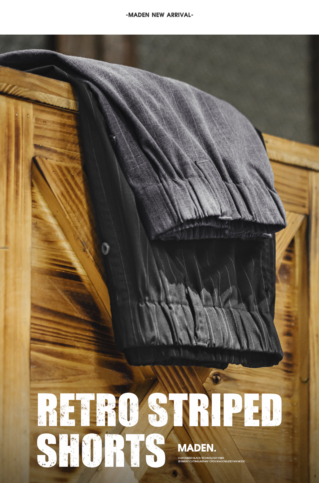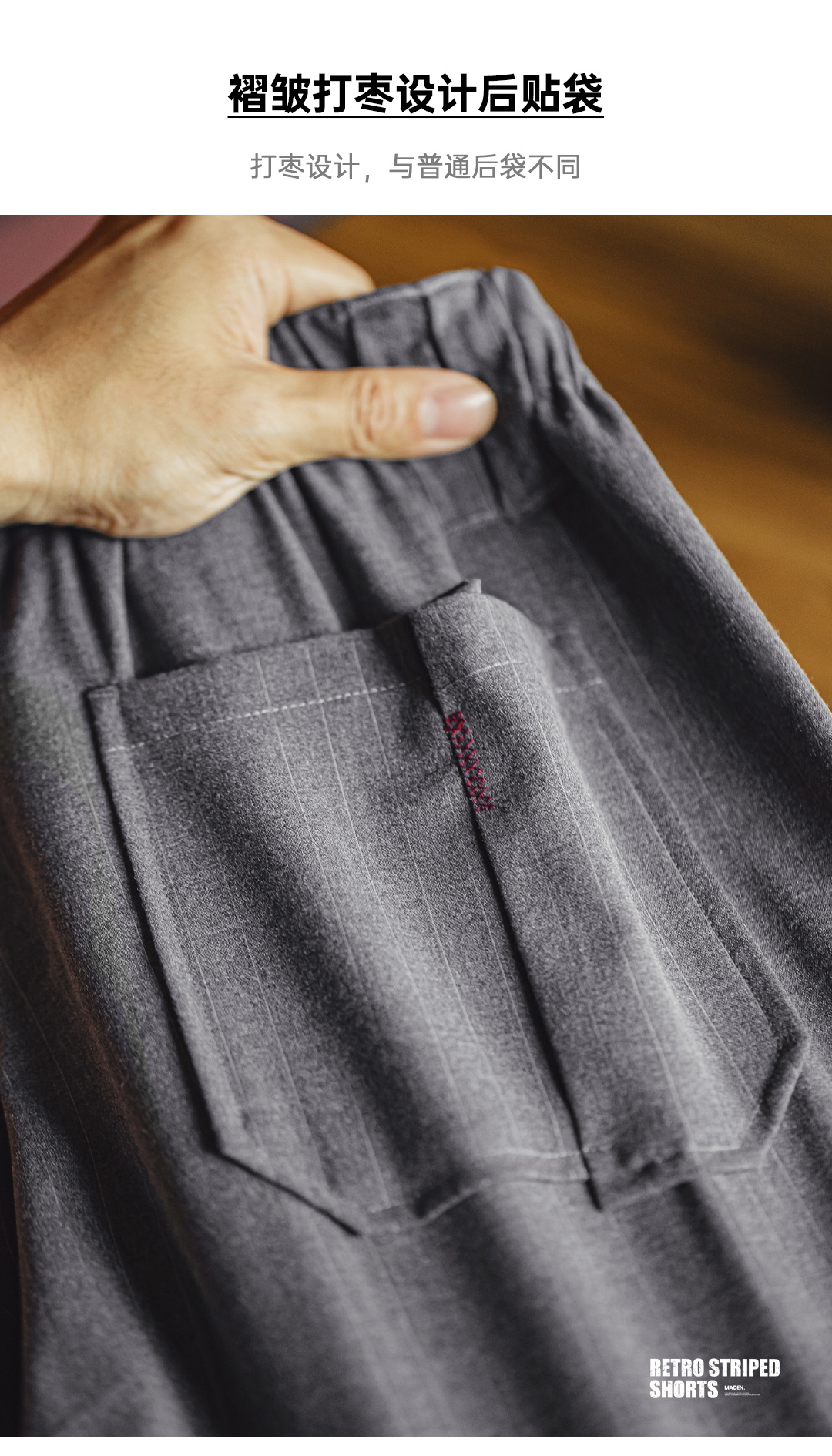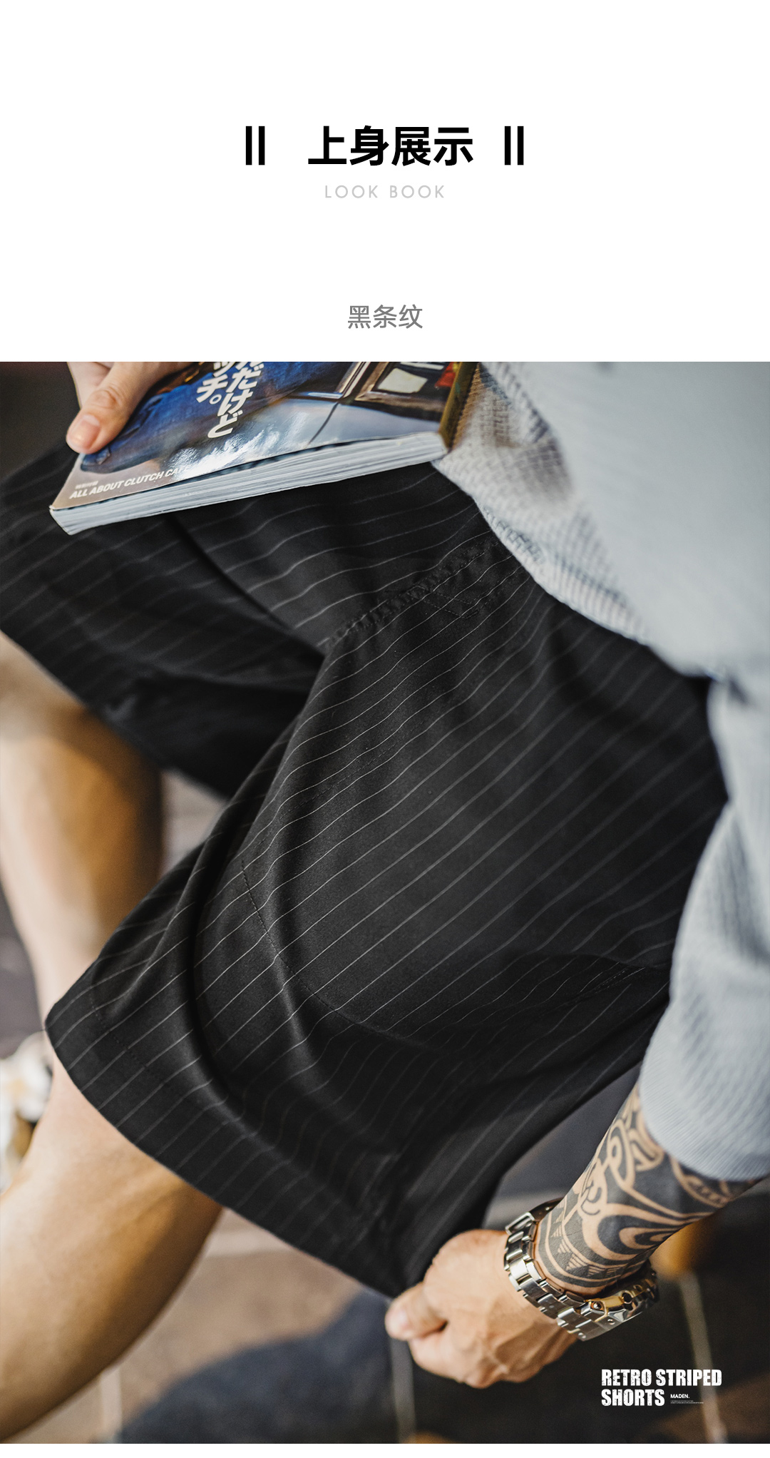 马登工装日系竖条纹灰色西装短裤cityboy松紧腰直筒五分裤男夏季