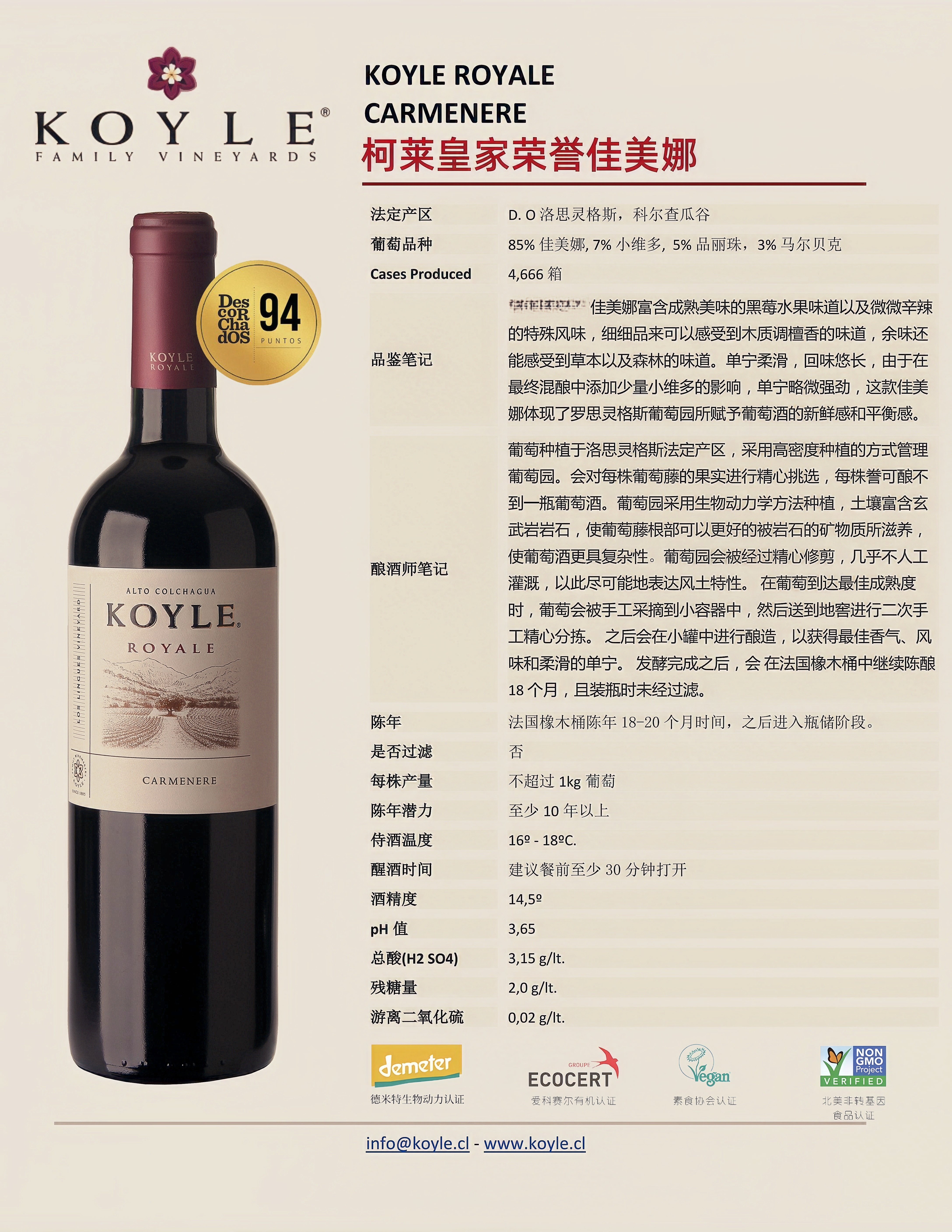 柯莱紫木兰皇家佳美娜⼲红葡萄酒