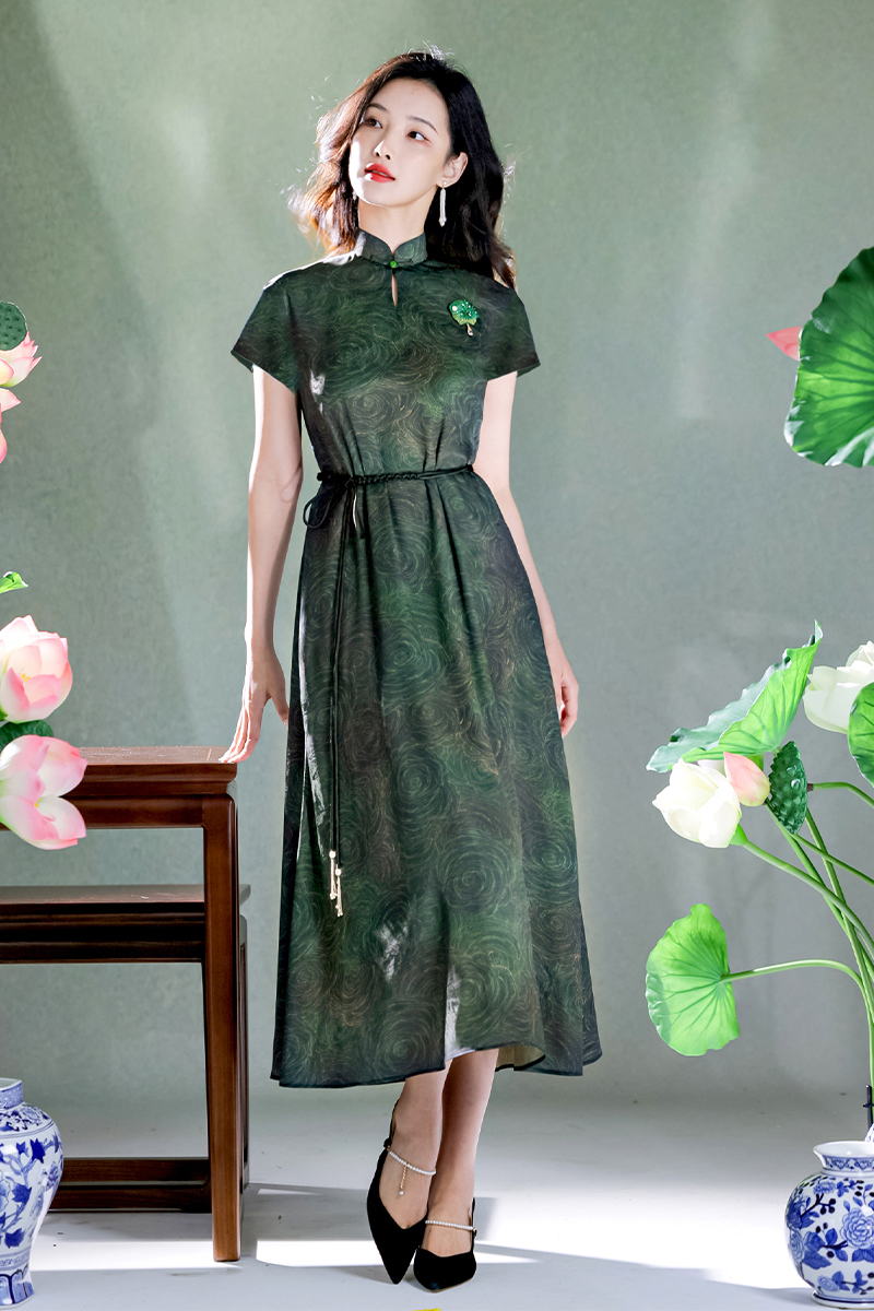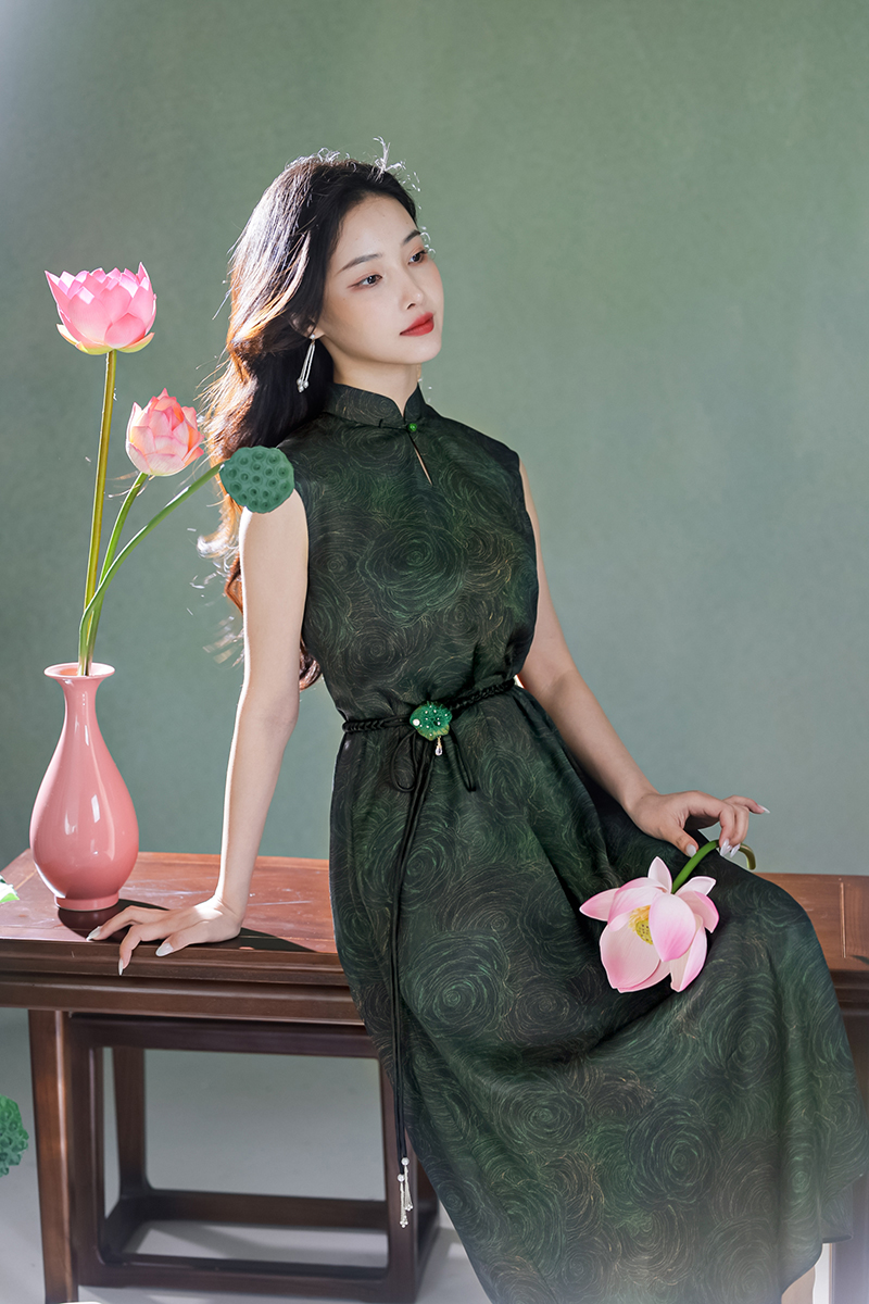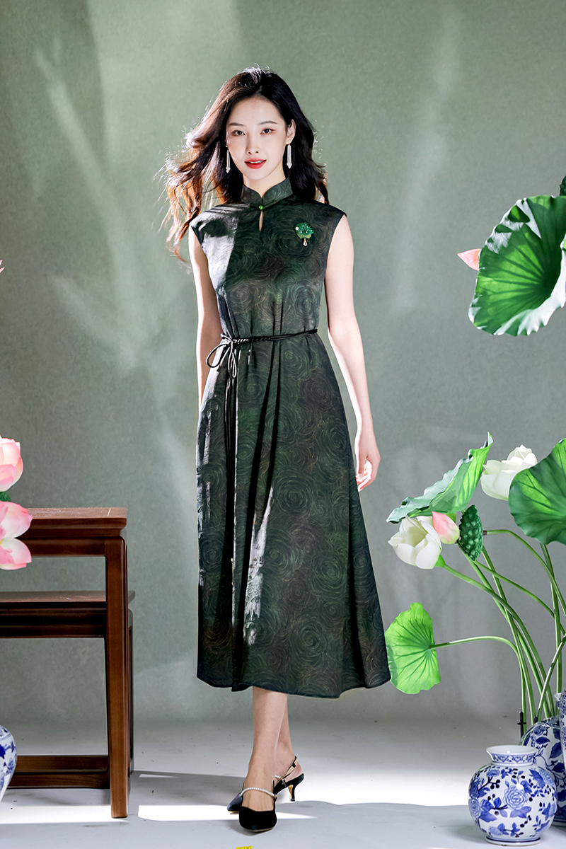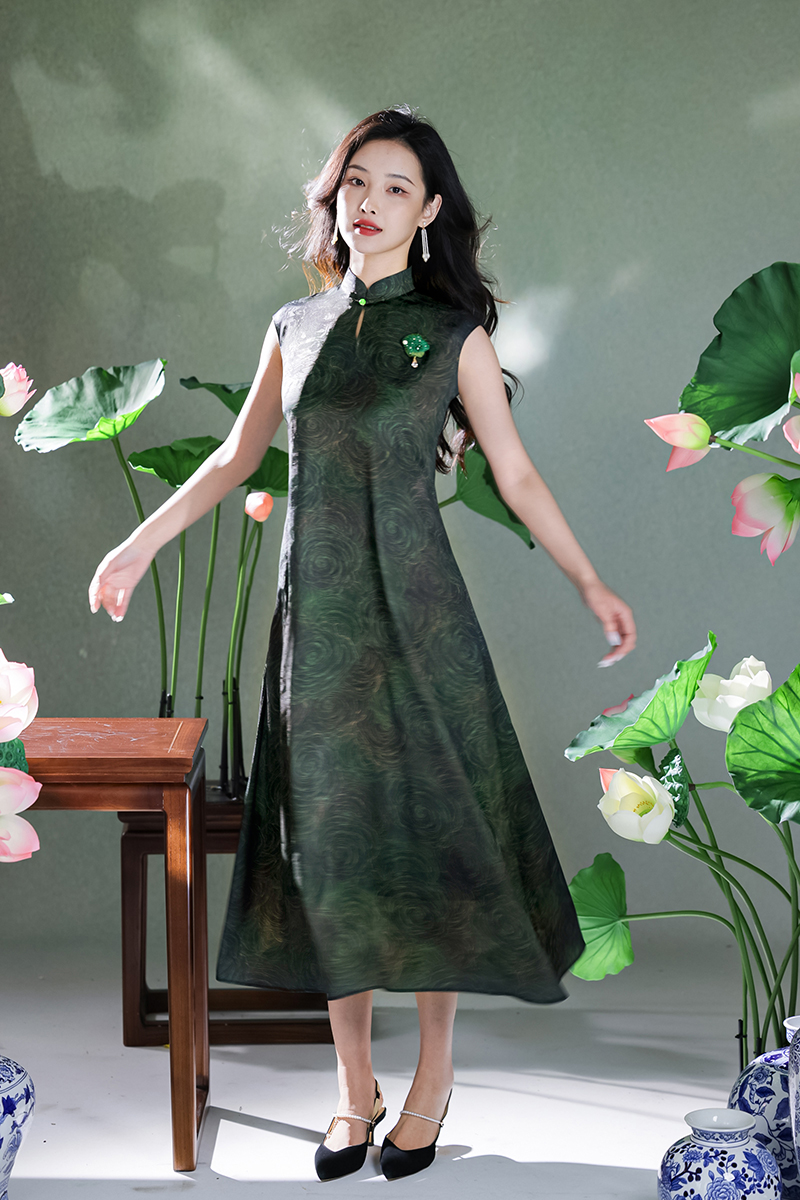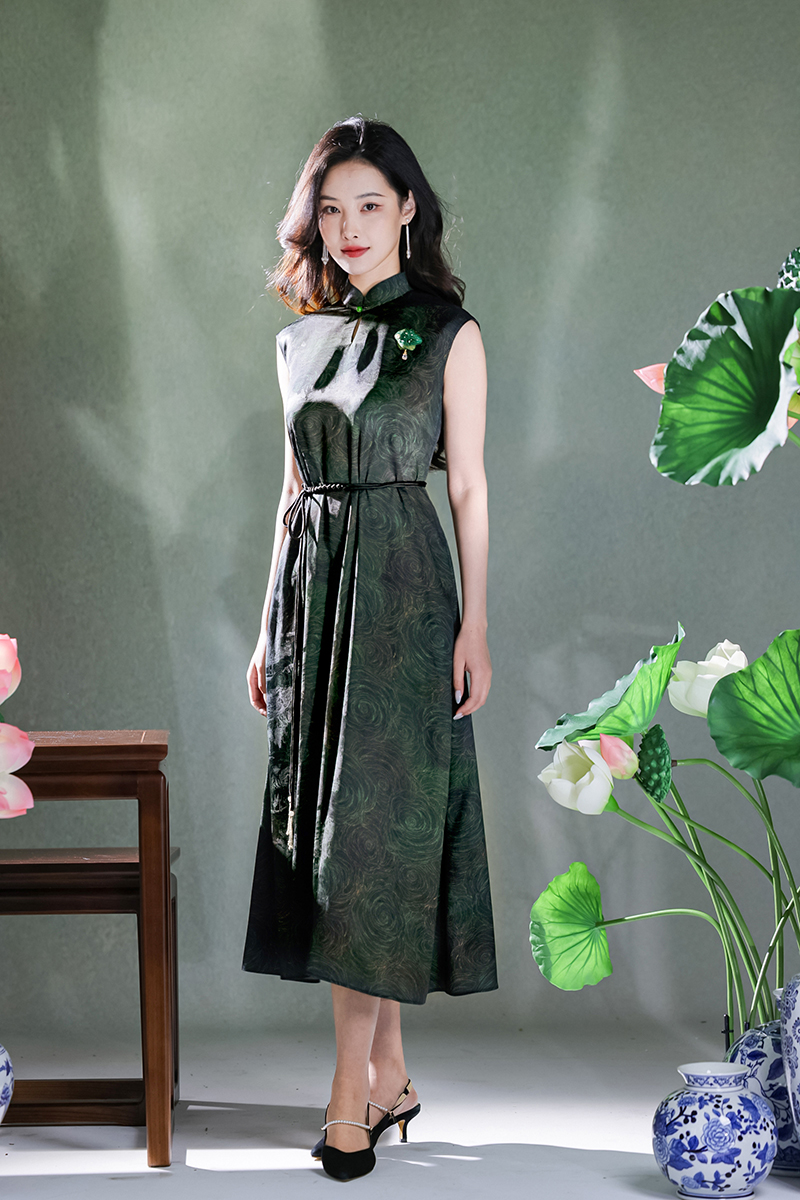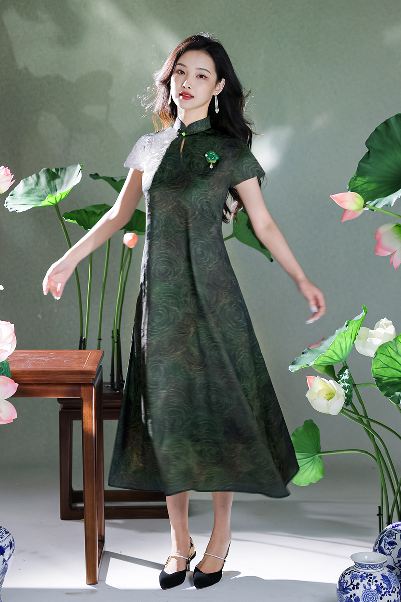 灵感源自江南水乡的朦胧诗意,以深绿与浅绿交织的玫瑰提花为魂,像烟雨中摇曳的荷塘月色...~