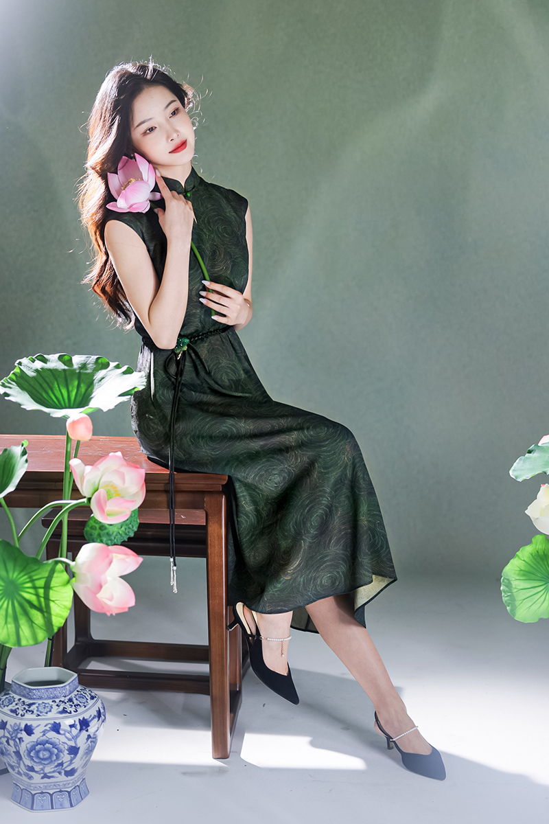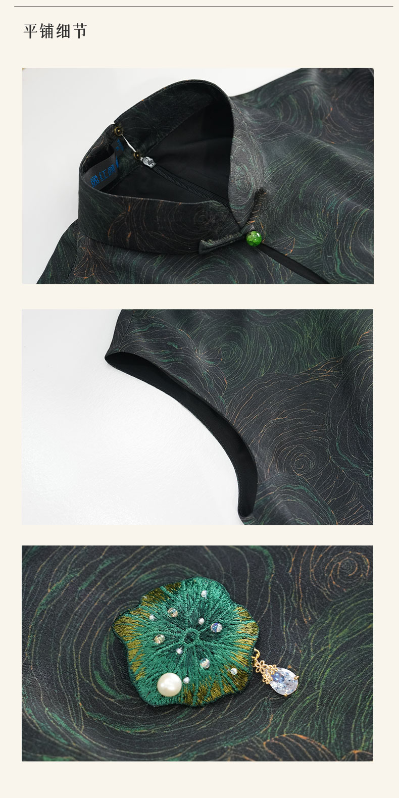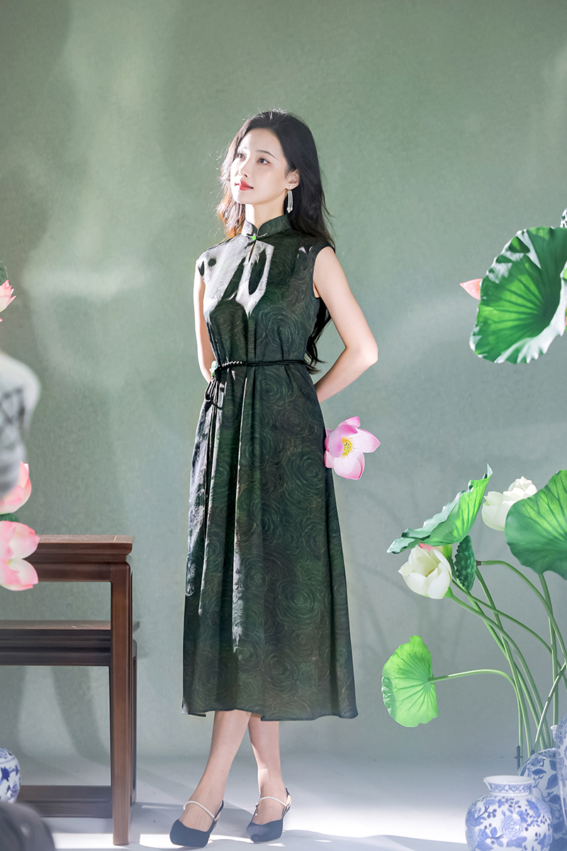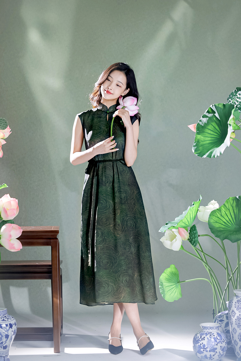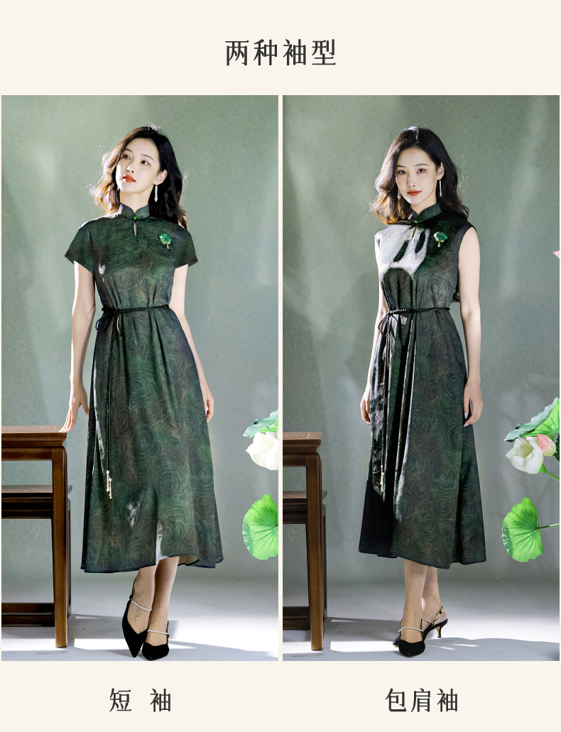 灵感源自江南水乡的朦胧诗意,以深绿与浅绿交织的玫瑰提花为魂,像烟雨中摇曳的荷塘月色...~